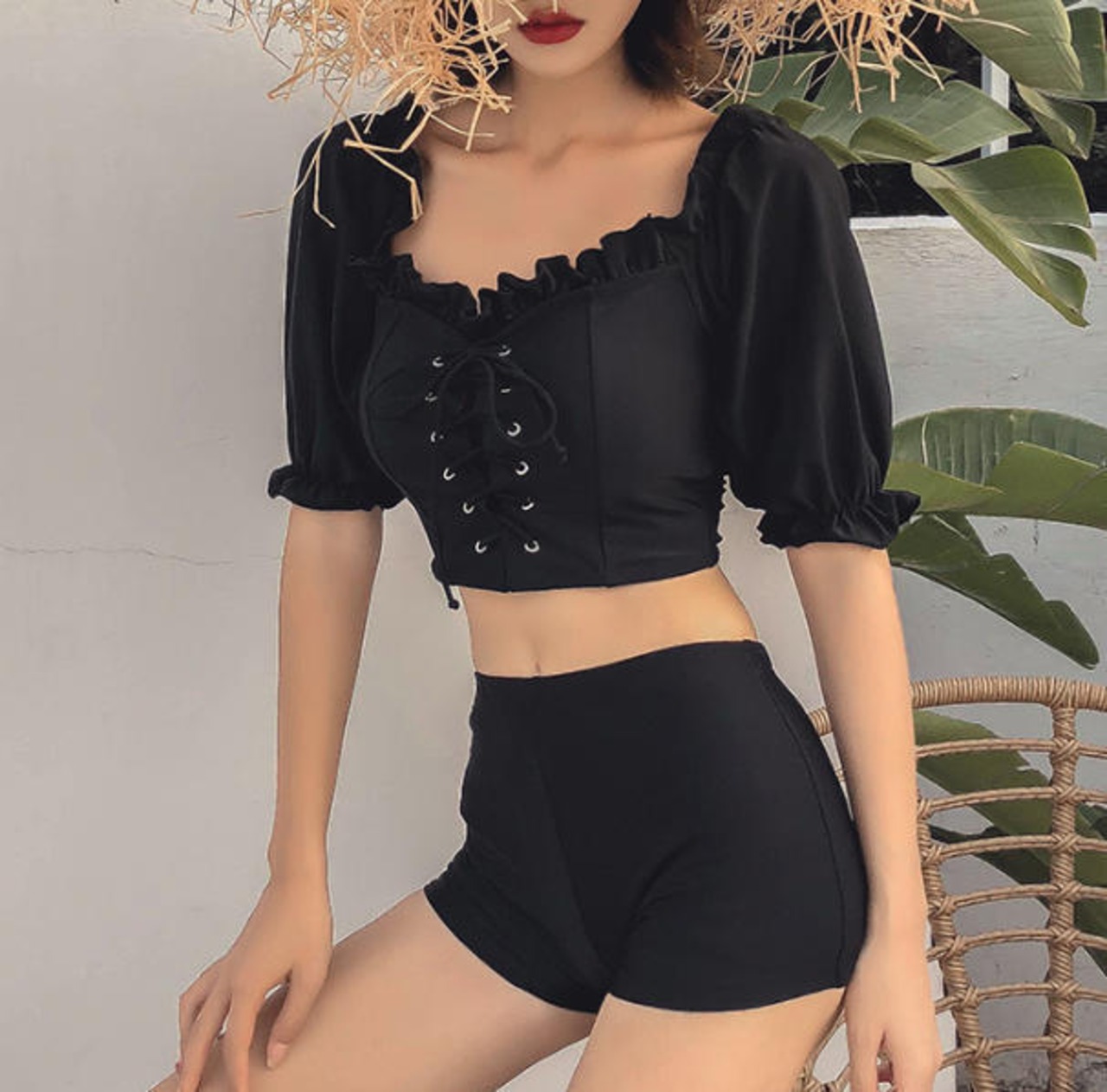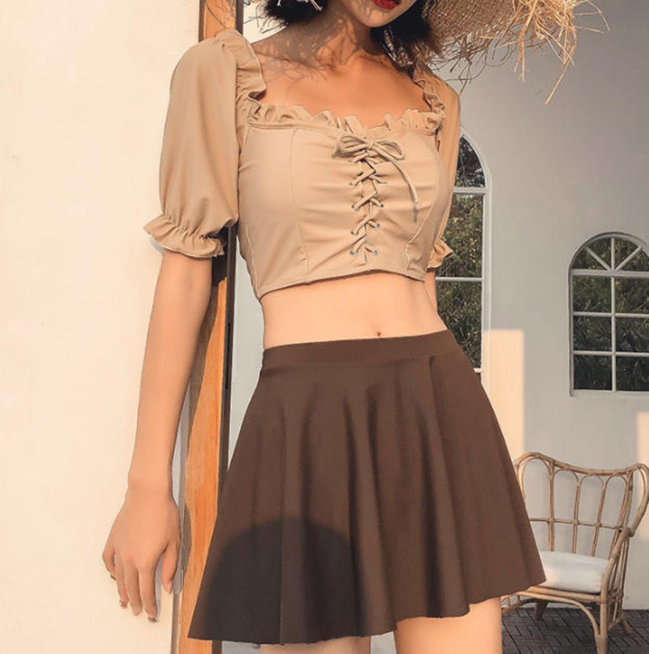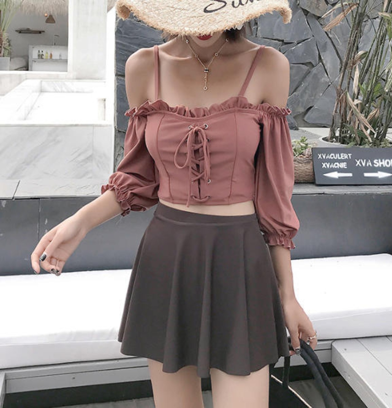 オフショルダー 水着 ビキニ ハイウエスト スカート レースアップ 可愛い