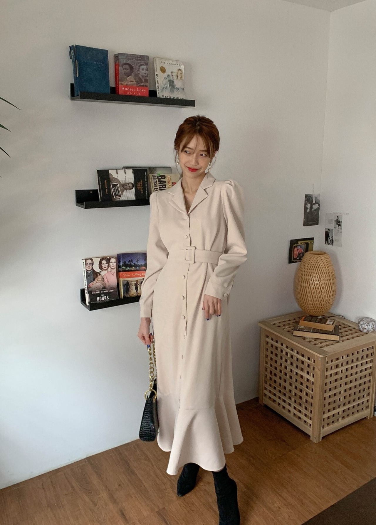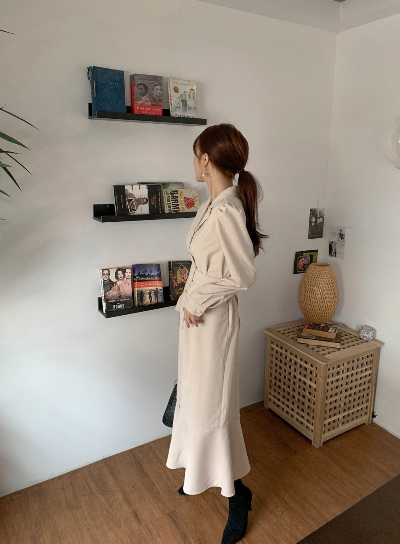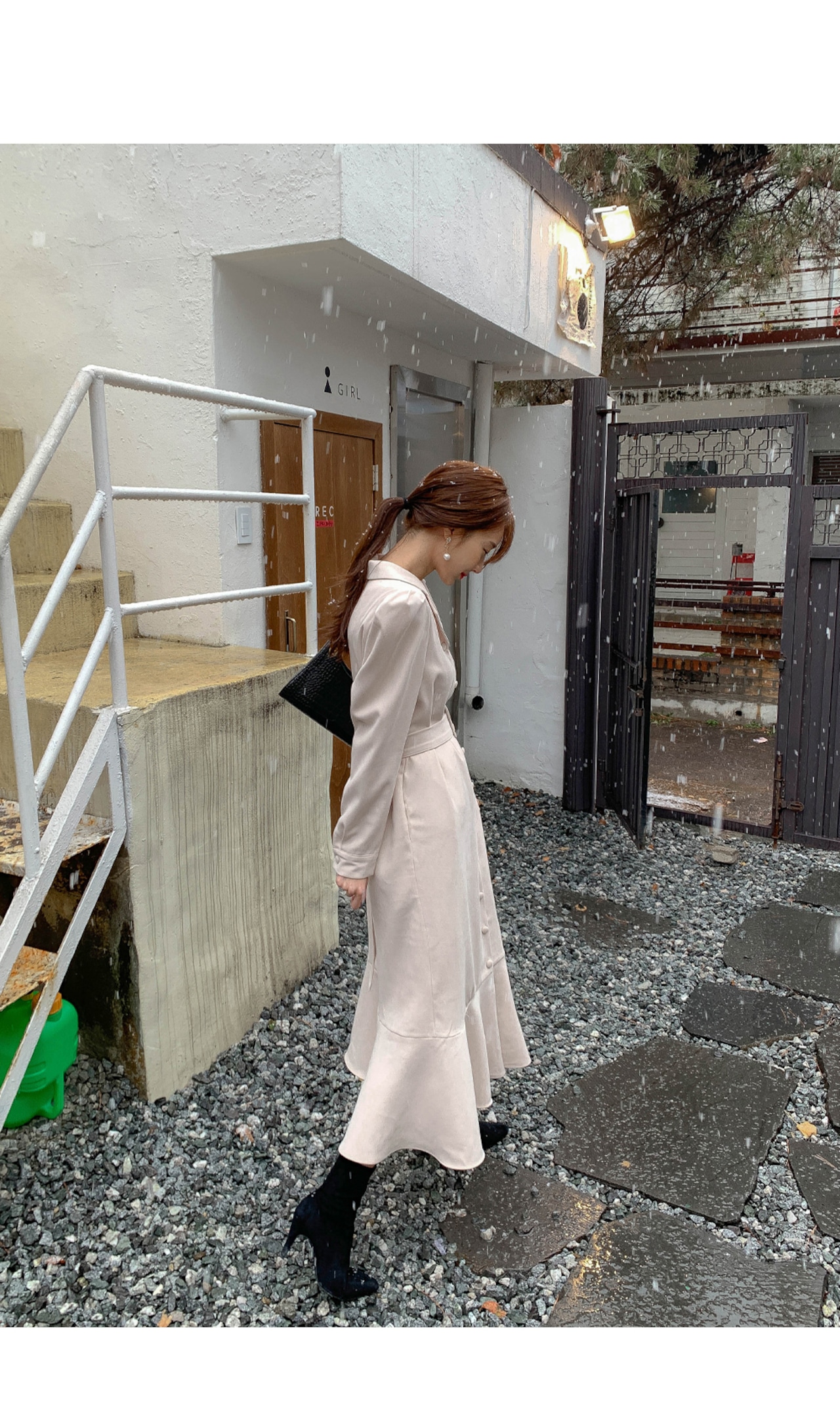 ワンピース シャツワンピ ロング丈 Vネック 長袖 タイト ベーシック Iライン ウエストマーク 大人可愛い きれいめ カジュアル お洒落 こなれ感 ベージュ