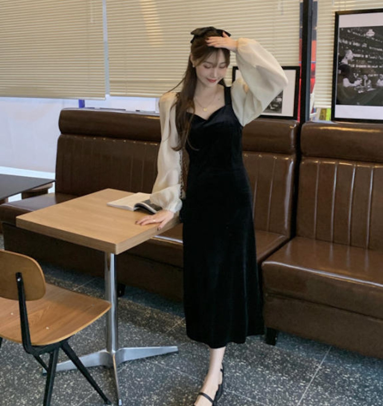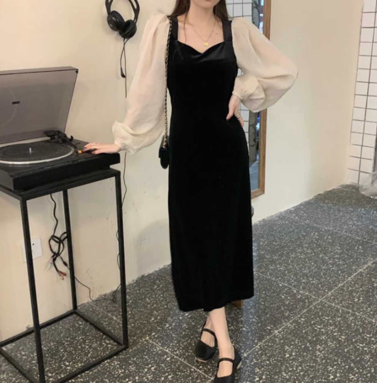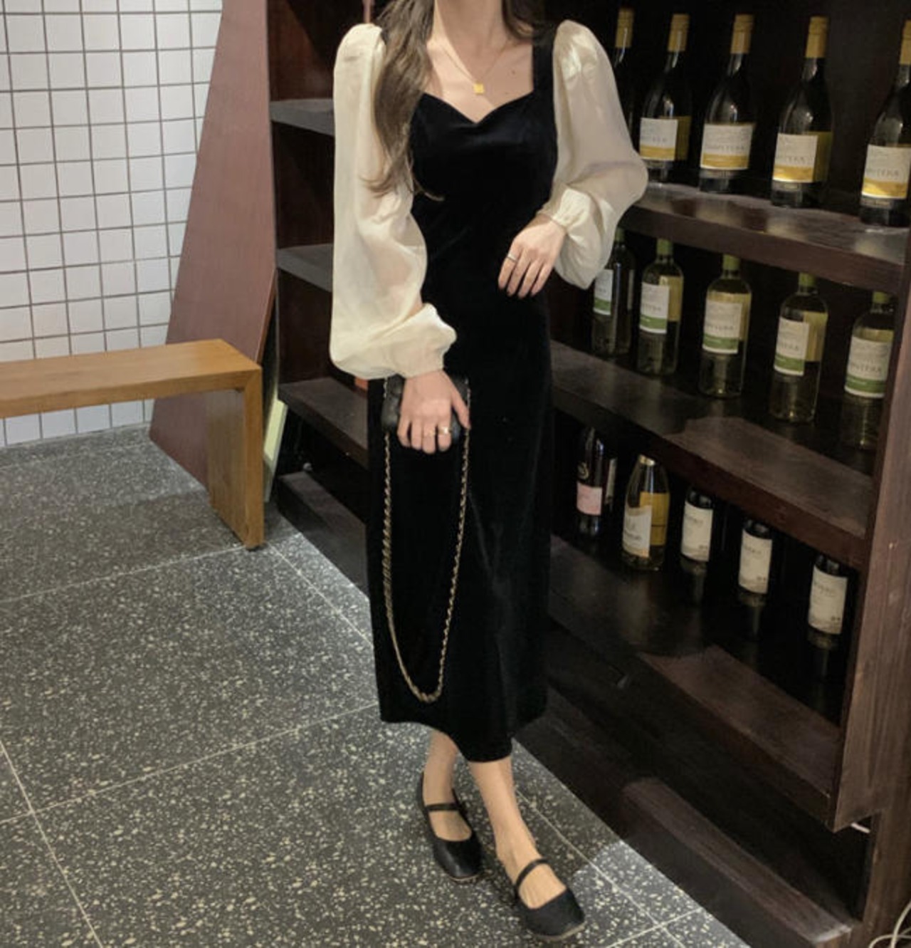 ドッキングワンピース ロング フレア パフスリーブ レトロ フェミニン 大人可愛い 長袖