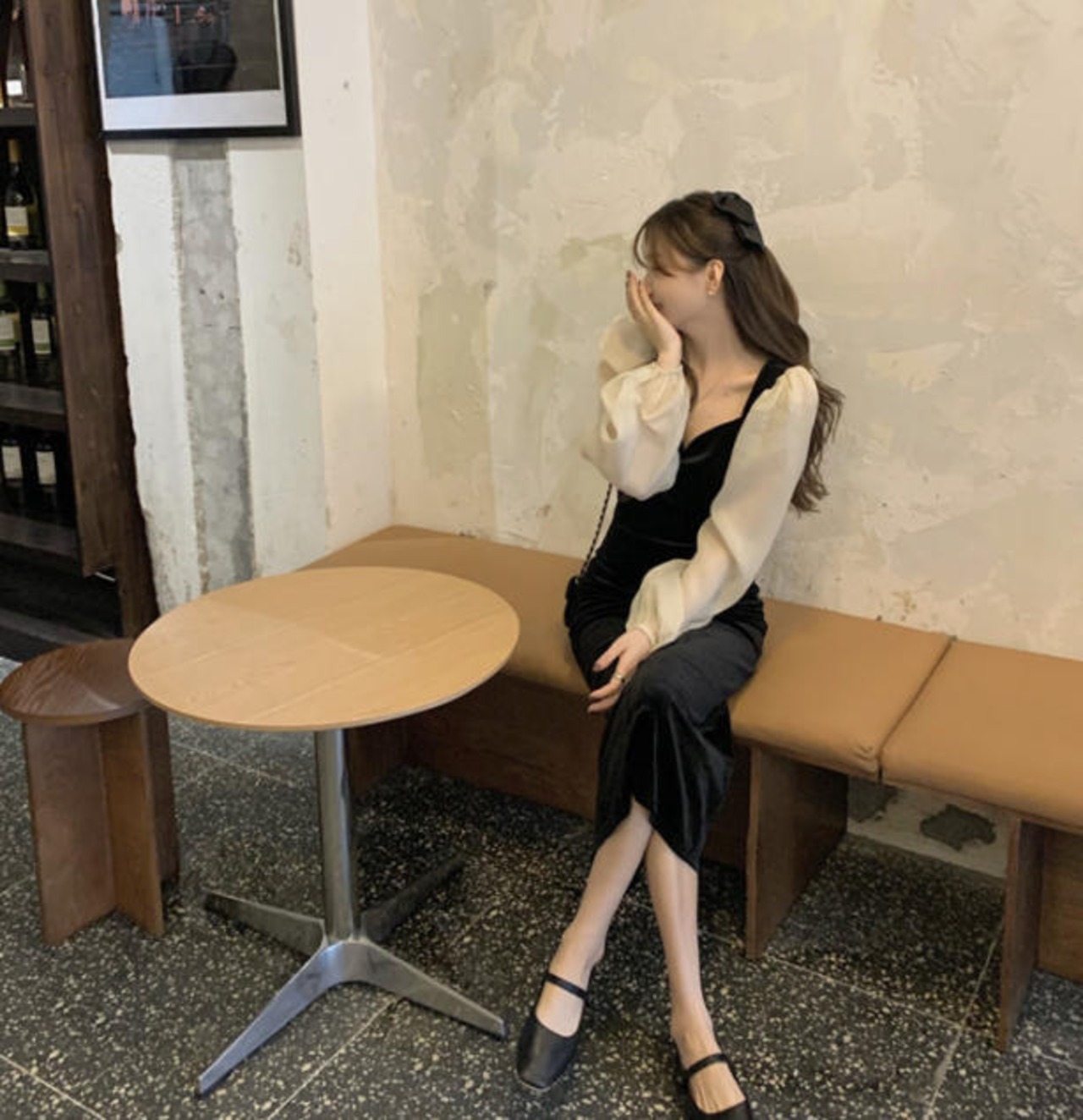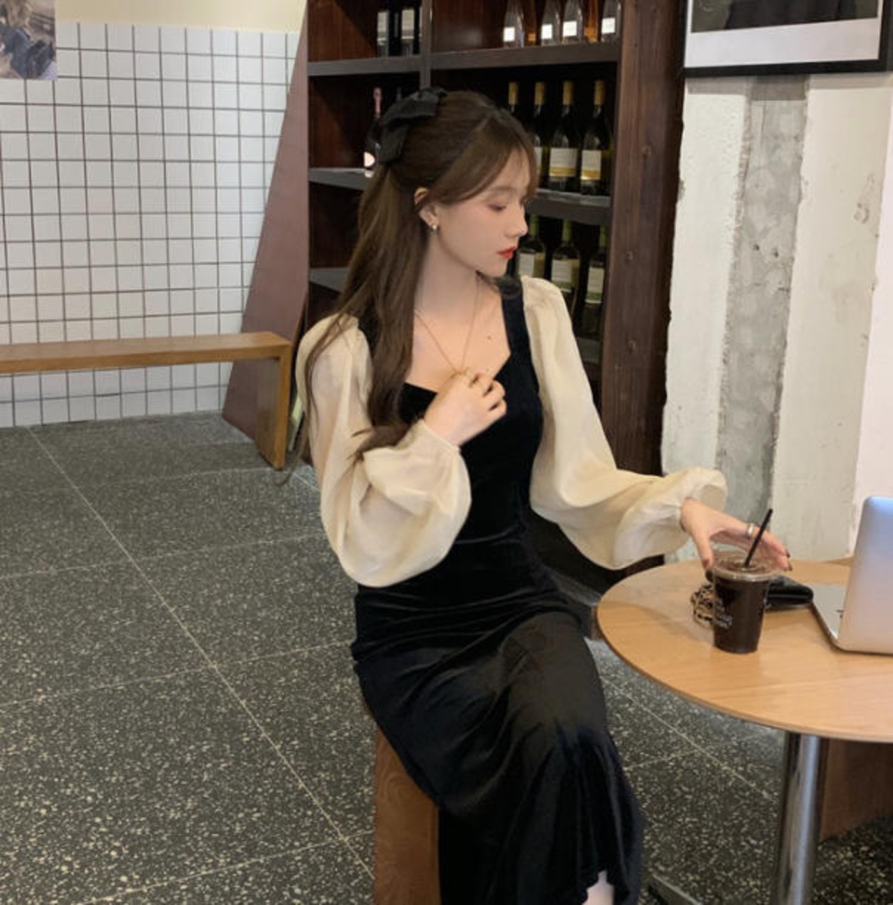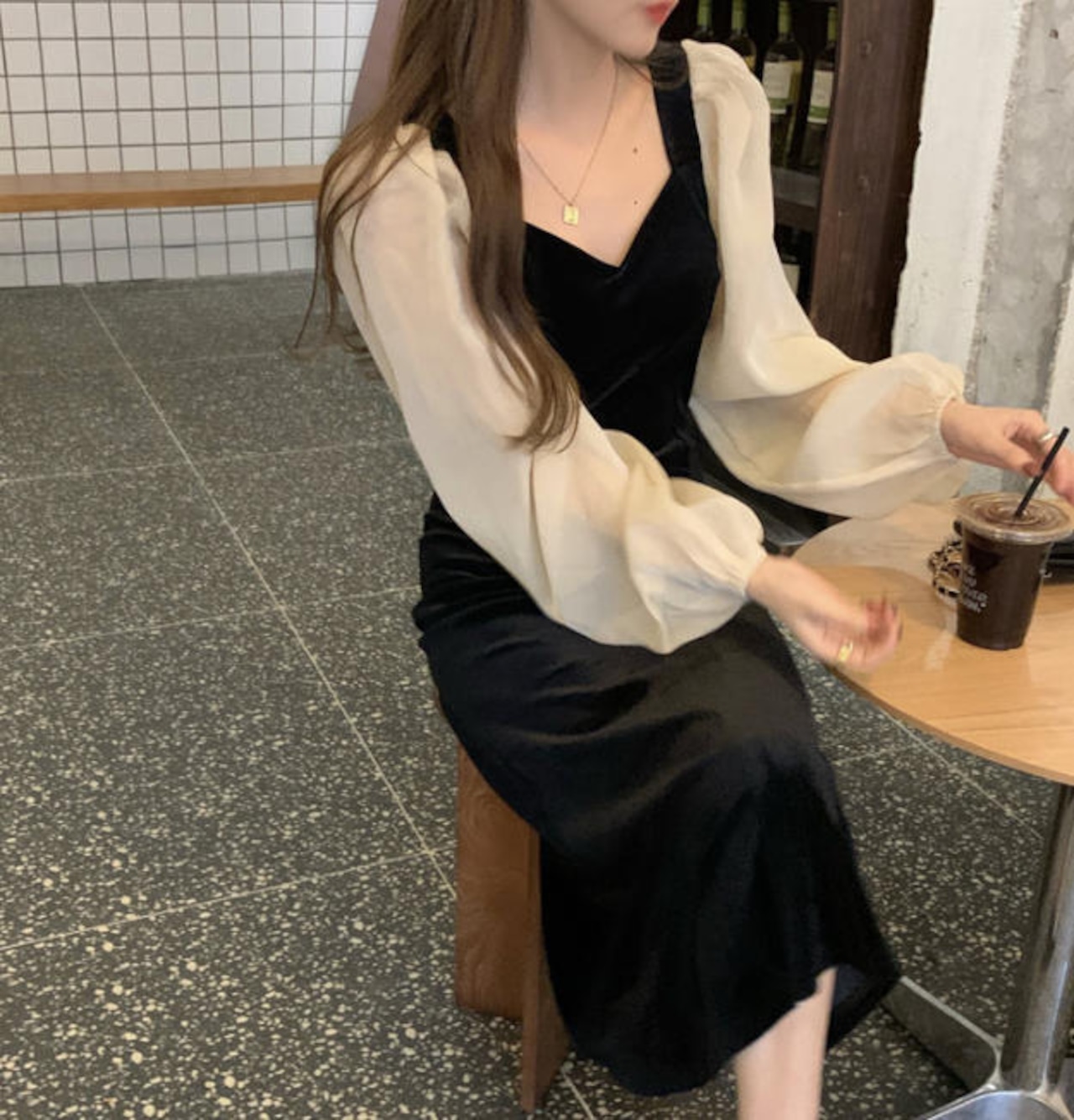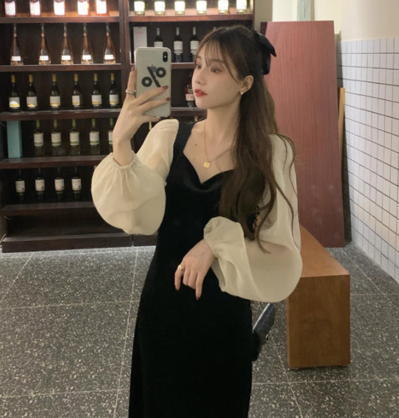 ドッキングワンピース ロング フレア パフスリーブ レトロ フェミニン 大人可愛い 長袖
