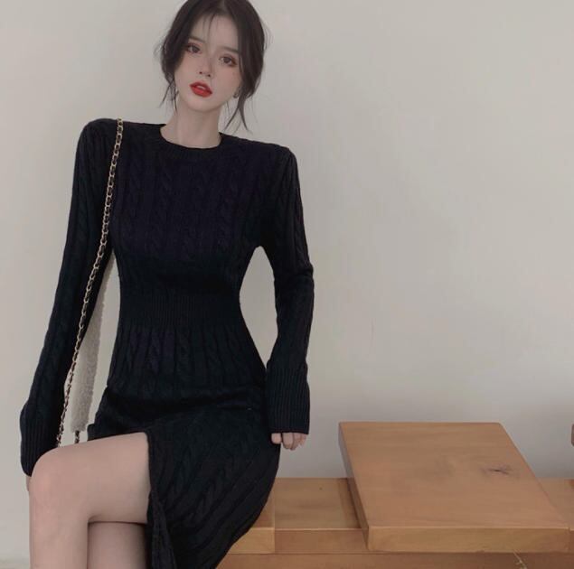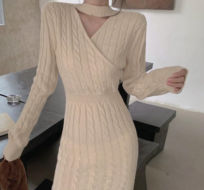 ニットワンピース ひざ丈 Vネック タイト ケーブル編み スリット きれいめ 上品 大人可愛い