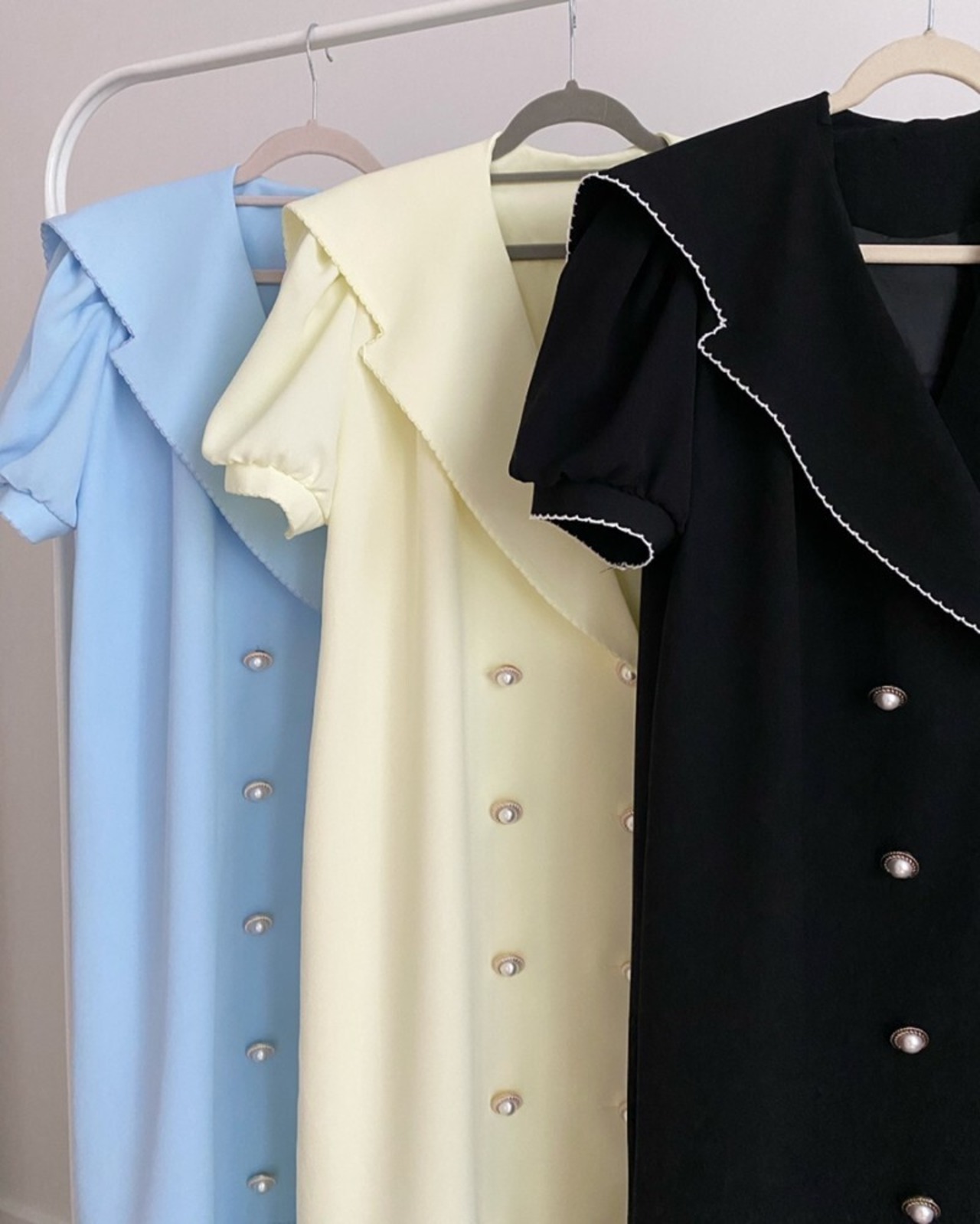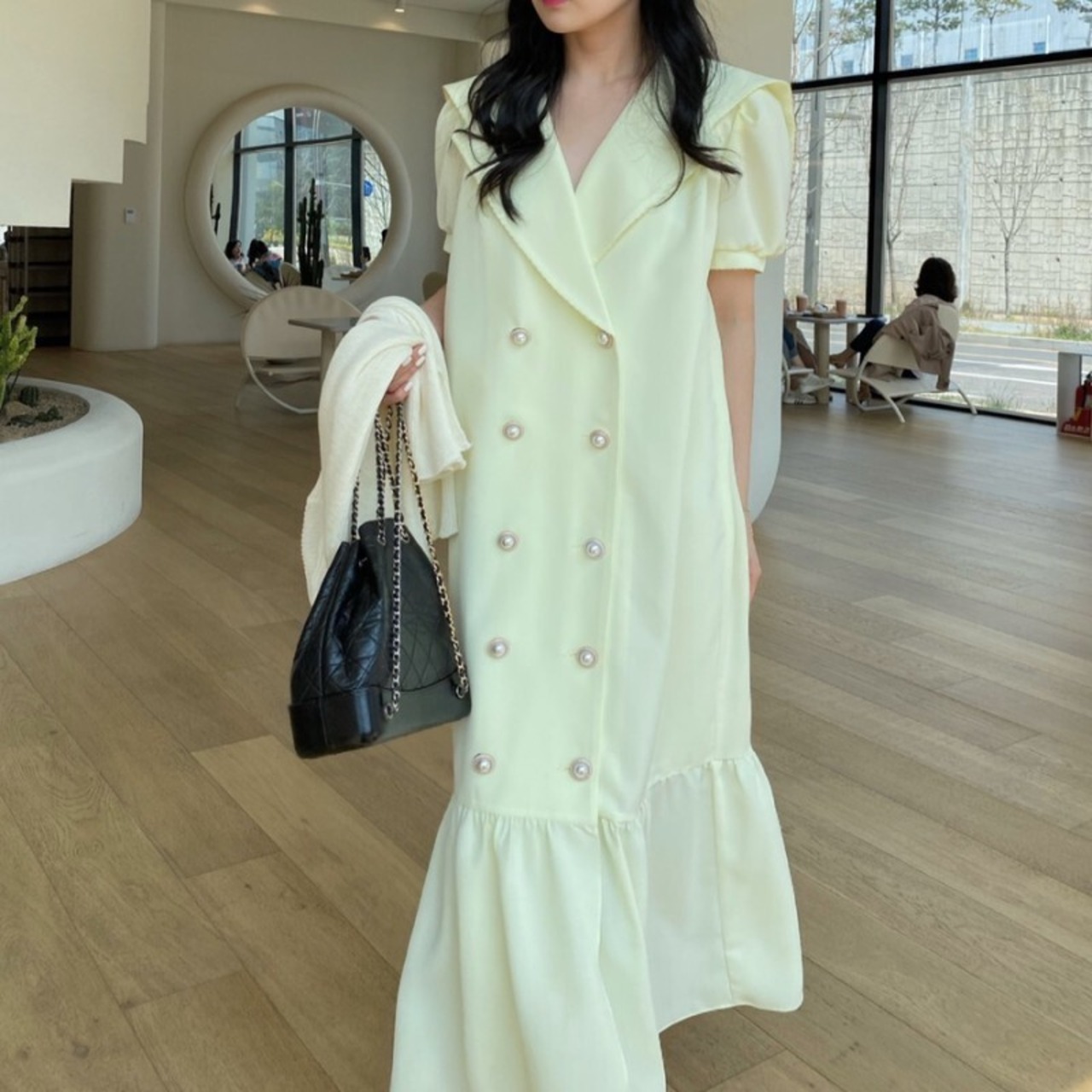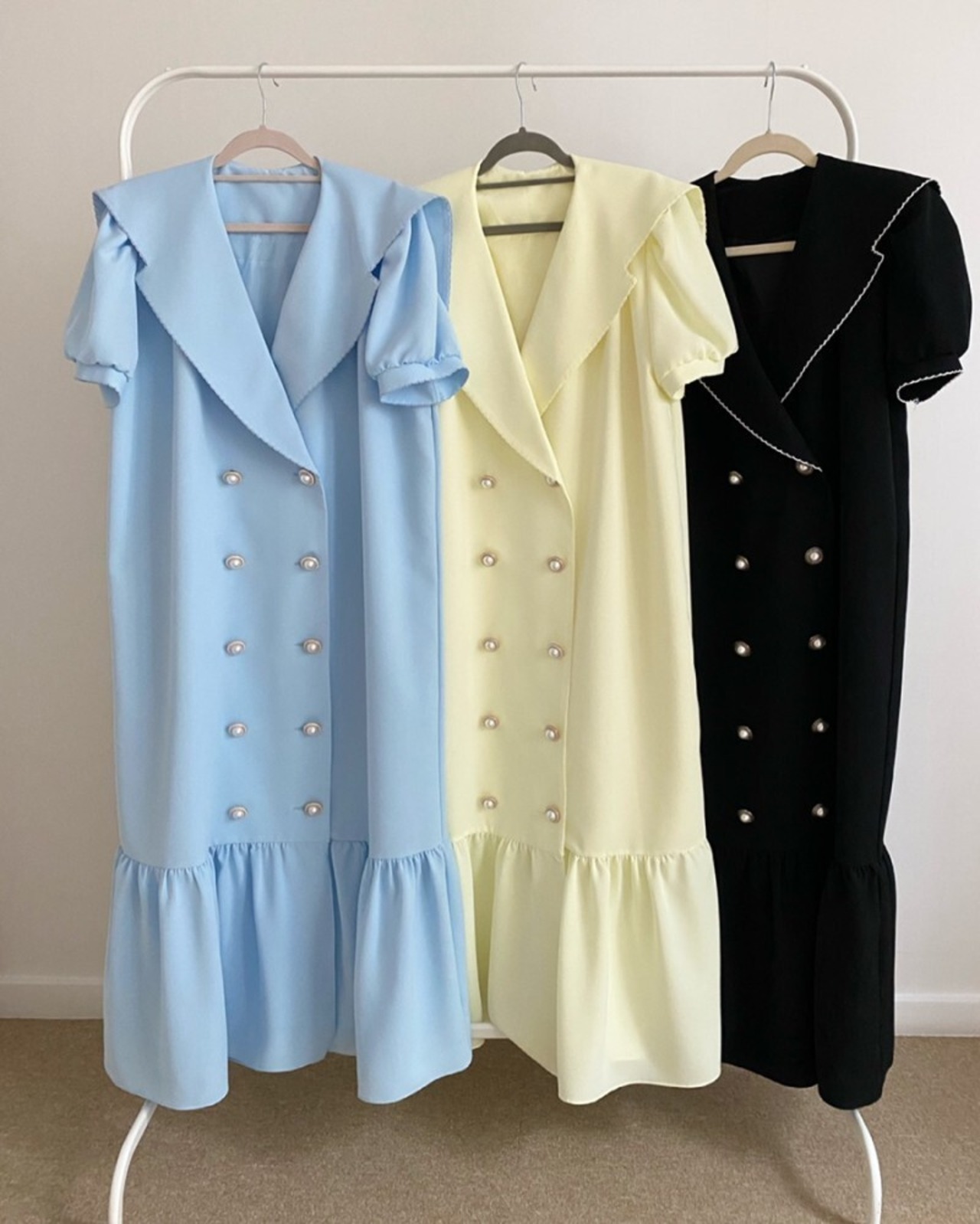 ワンピース ロング フレア ダブルボタン パフスリーブ セーラー フェミニン お出かけ きれいめ カジュアル 大人可愛い 韓国ファッション