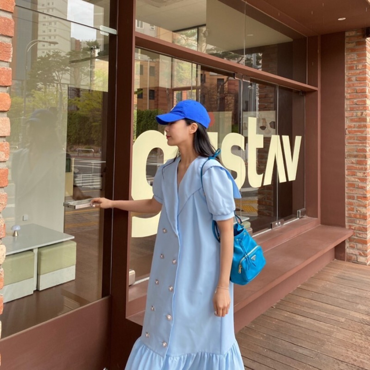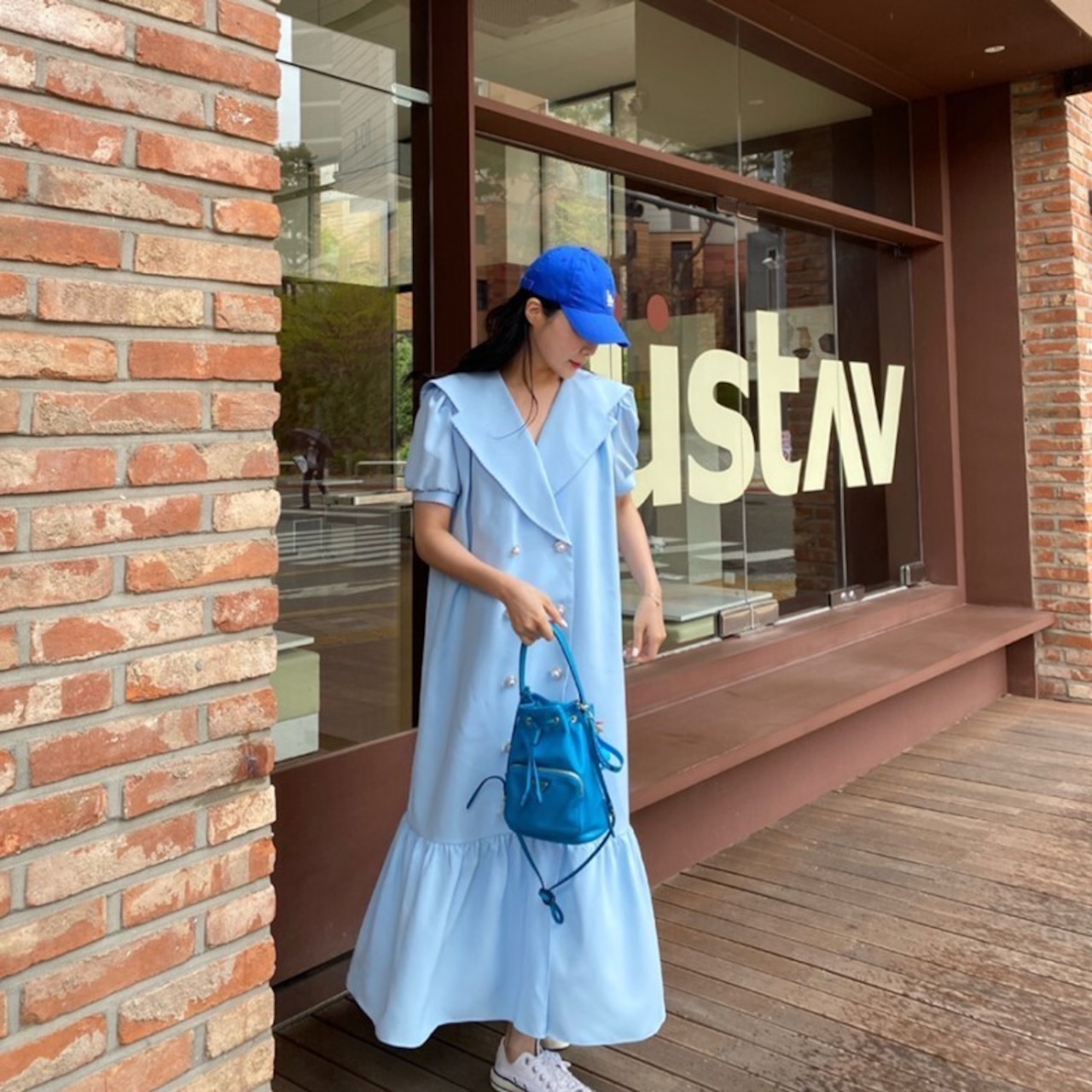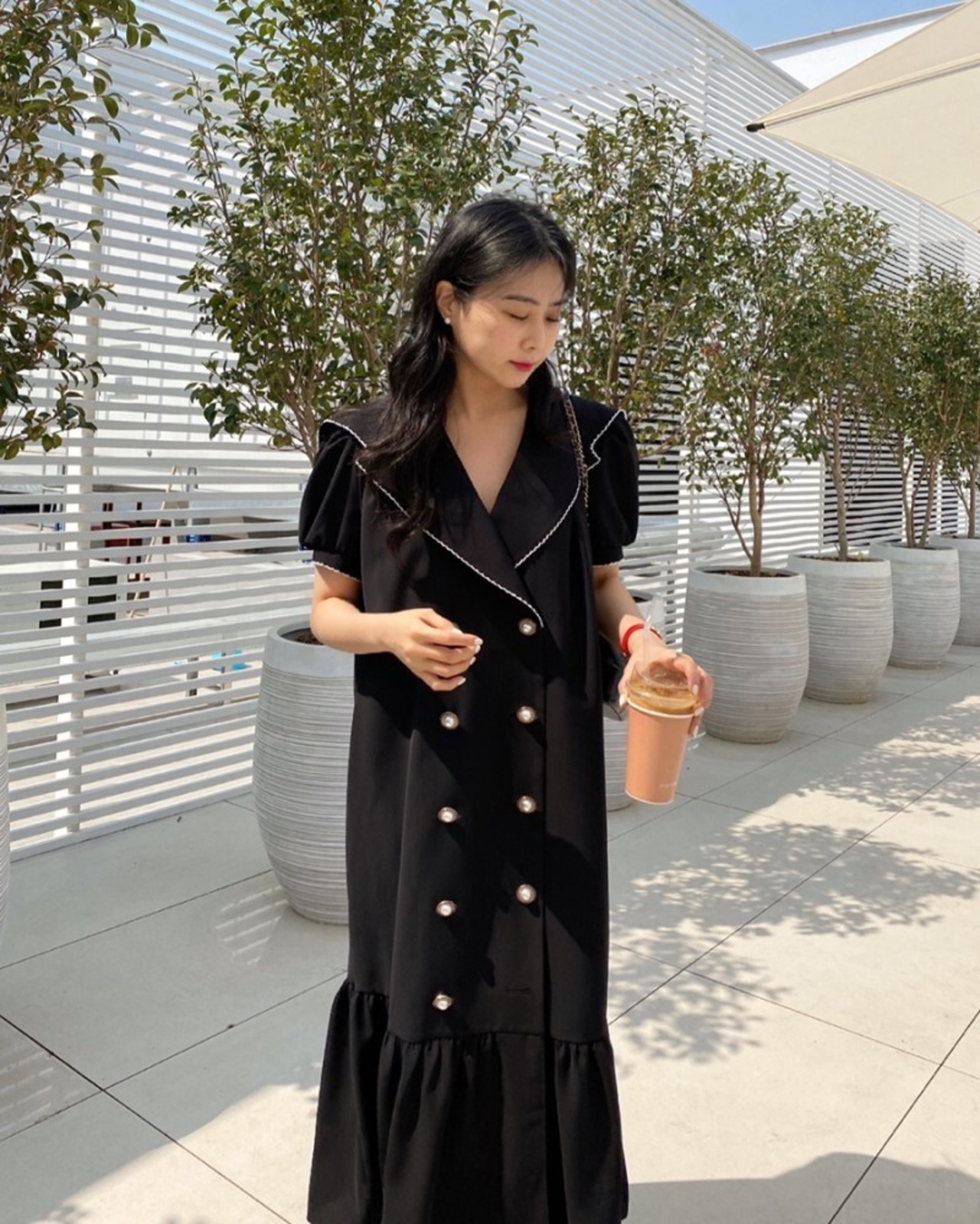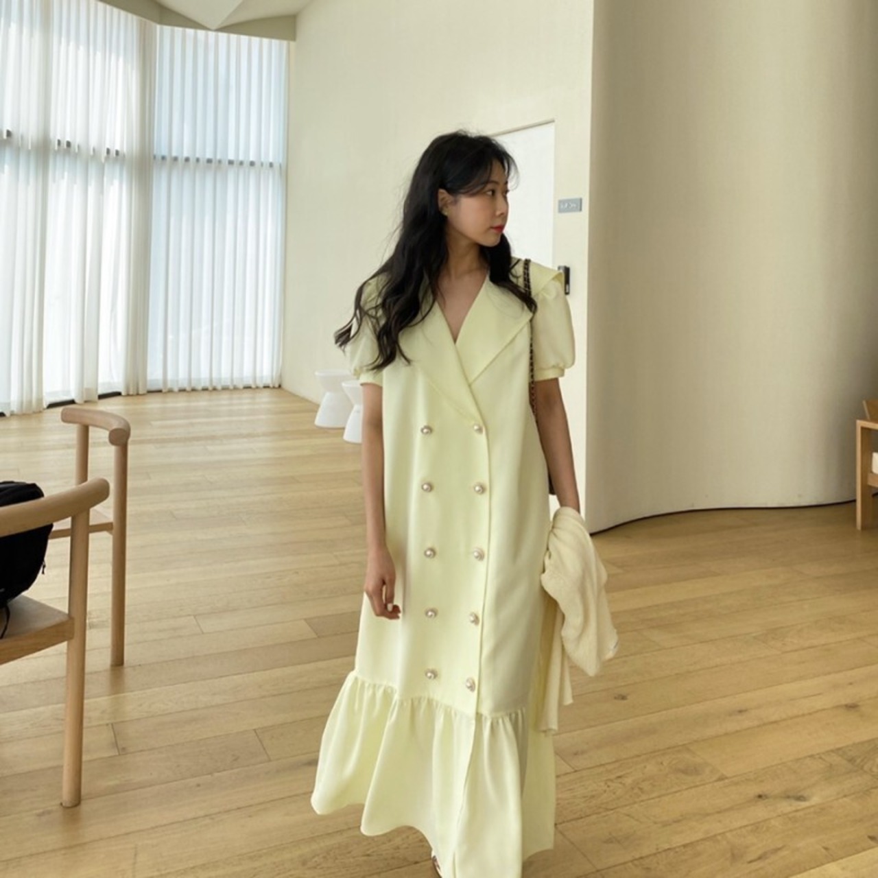 ワンピース ロング フレア ダブルボタン パフスリーブ セーラー フェミニン お出かけ きれいめ カジュアル 大人可愛い 韓国ファッション