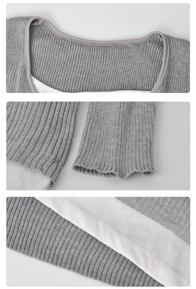 トップス オープンショルダー 長袖 春 ニット レイヤード風 重ね着風 ドッキング きれいめ カジュアル 大人可愛い 韓国ファッション