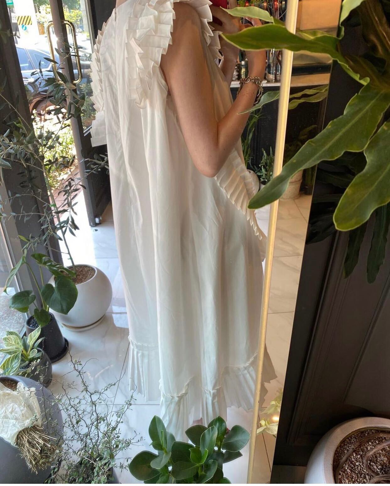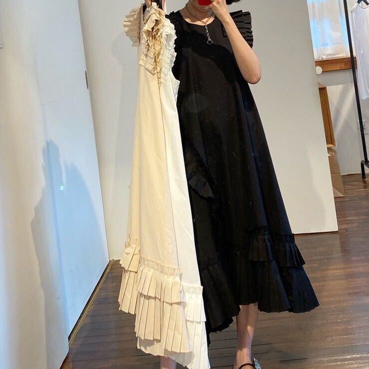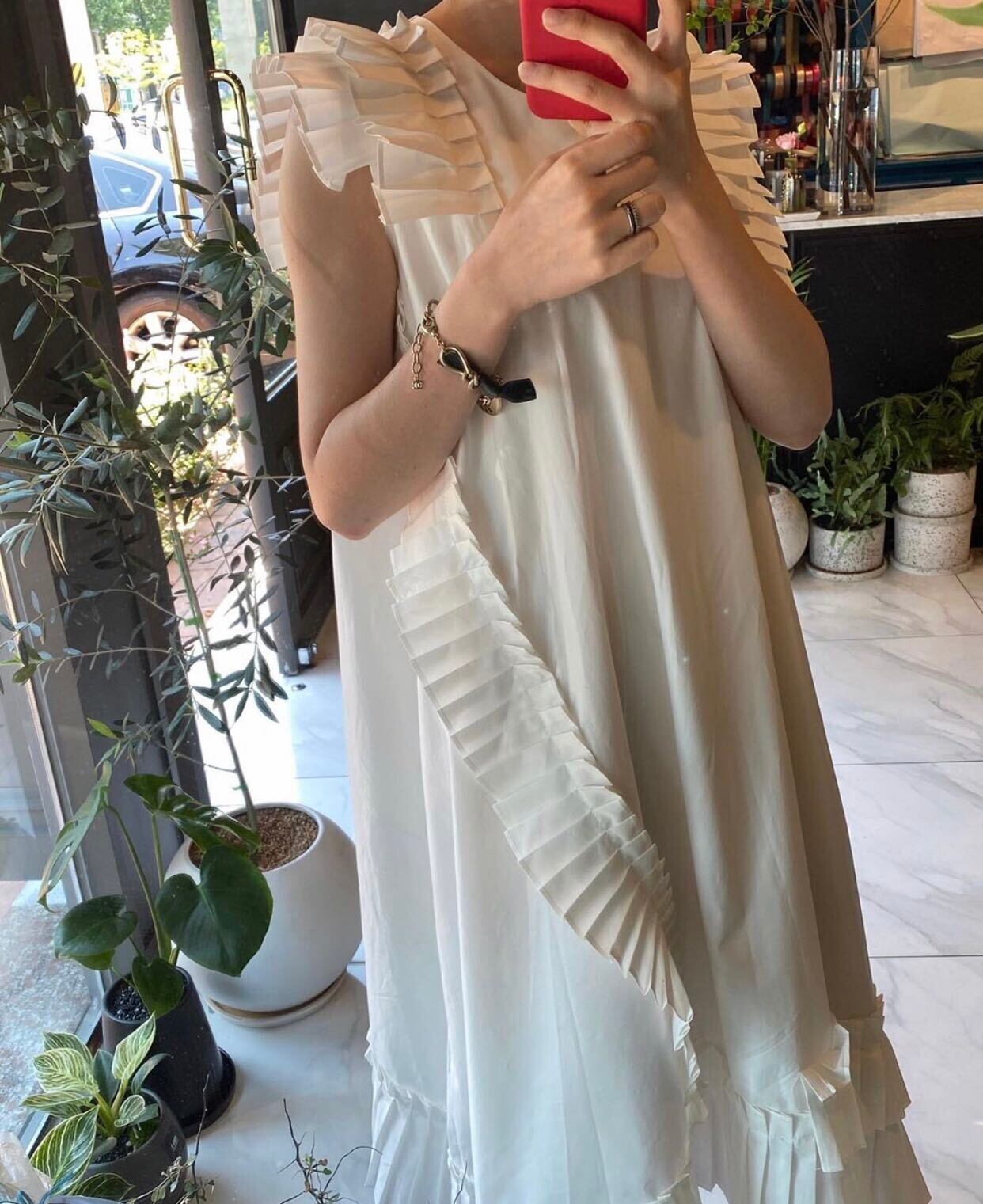 プリーツフリルがたっぷりあしらわれたデザインワンピース。