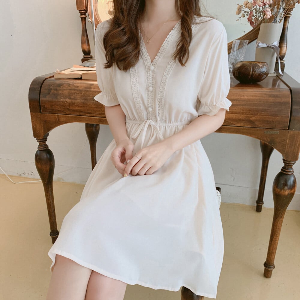 シフォン ワンピース 膝丈 レース デート お出かけ きれいめ カジュアル 大人可愛い 韓国ファッション