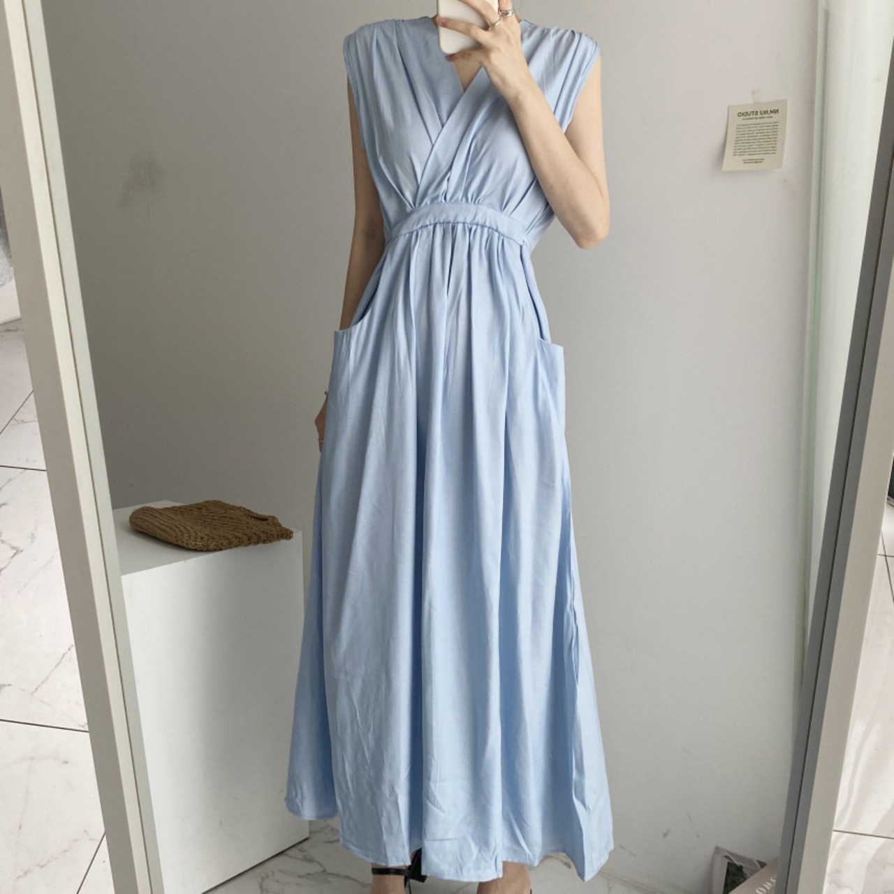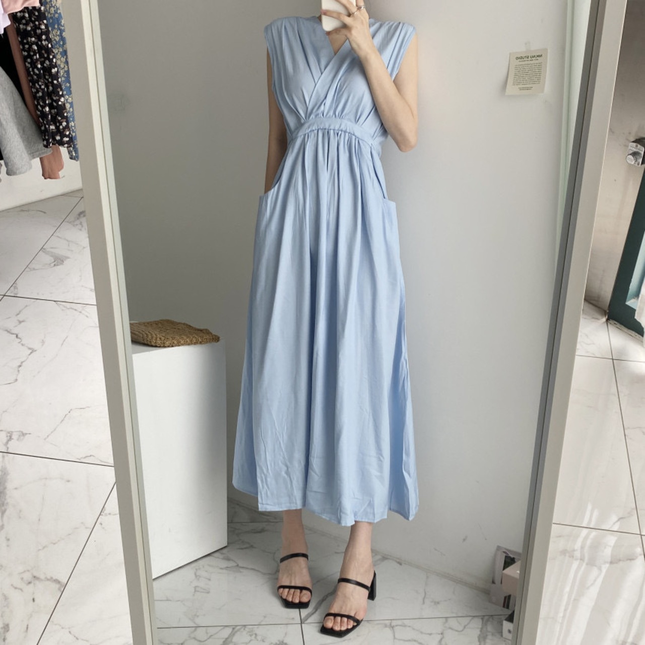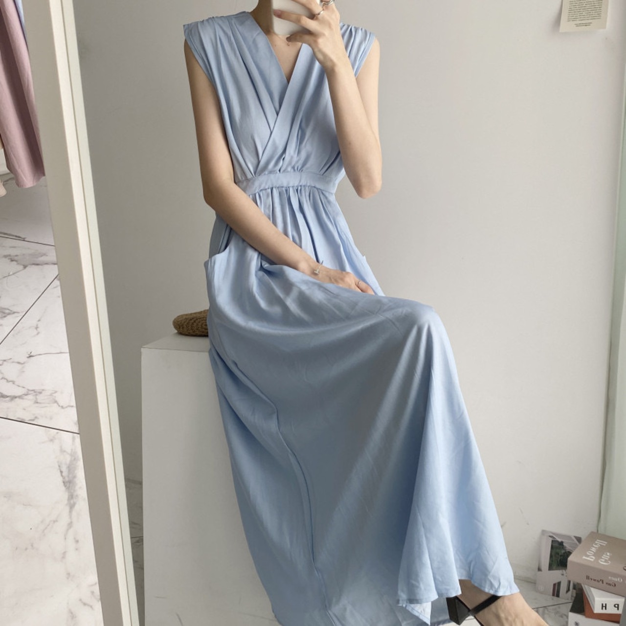 ロング ワンピース ノースリーブ フェミニン Vネック ウエストマーク きれいめ カジュアル 大人可愛い 韓国ファッション