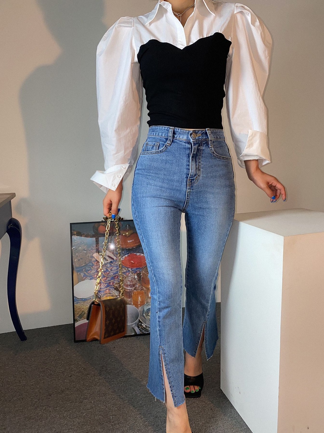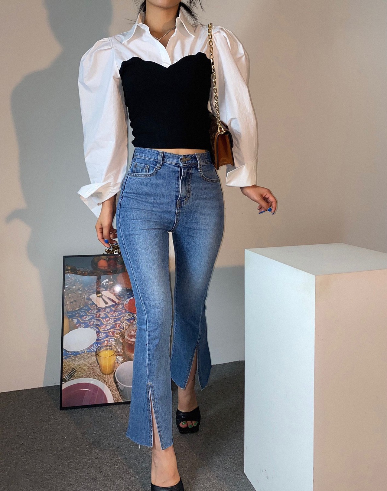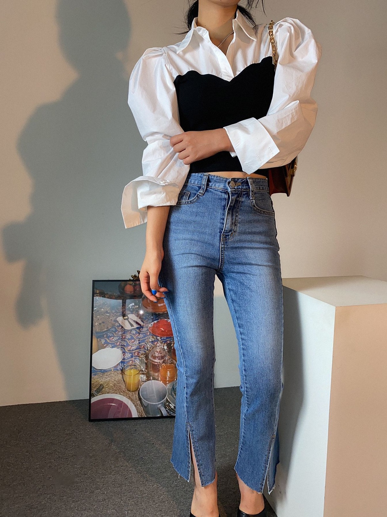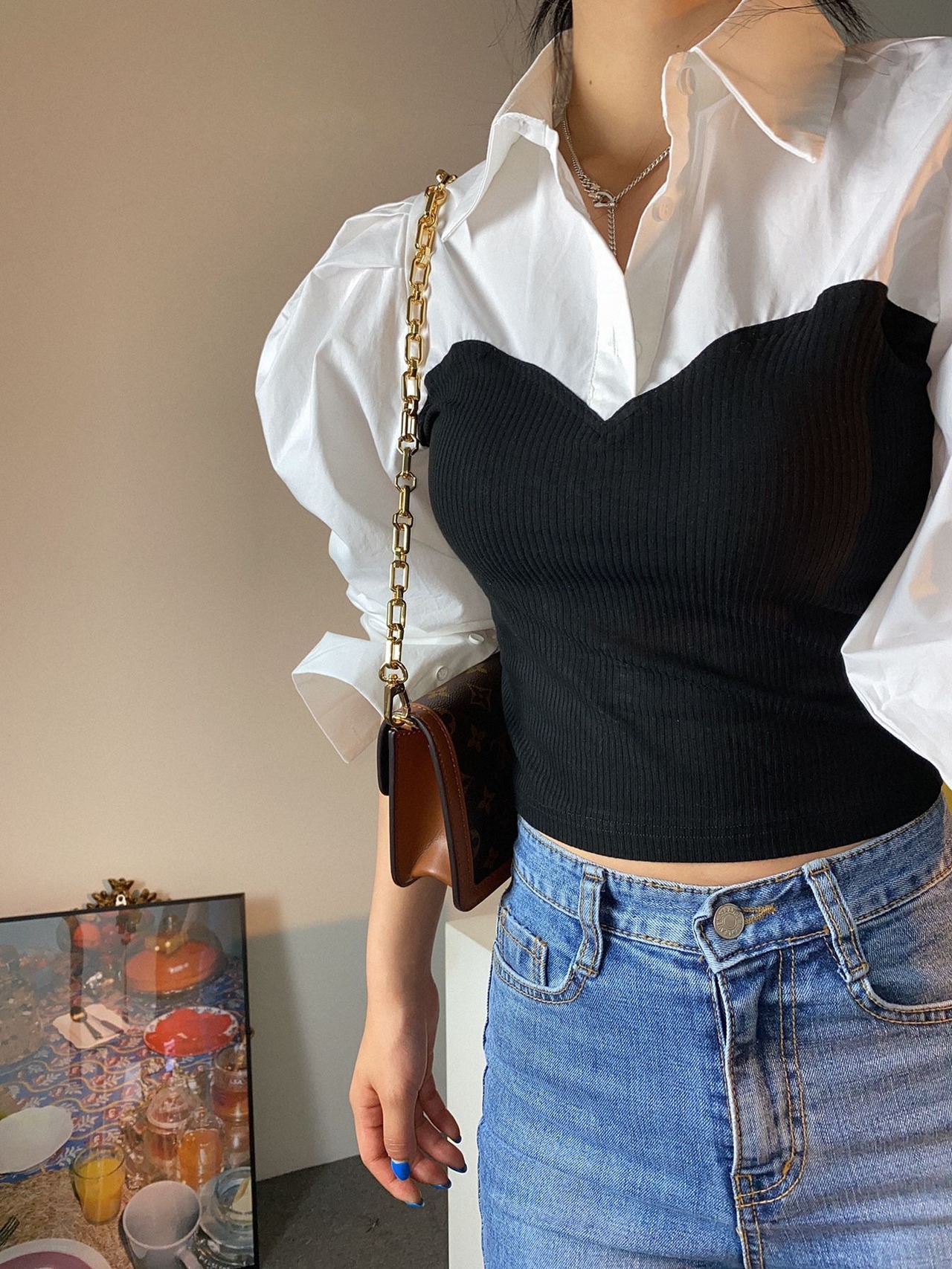 トップス シャツ ドッキング レイヤード風 ボリューム袖 モノクロ きれいめ カジュアル 大人可愛い 韓国ファッション