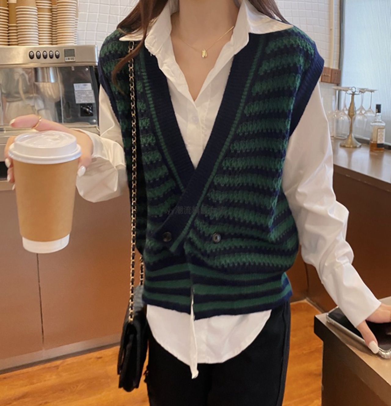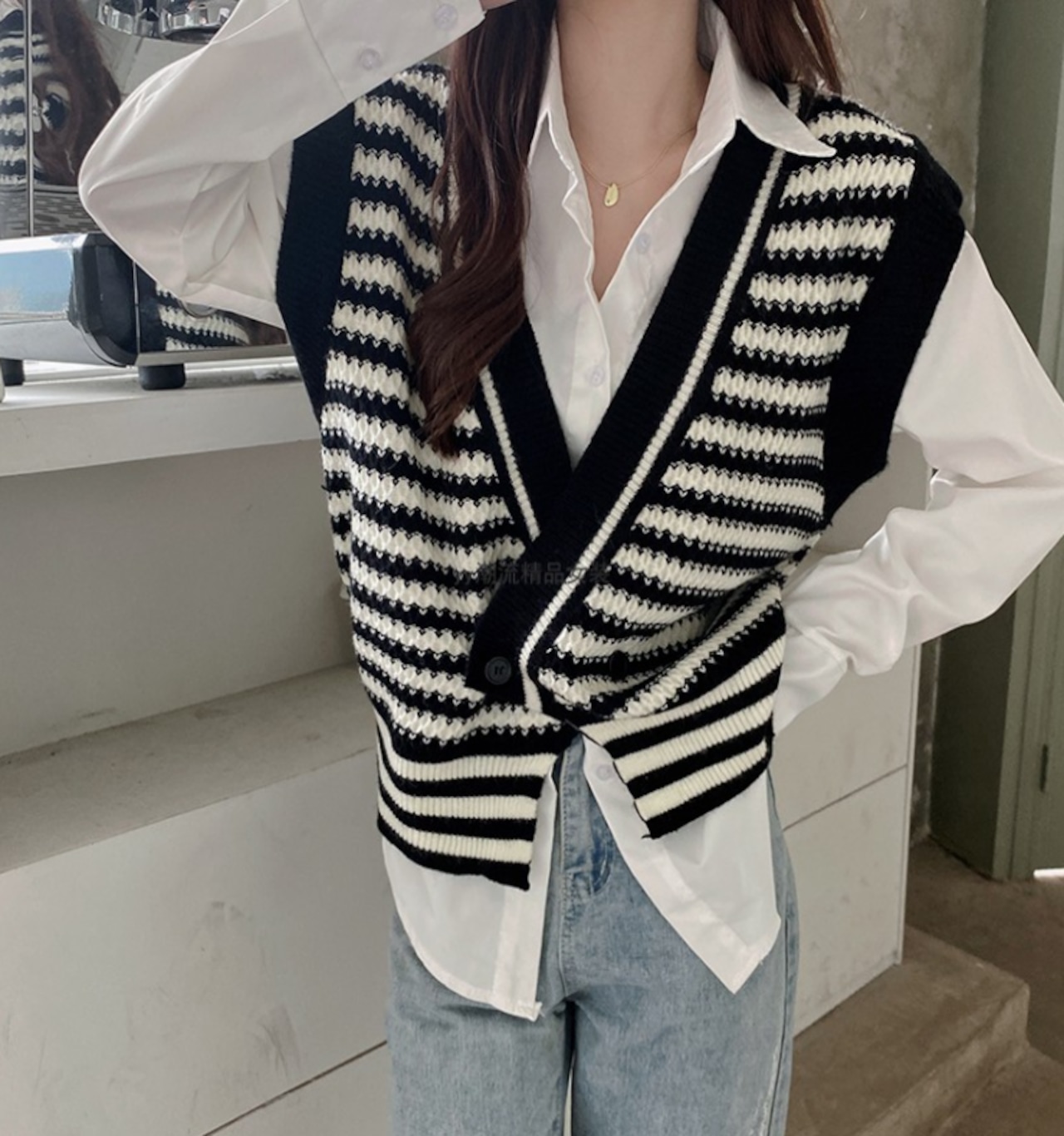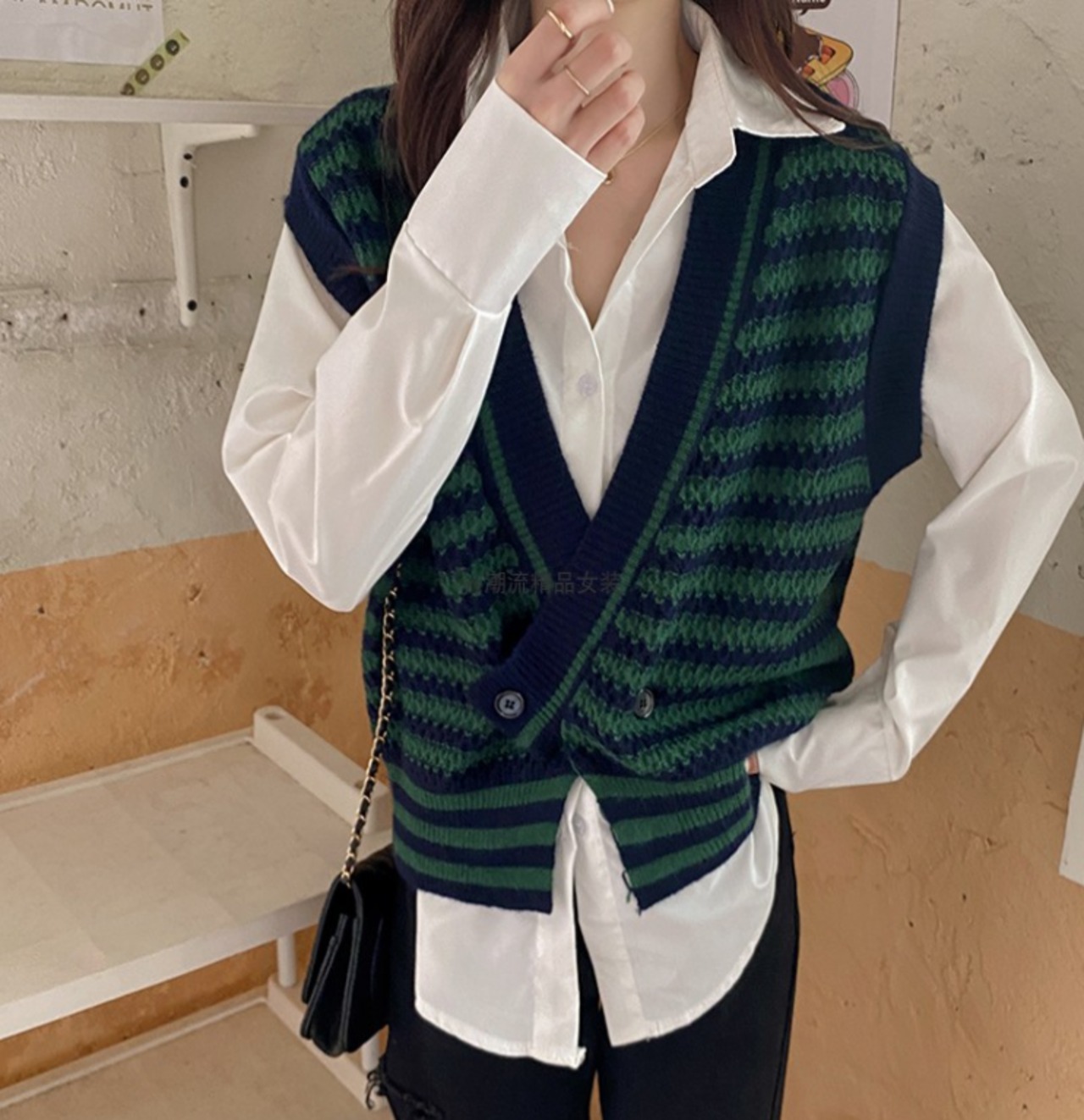 ベスト ニット ボーダー柄 レトロ 重ね着 カジュアル 着回し きれいめ Vネック 韓国ファッション