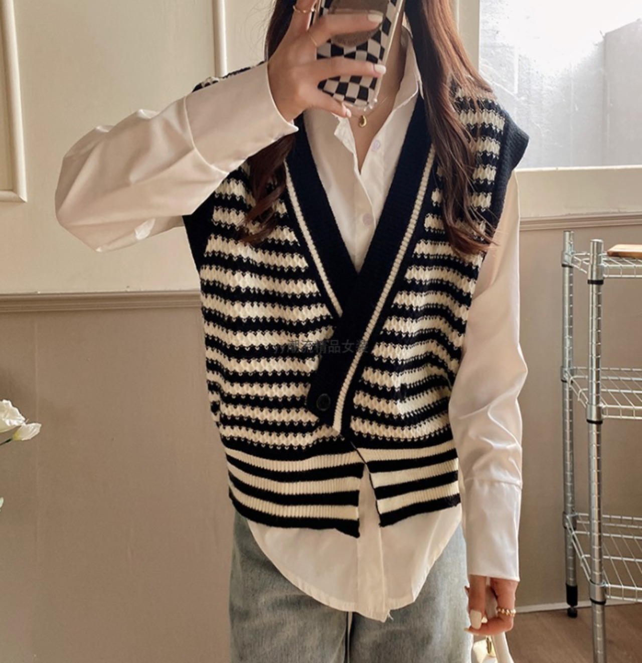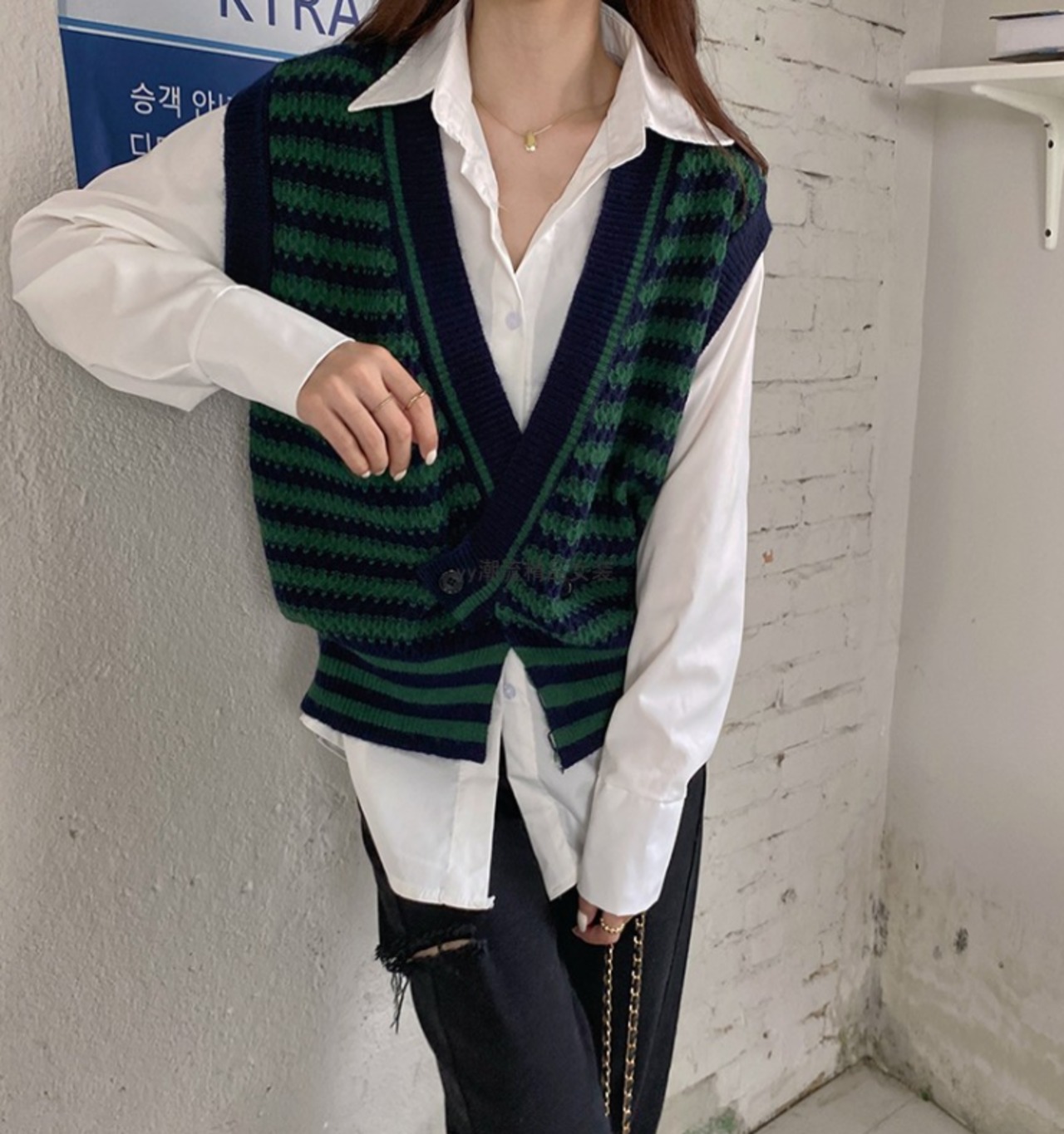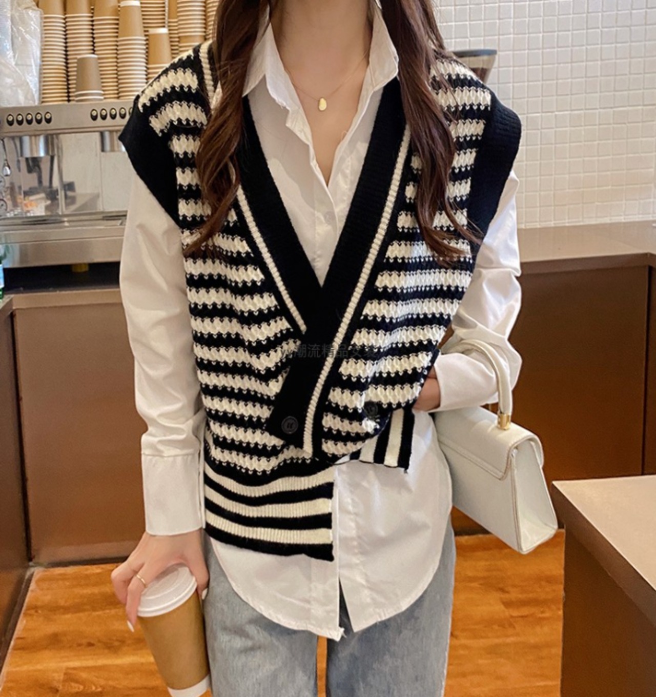 ベスト ニット ボーダー柄 レトロ 重ね着 カジュアル 着回し きれいめ Vネック 韓国ファッション