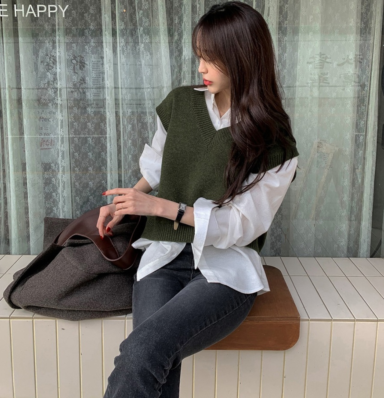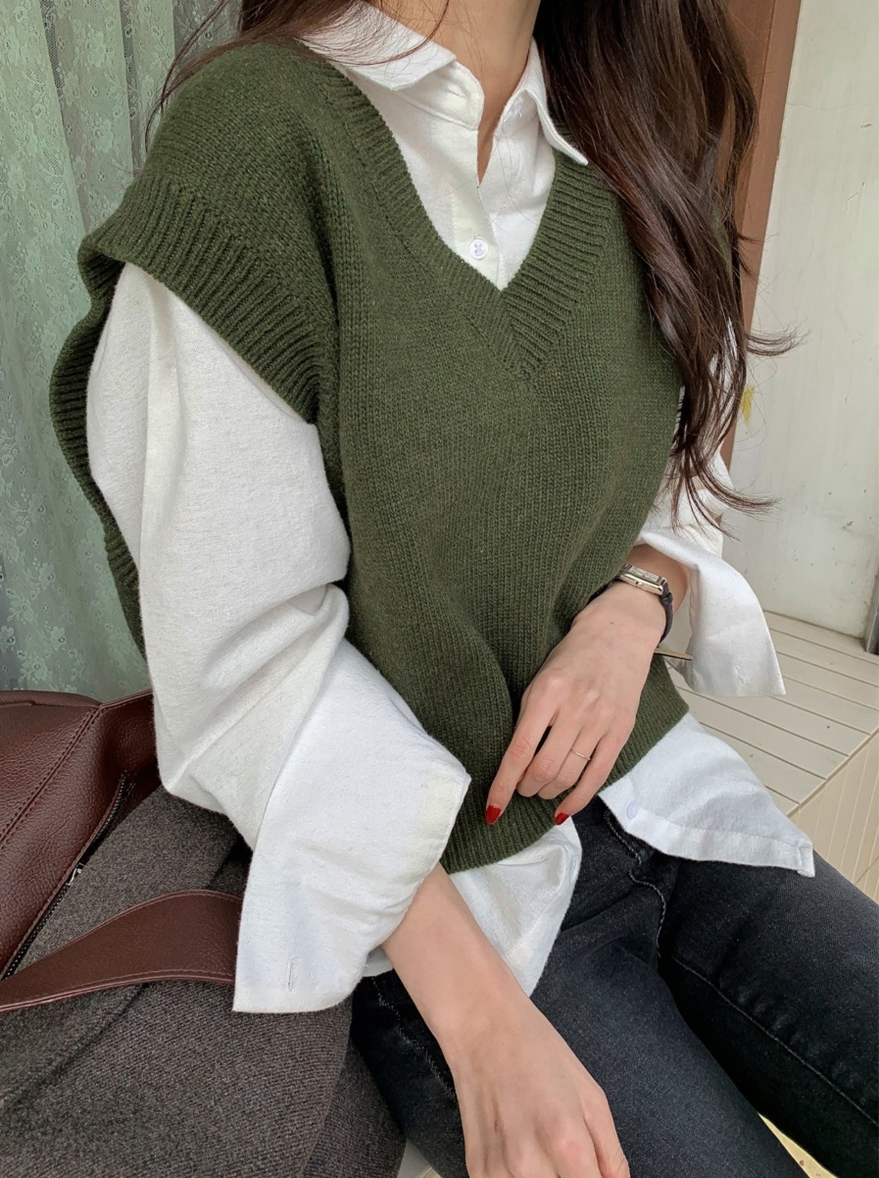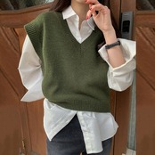 トップス 2点セット シャツ 長袖 ニットベスト レイヤード 重ね着 きれいめ カジュアル シンプル オフィス 通勤 通学 大人可愛い 韓国ファッション