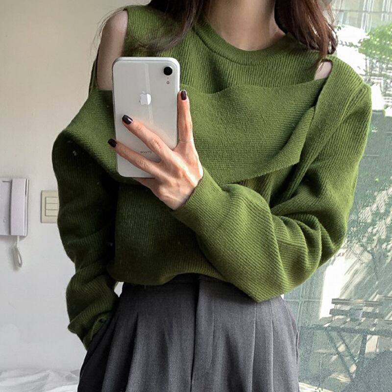 ニット トップス レイヤード風 オープンショルダー 肌見せ カジュアル 大人かわいい デート 韓国ファッション