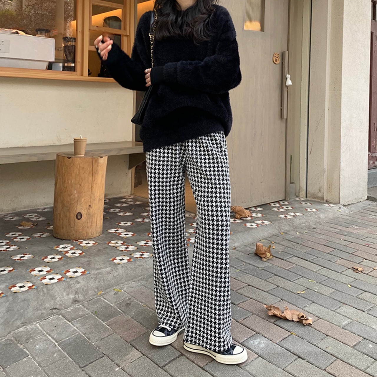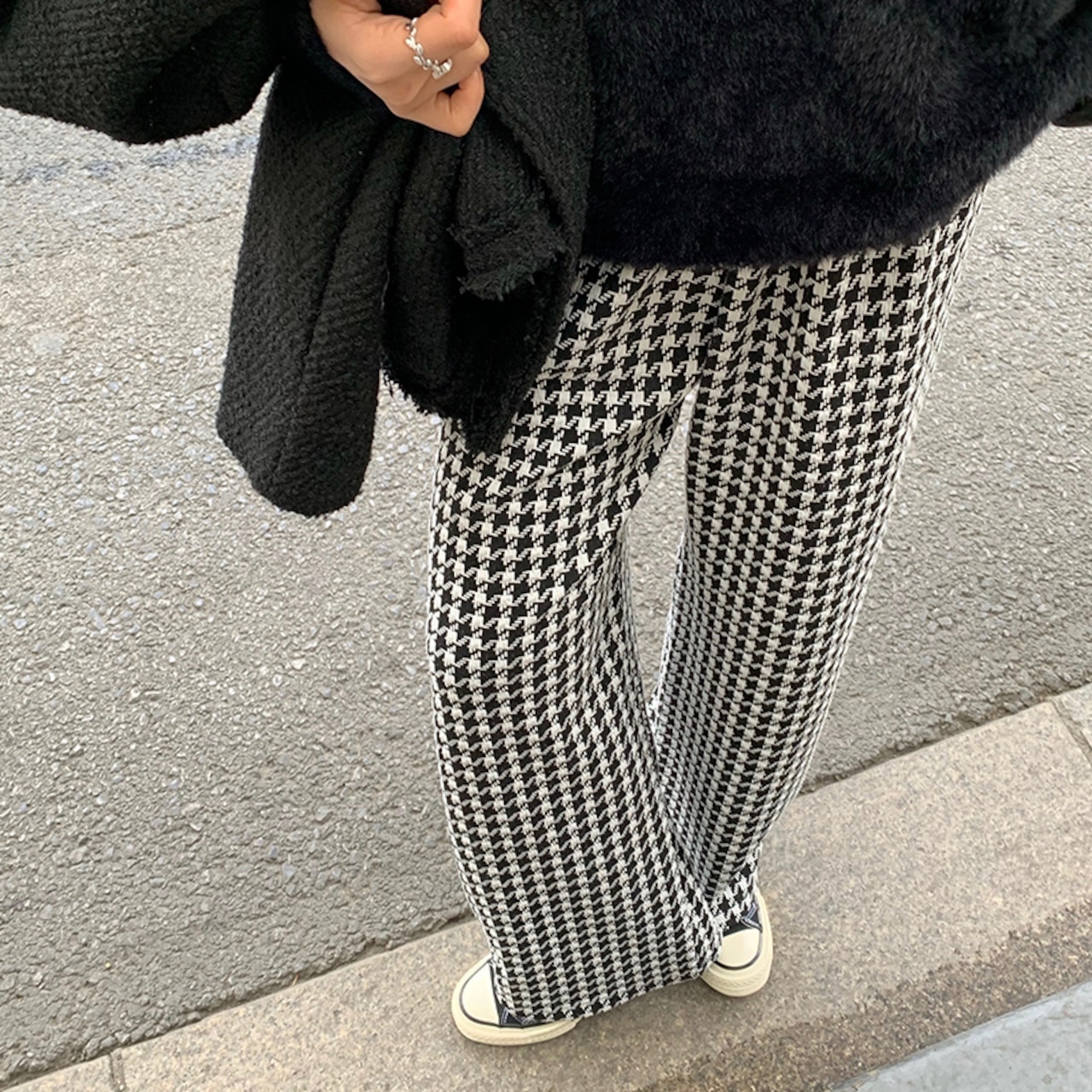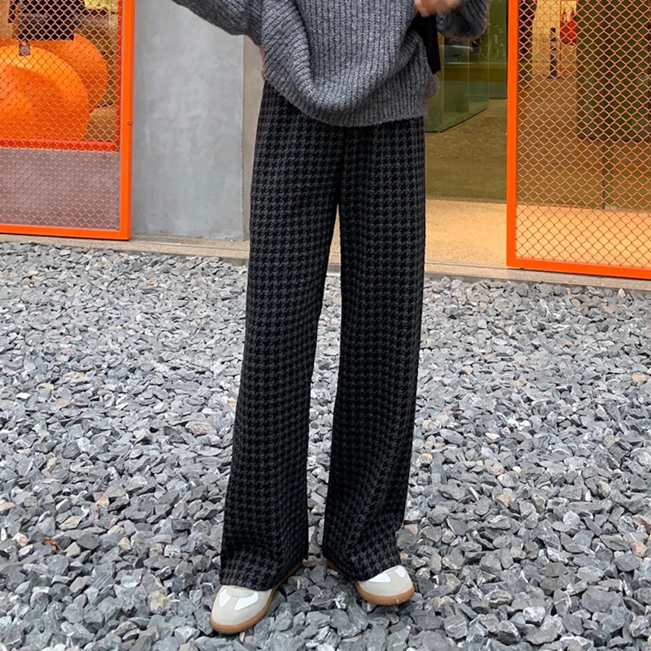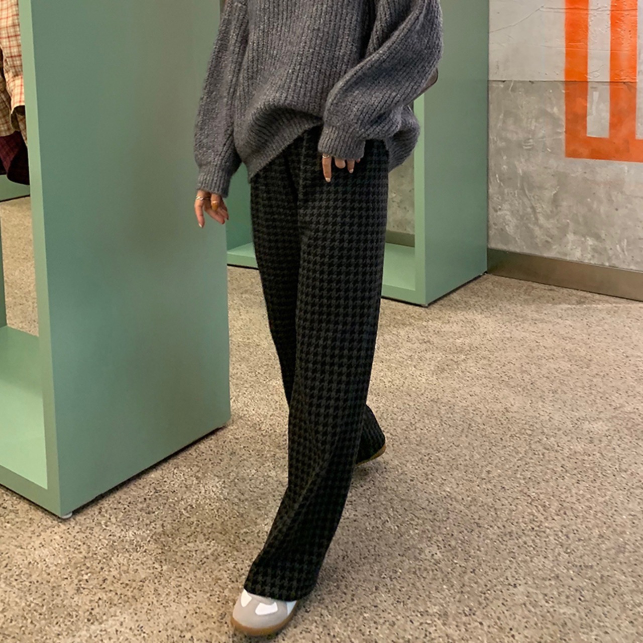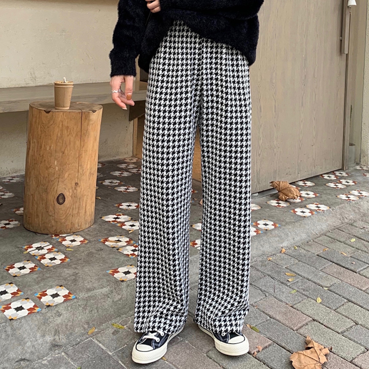 千鳥格子 ストレート ワイドレッグパンツ 韓国スタイル ハイウエスト カジュアルパンツ
