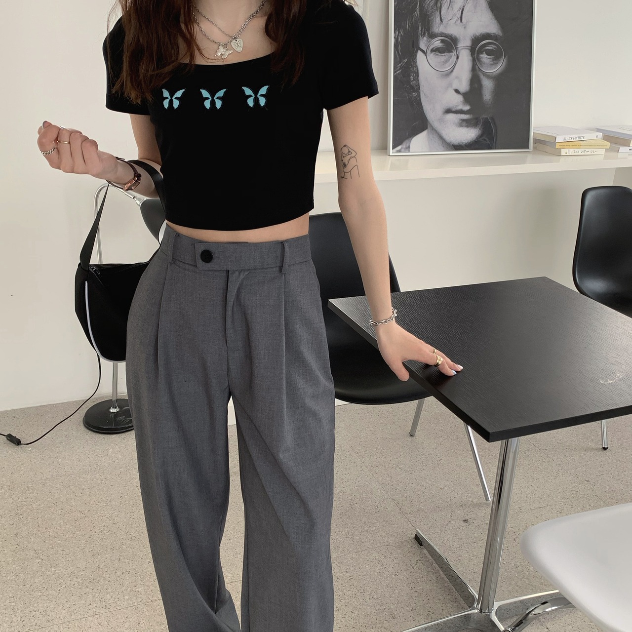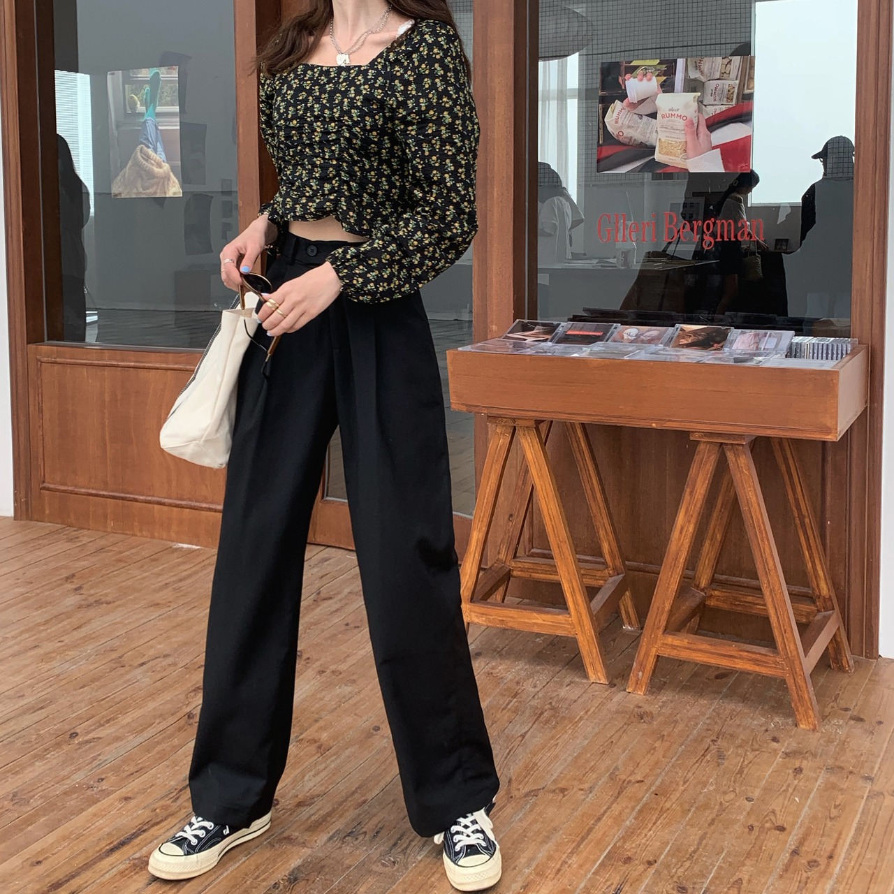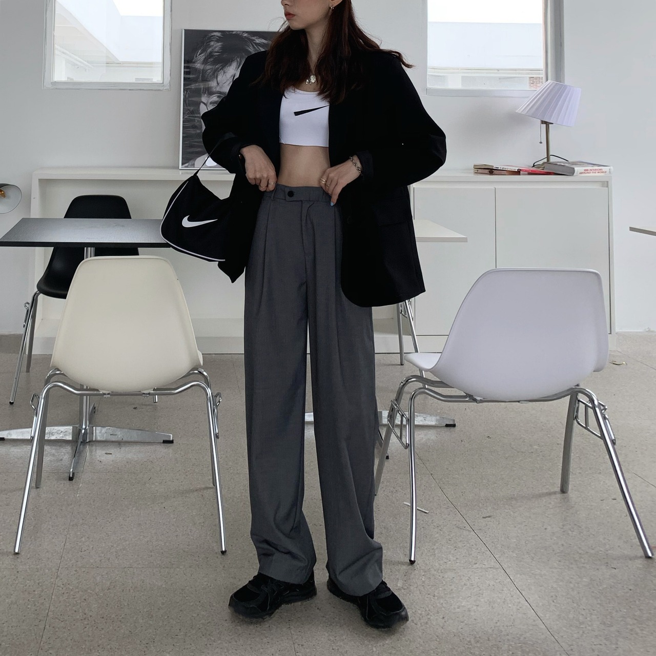 シンプルなハイウエストのワイドレッグパンツ。
