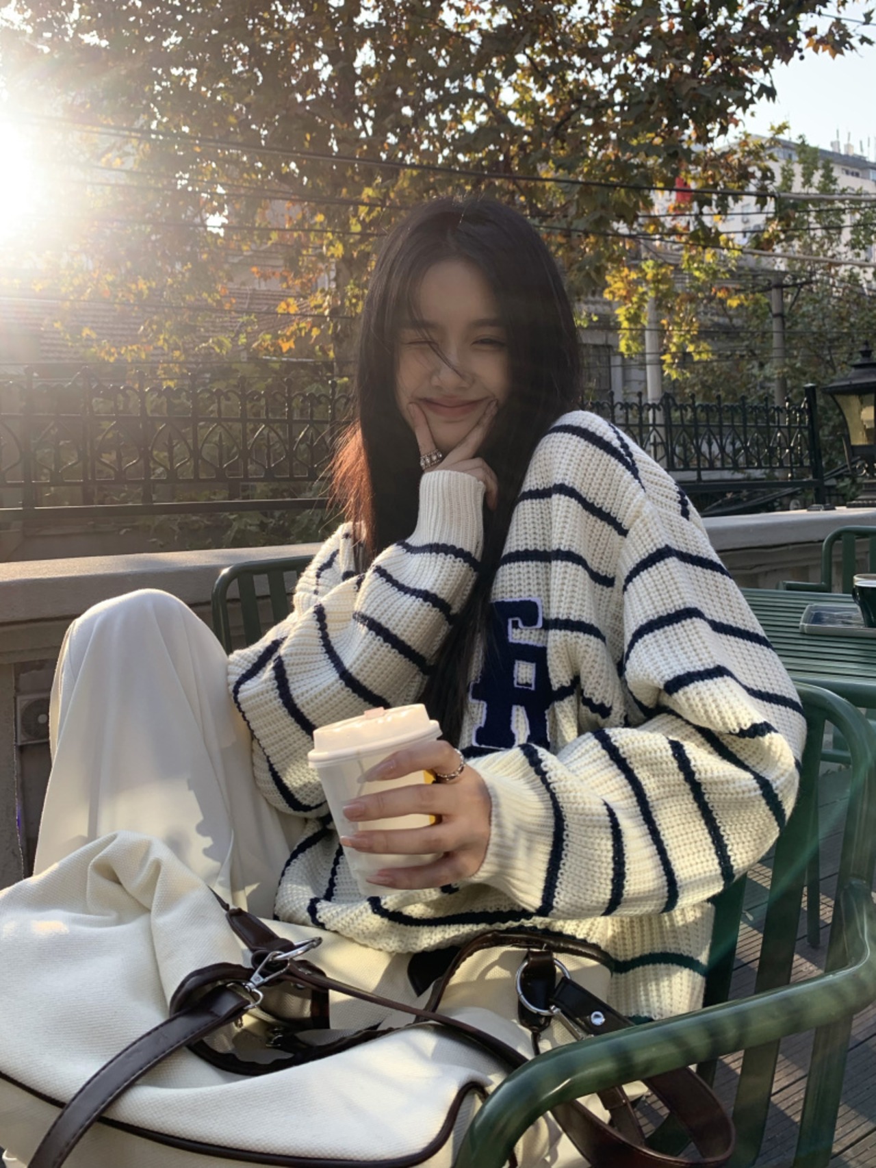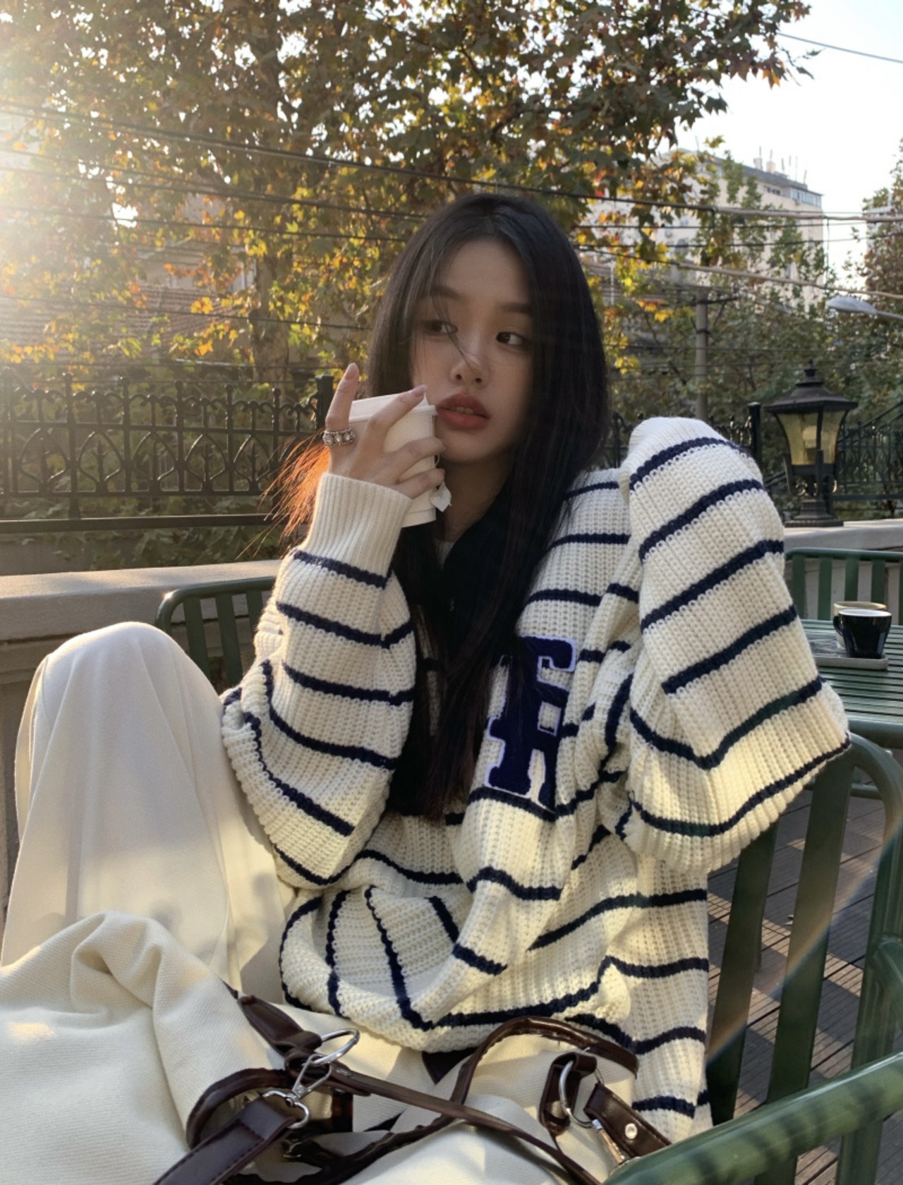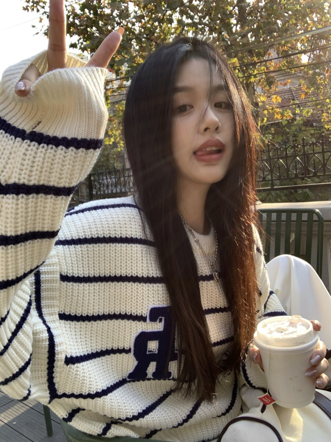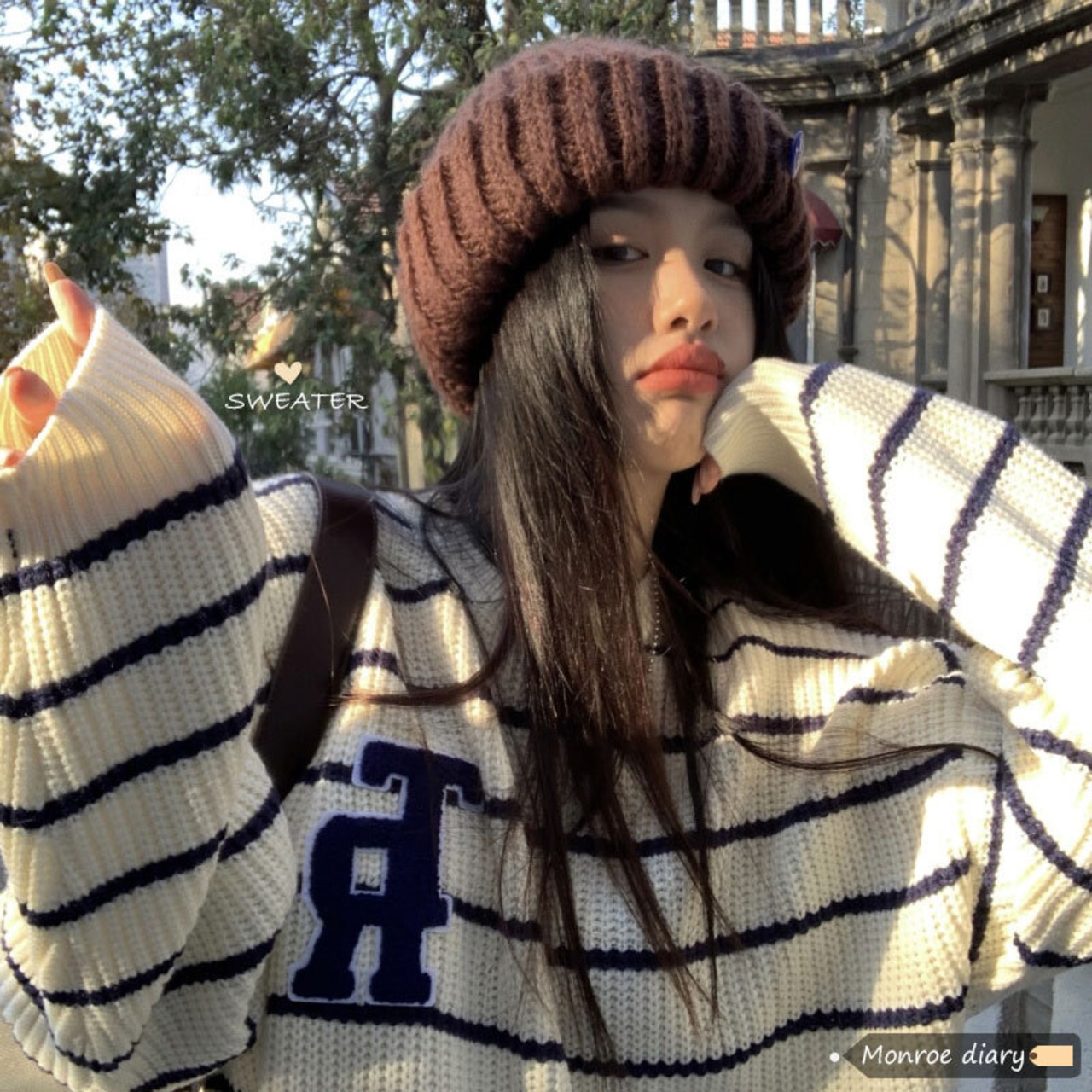ニット トップス ストライプ ルーズ ロングスリーブ 長袖 ロゴ シンプル カジュアル 韓国ファッション