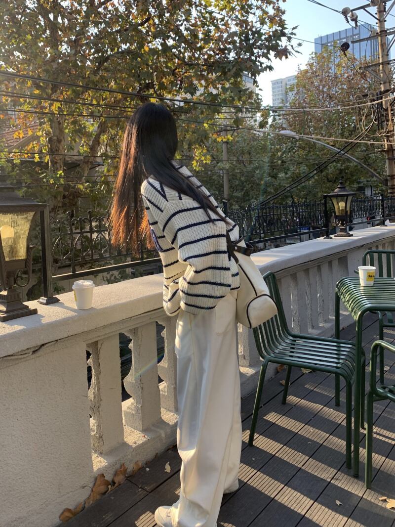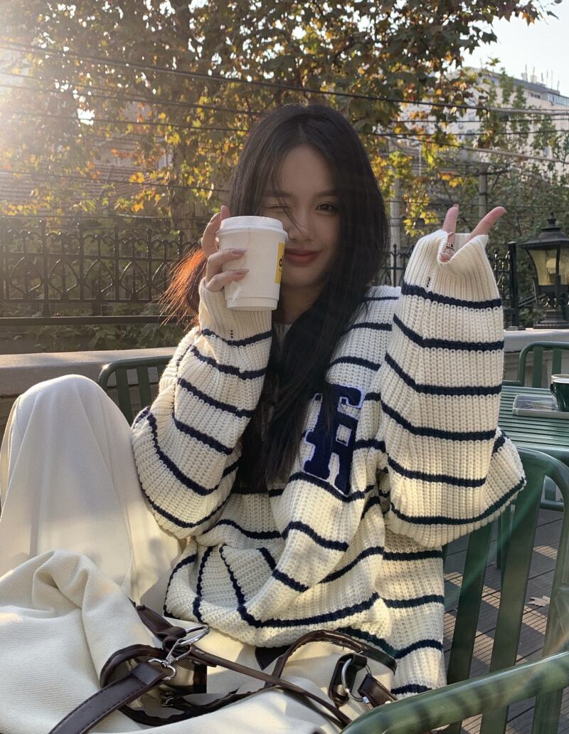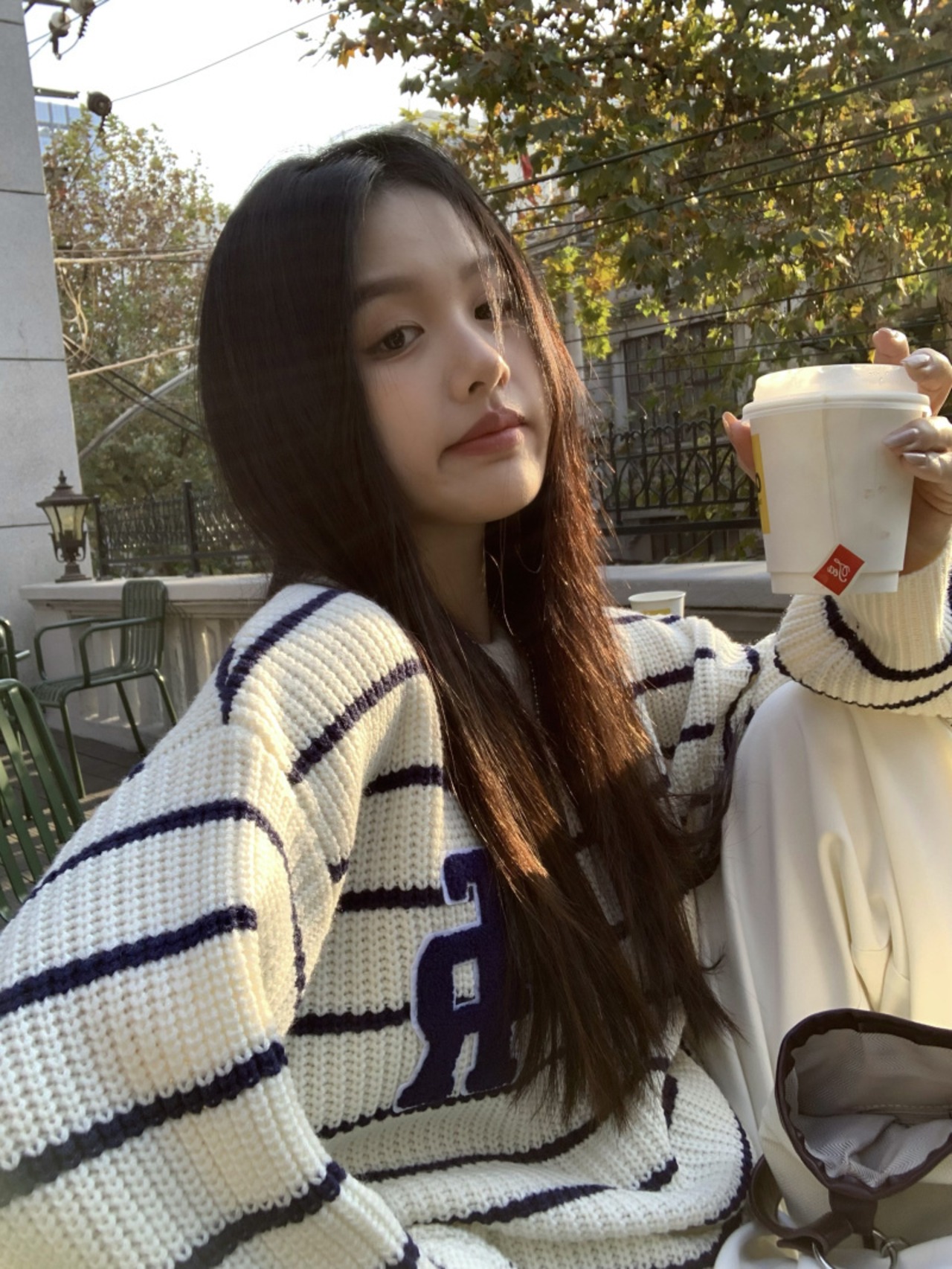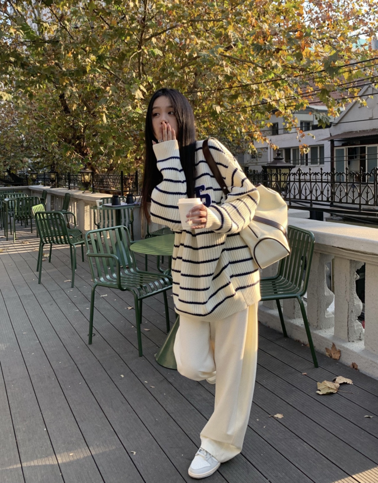 ニット トップス ストライプ ルーズ ロングスリーブ 長袖 ロゴ シンプル カジュアル 韓国ファッション