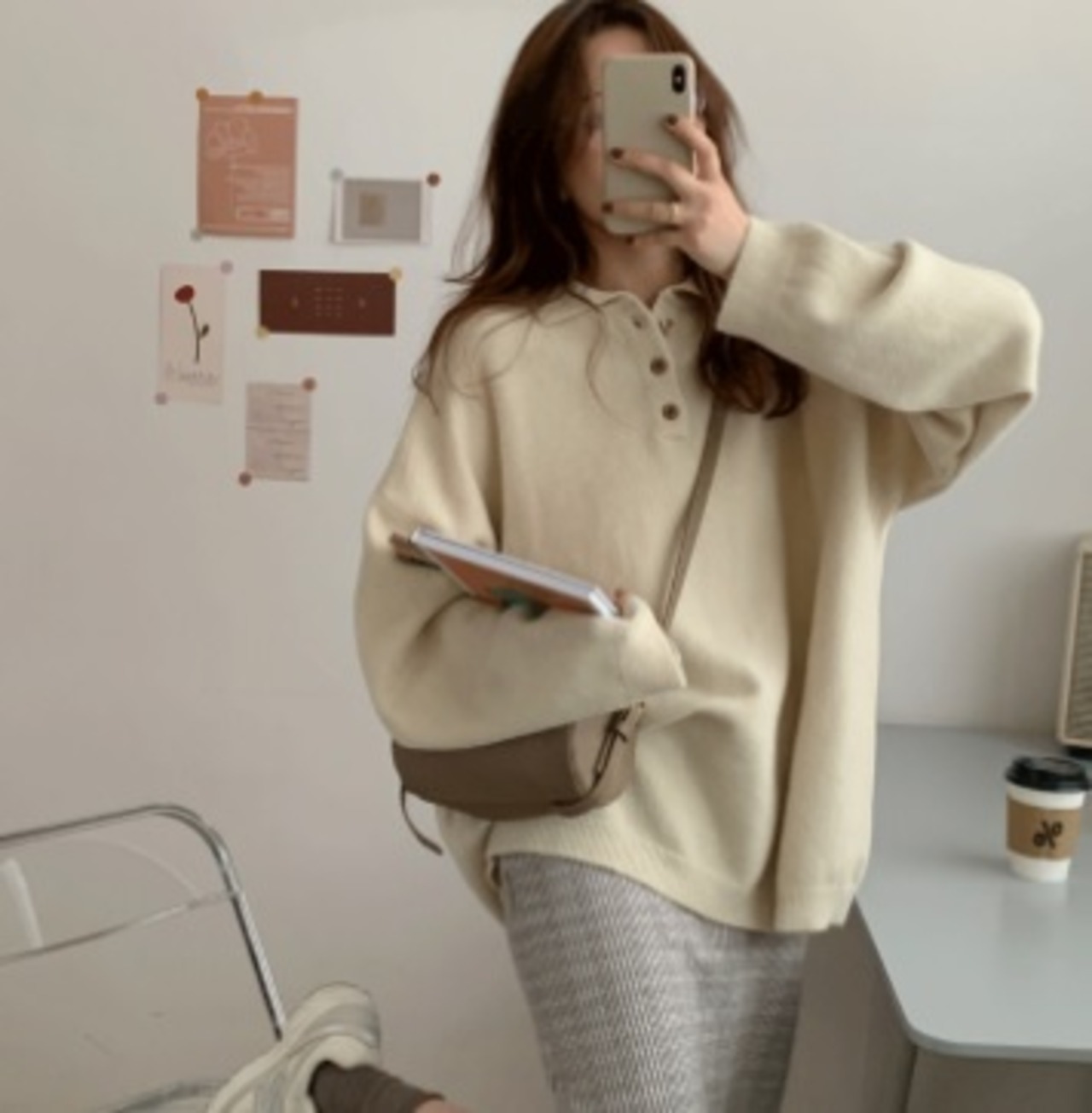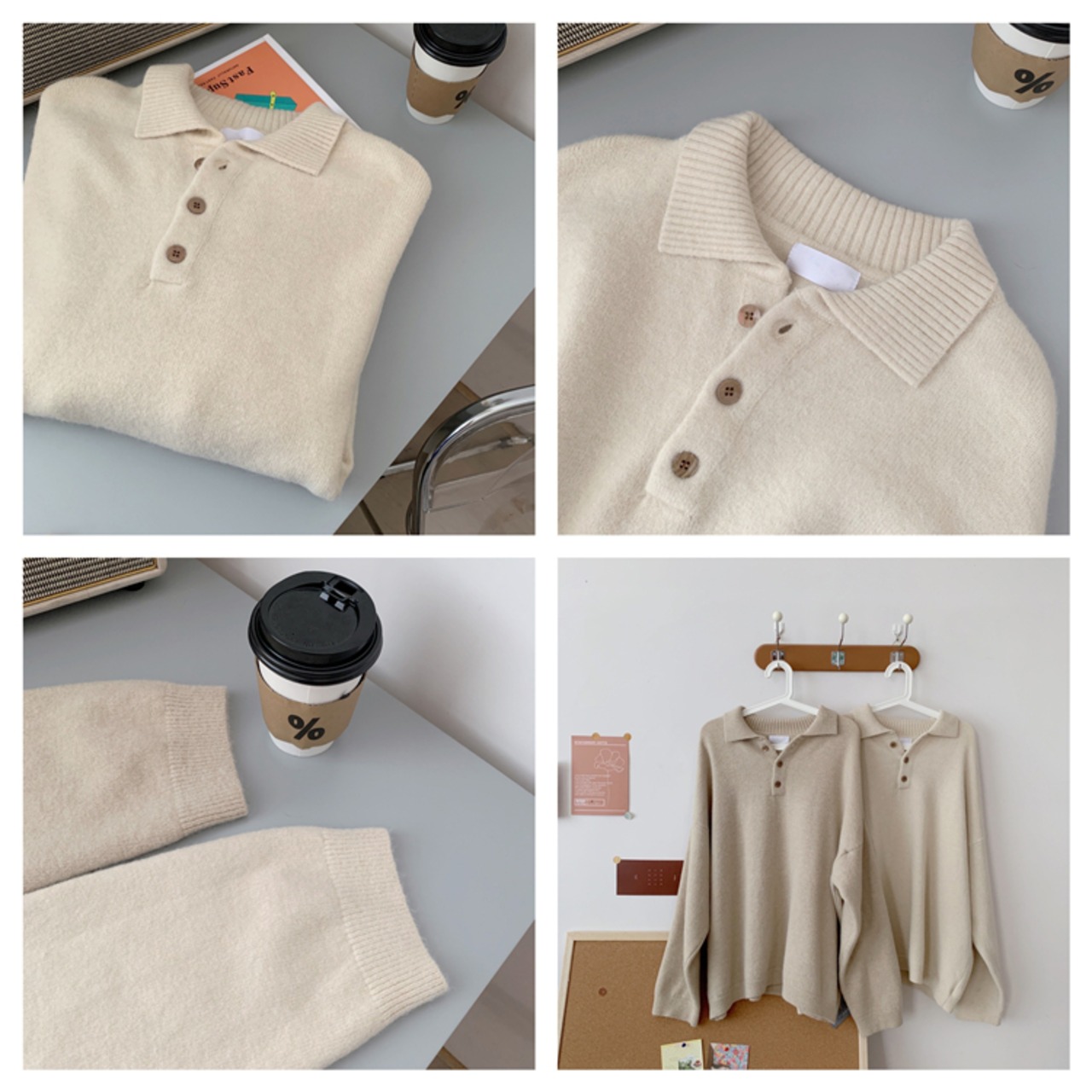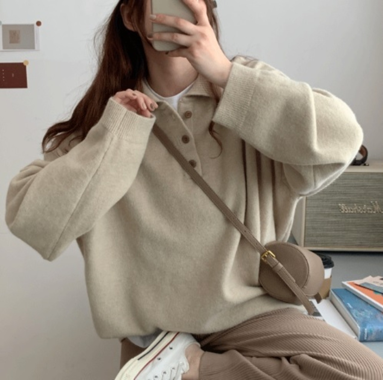 ポロニット トップス ニット 長袖 ルーズ シンプル カジュアル レトロ 韓国ファッション 2color S-2XL