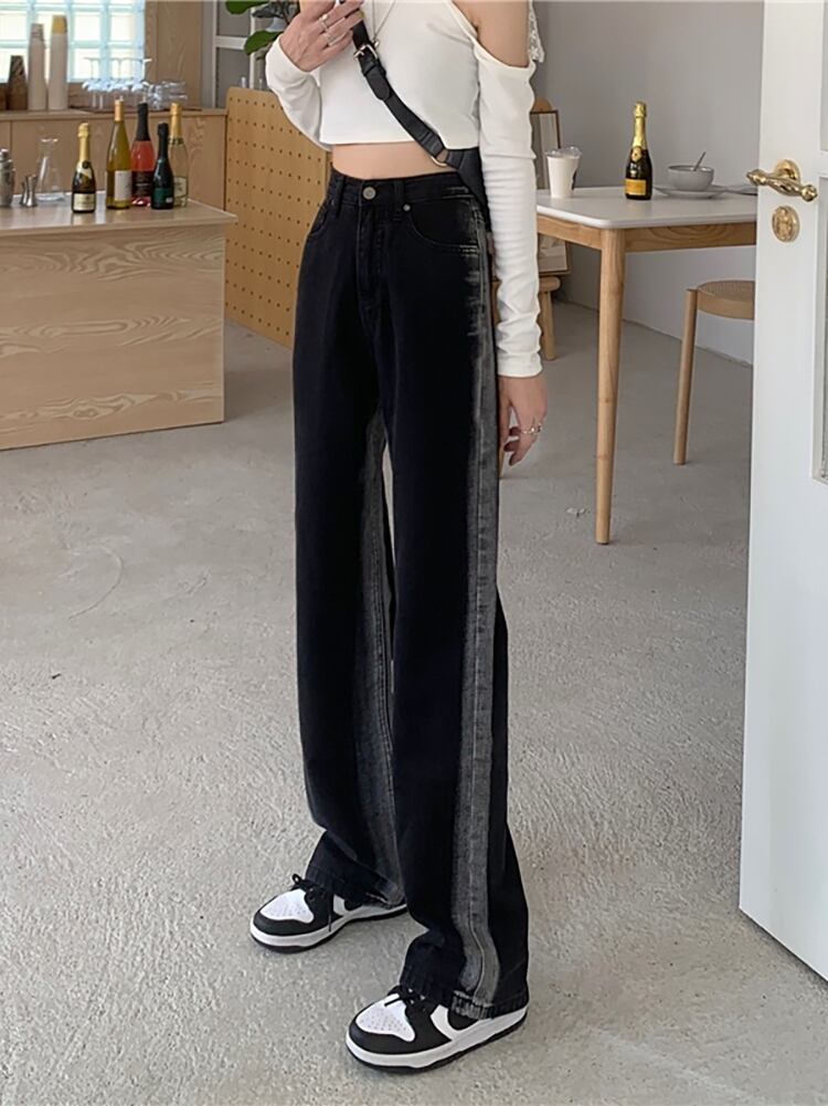 サイドラインデニム デニムパンツ ジーンズ ジーパン ストレート パンツ ボトム ハイウエスト トレンド シンプル カジュアル 韓国ファッション S-XL