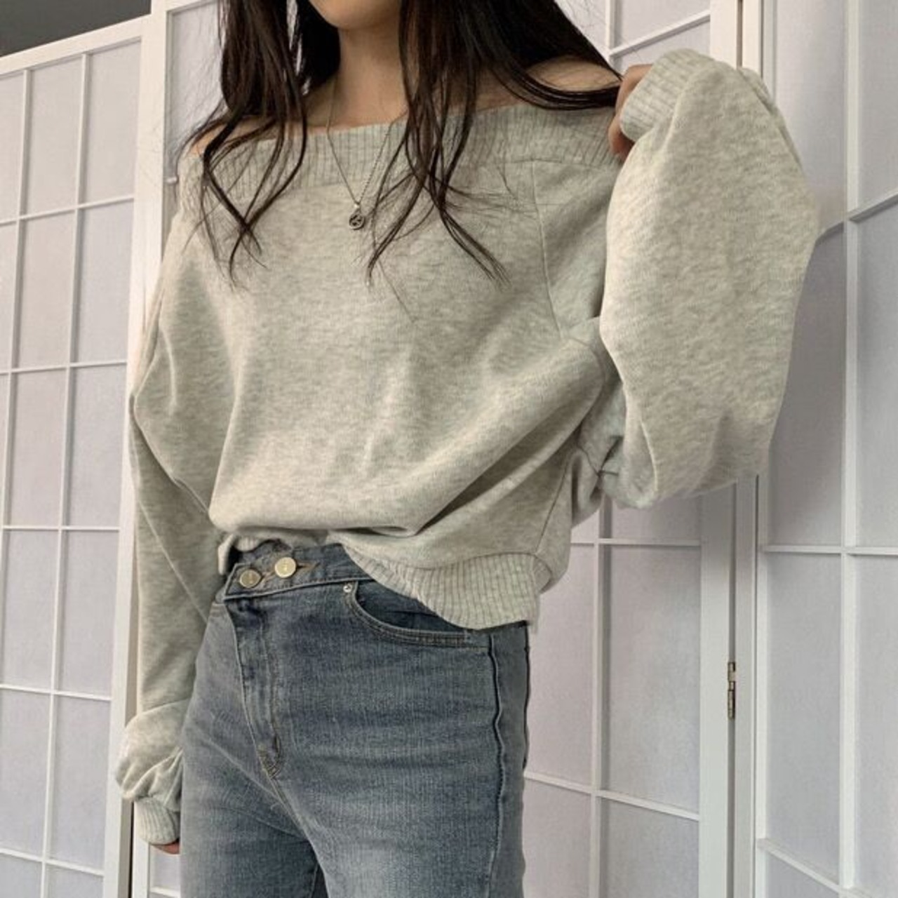 ルーズなシルエットとボリューム袖で華奢見えが叶うオフショルトップス。