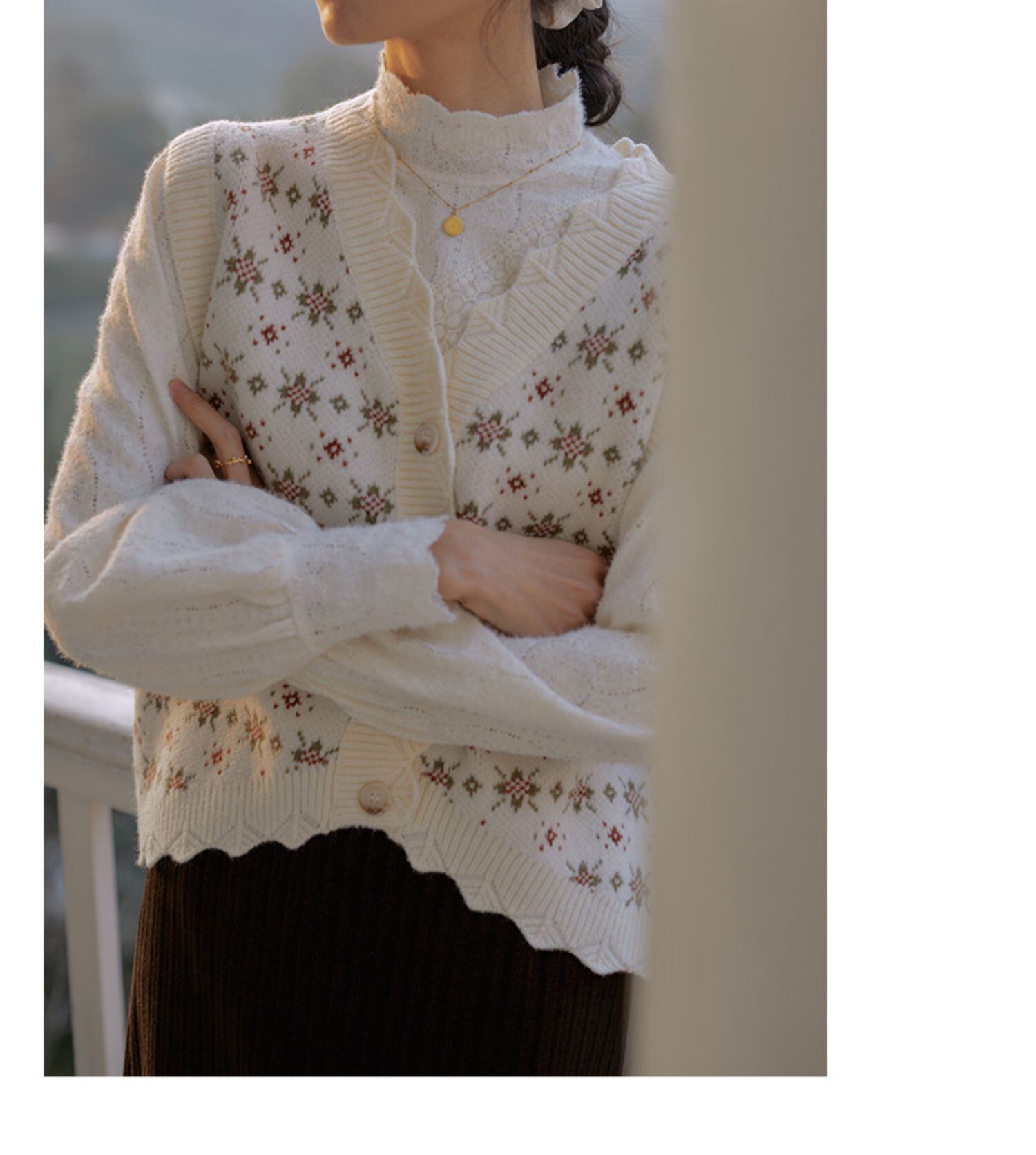 Vネックニットベスト ベスト スカラップ スノーフレーク ノルディック シンプル カジュアル レトロ 韓国ファッション S-2XL