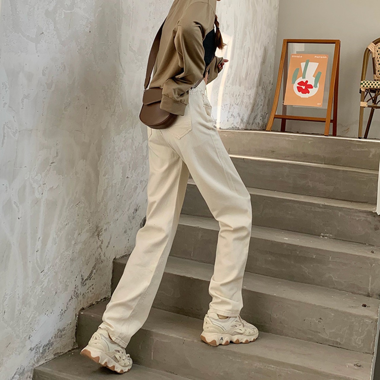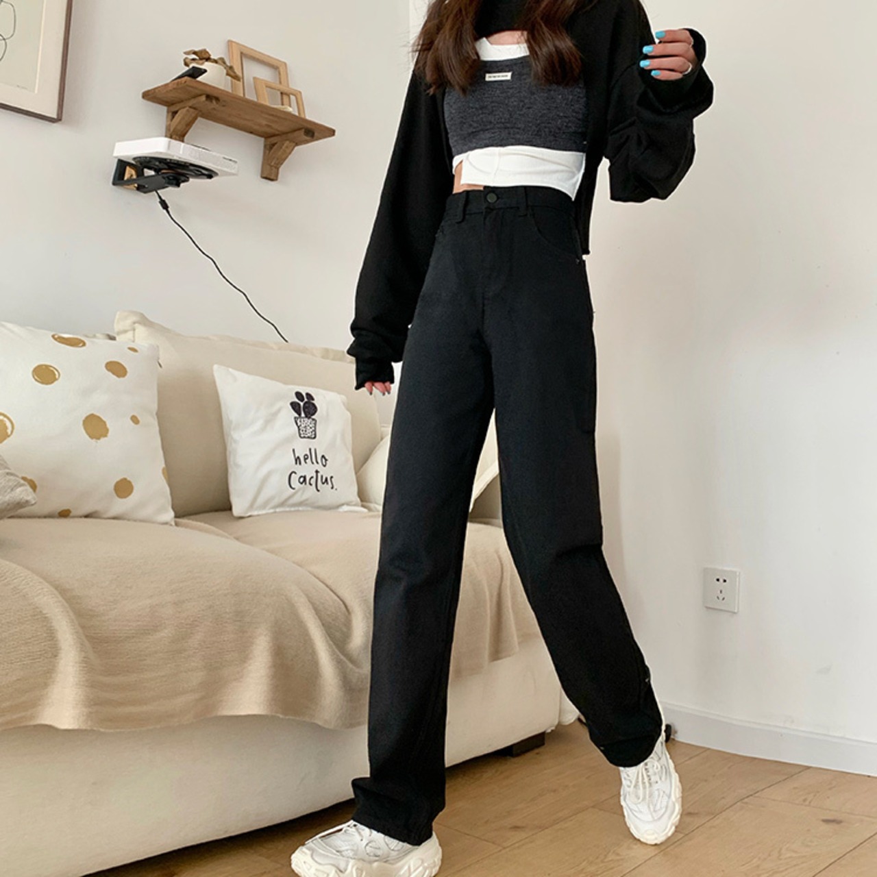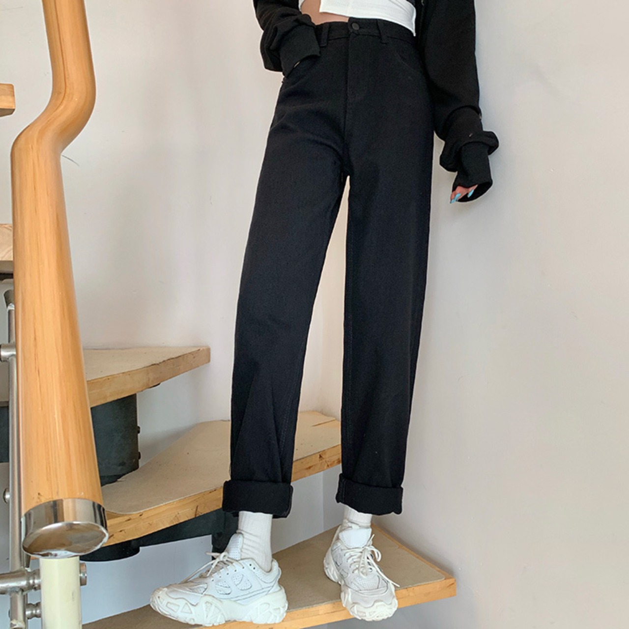 デニムパンツ ロングパンツ ストレート ボトム ハイウエスト ワントーン 無地 きれいめ シンプル カジュアル 韓国ファッション 4color S-XL