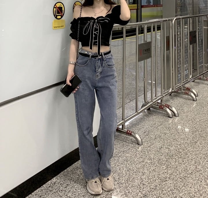 モノトーンリボン トップス オフショルダー レースアップ パフスリーブ ショート ガーリー 甘め レトロ 韓国ファッション S-M