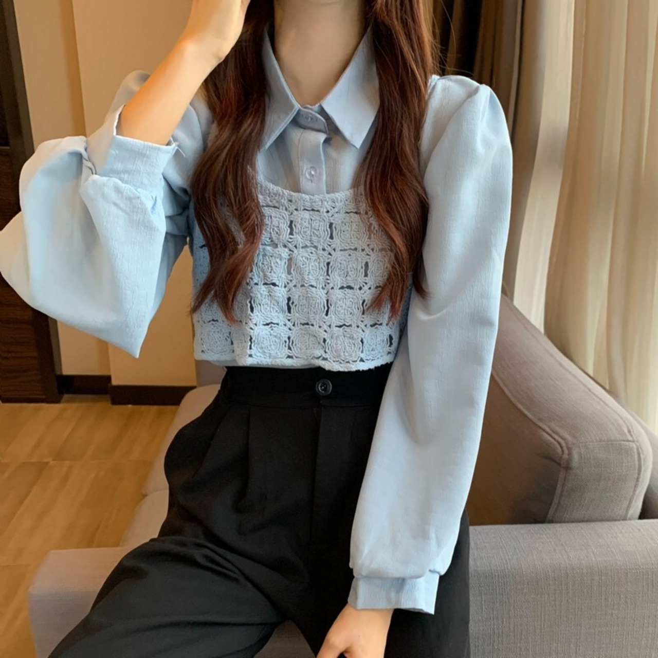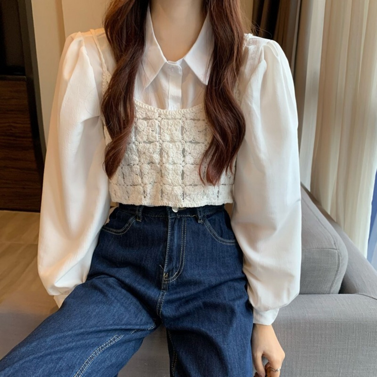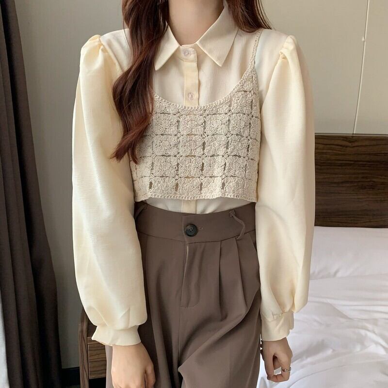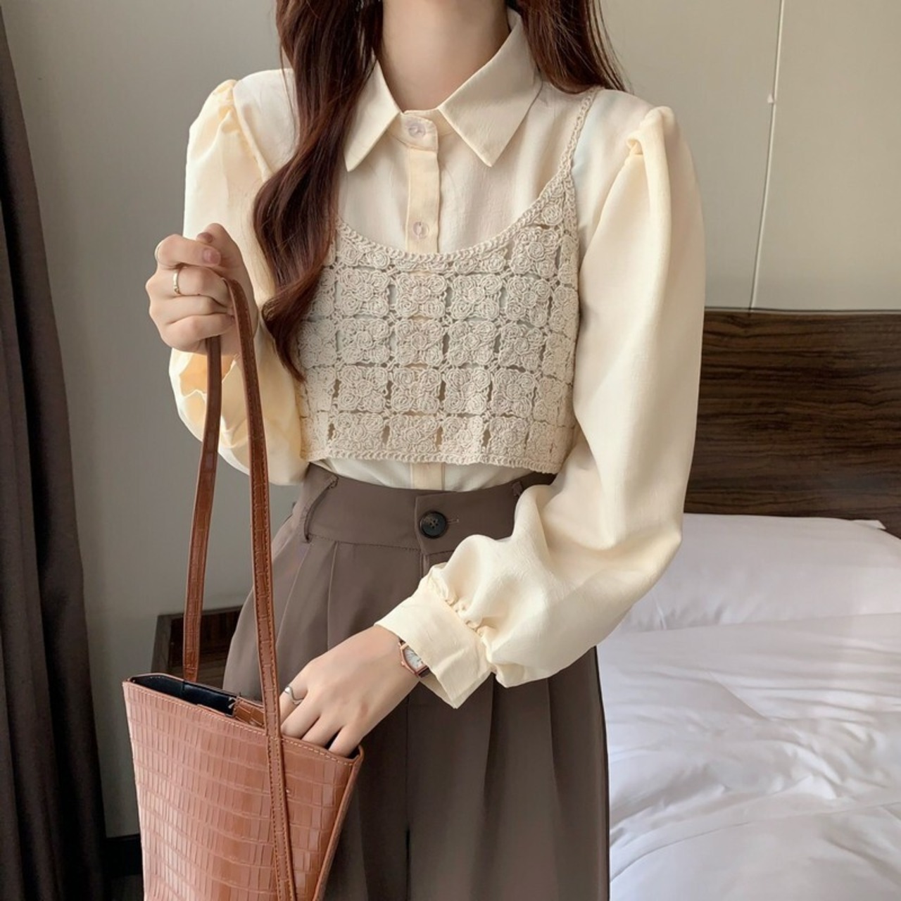 セットアップ デザインブラウス シャツ パフスリーブ かぎ編みレース キャミ ガーリー 大人可愛い レトロ 韓国ファッション 3color
