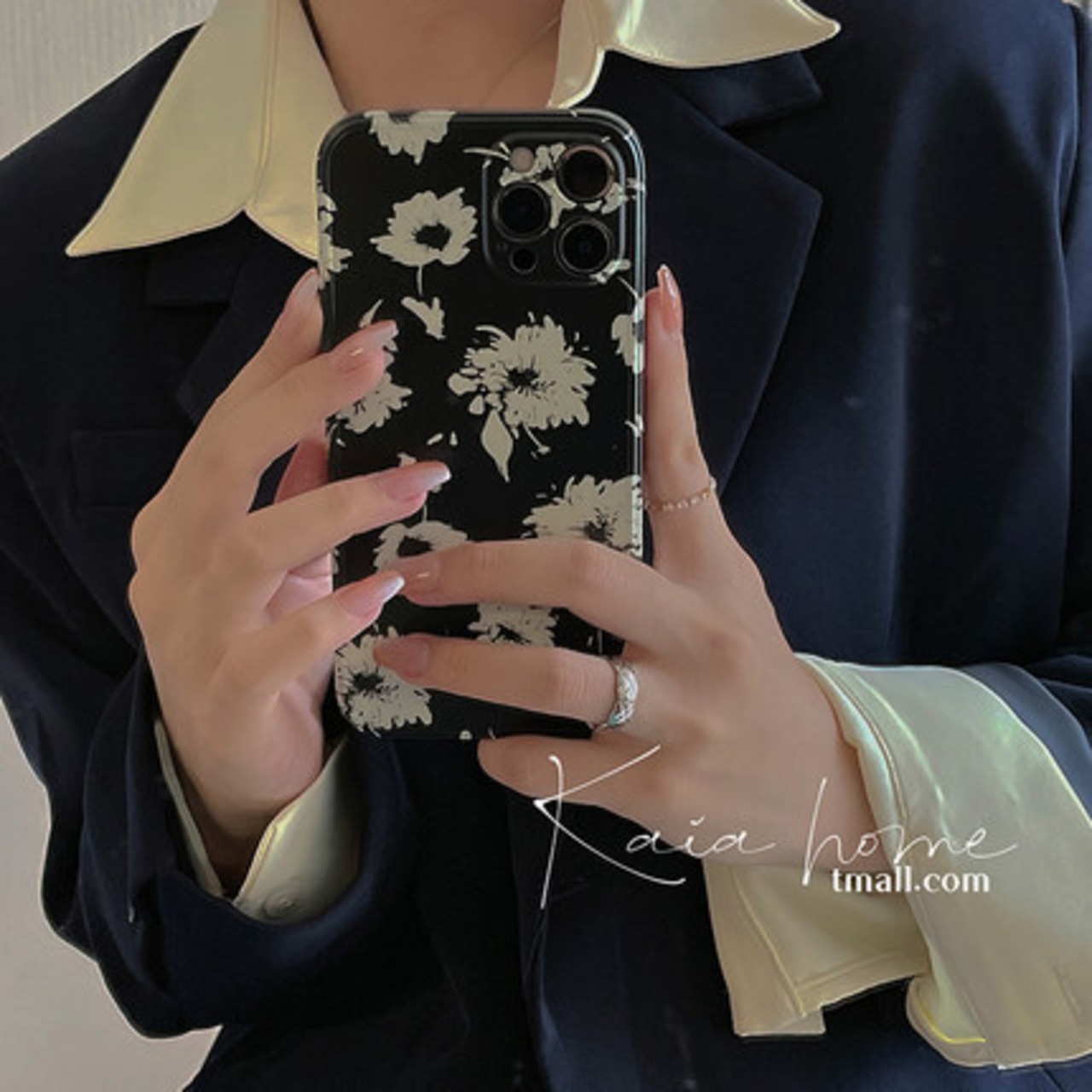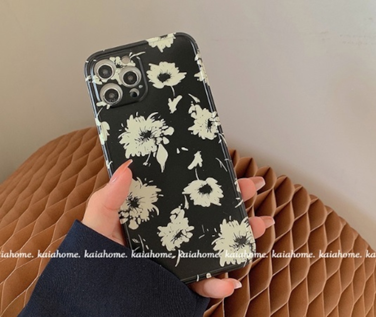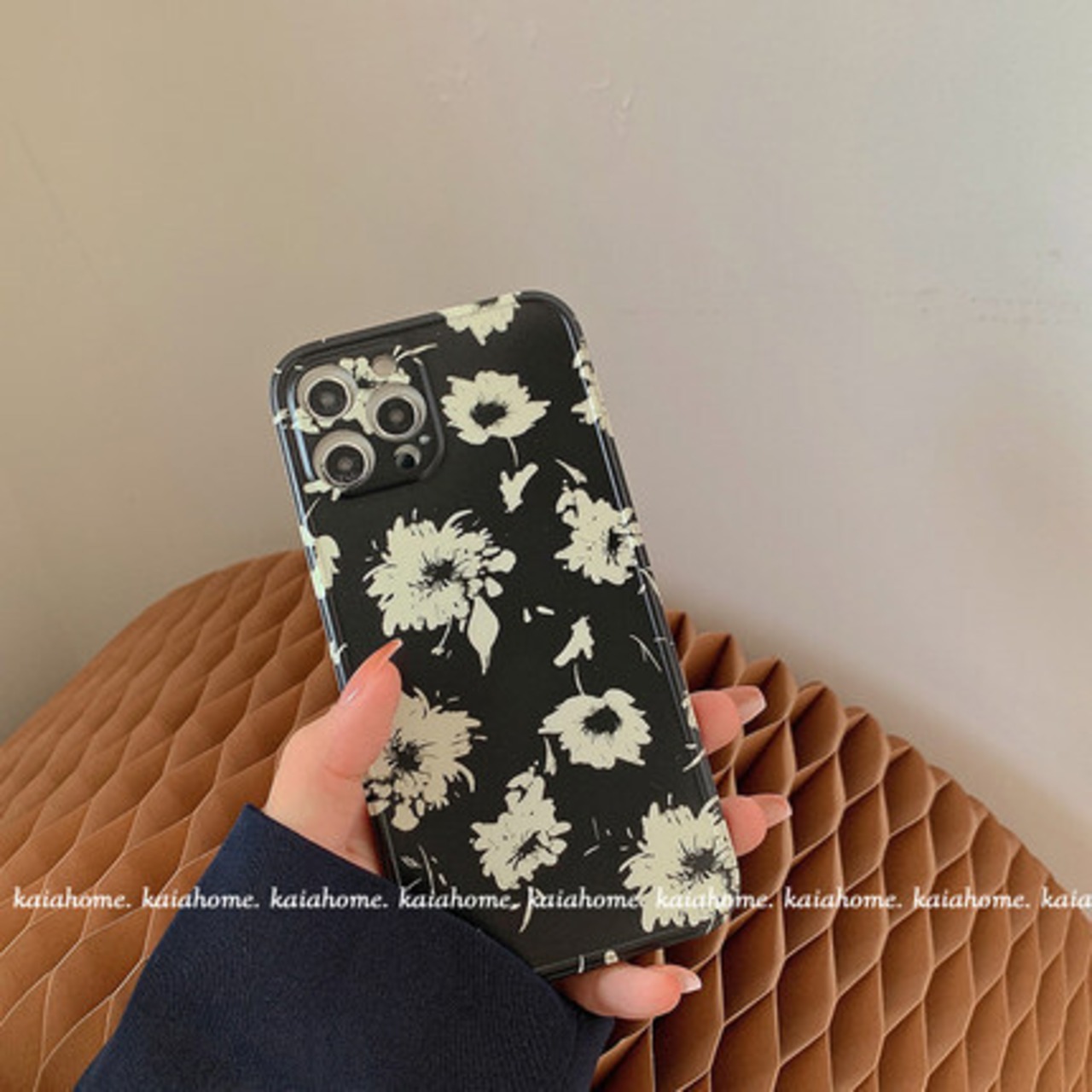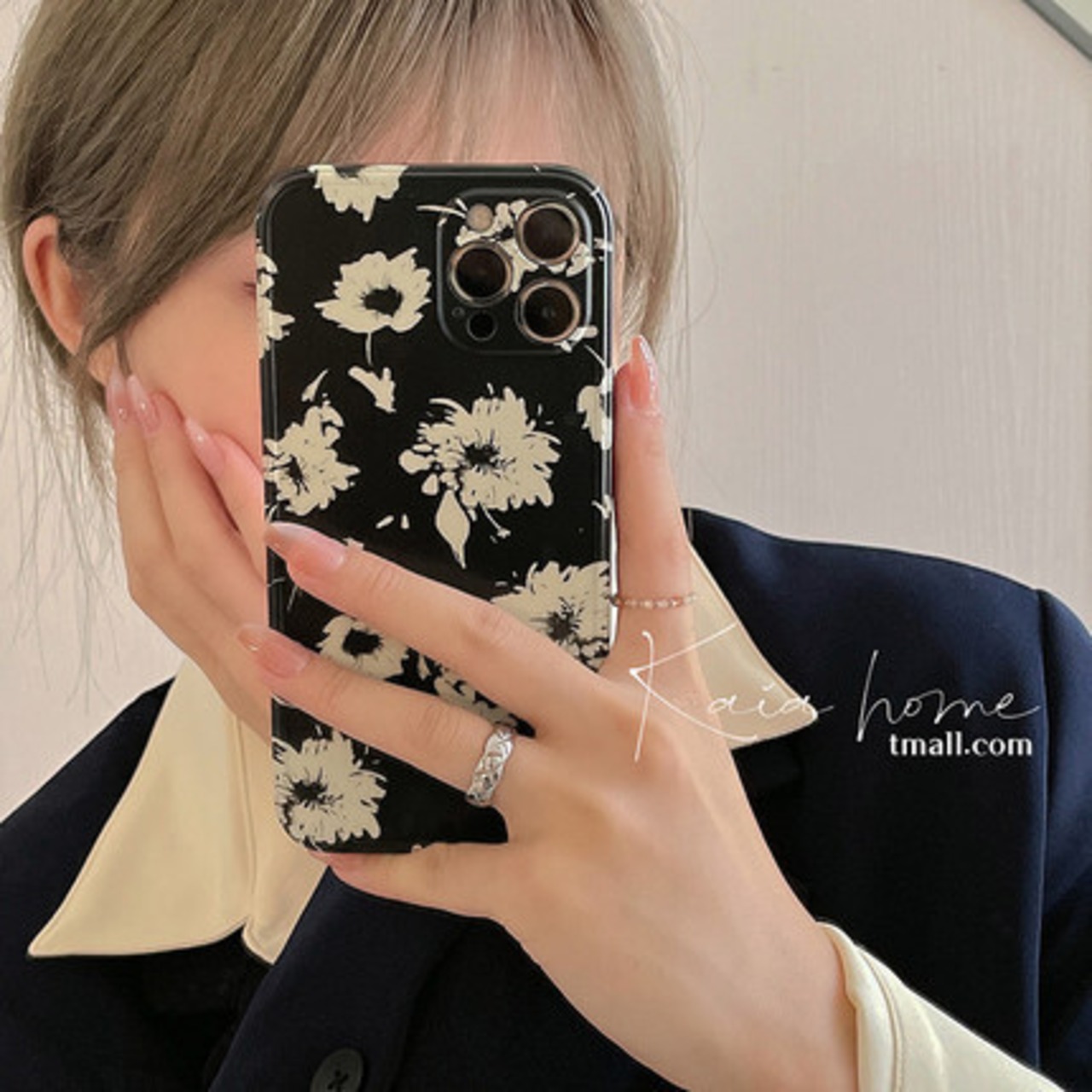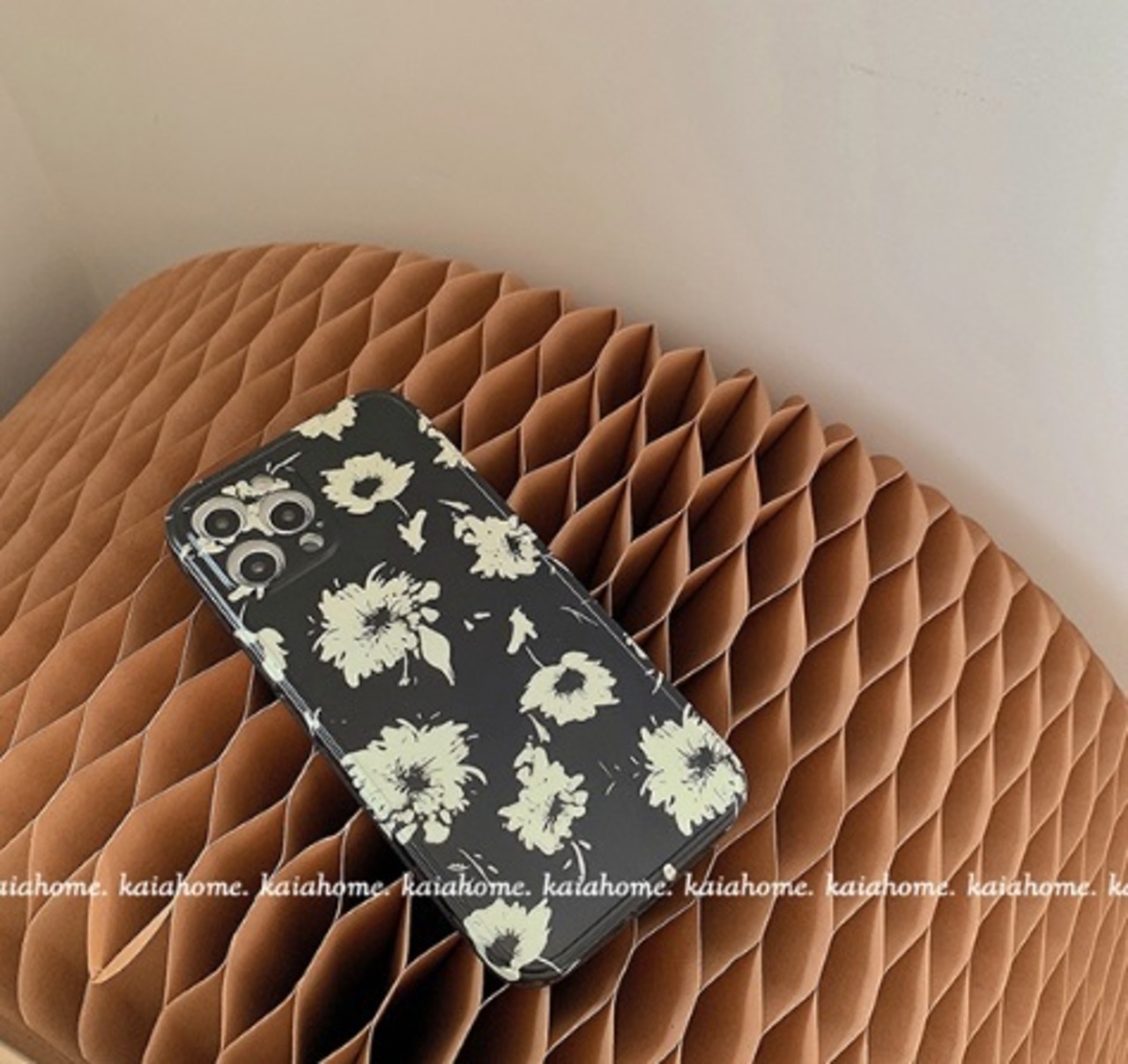 モノトーンで落ち着いた雰囲気のアートフラワースマホケース。