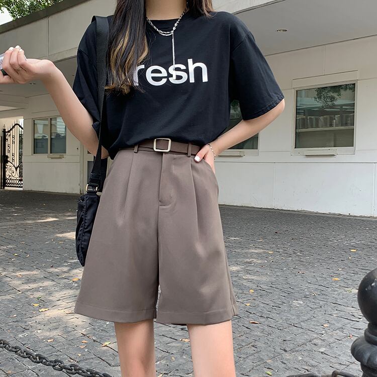 ショートパンツ ボトム ベルト付き ハイウエスト Aライン ワイドレッグ ワントーン 無地 シンプル カジュアル 着回し 韓国ファッション 2color S-XL
