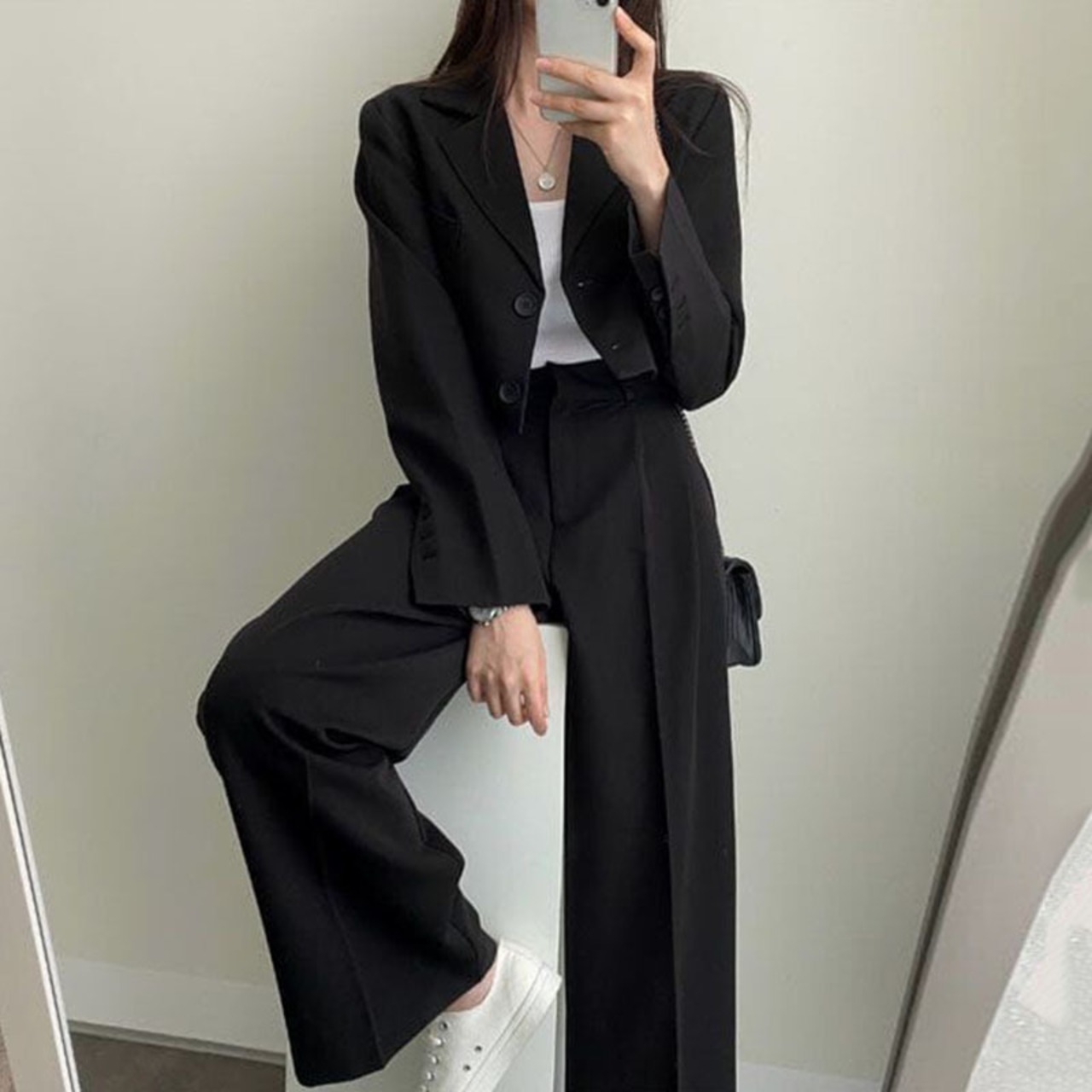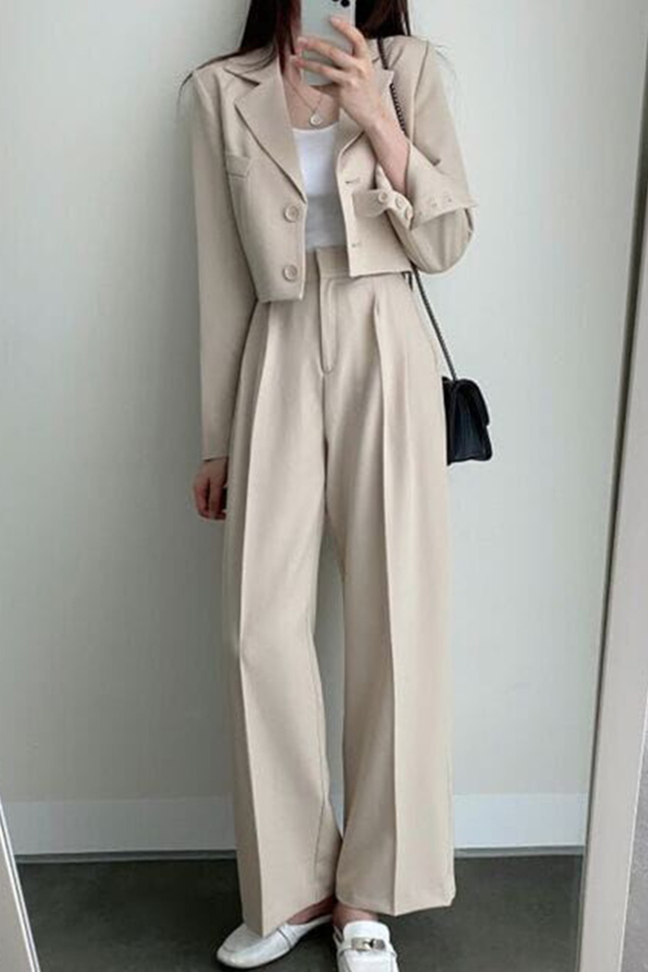 カジュアルなクロップドジャケット+スラックスパンツのセットアップ。