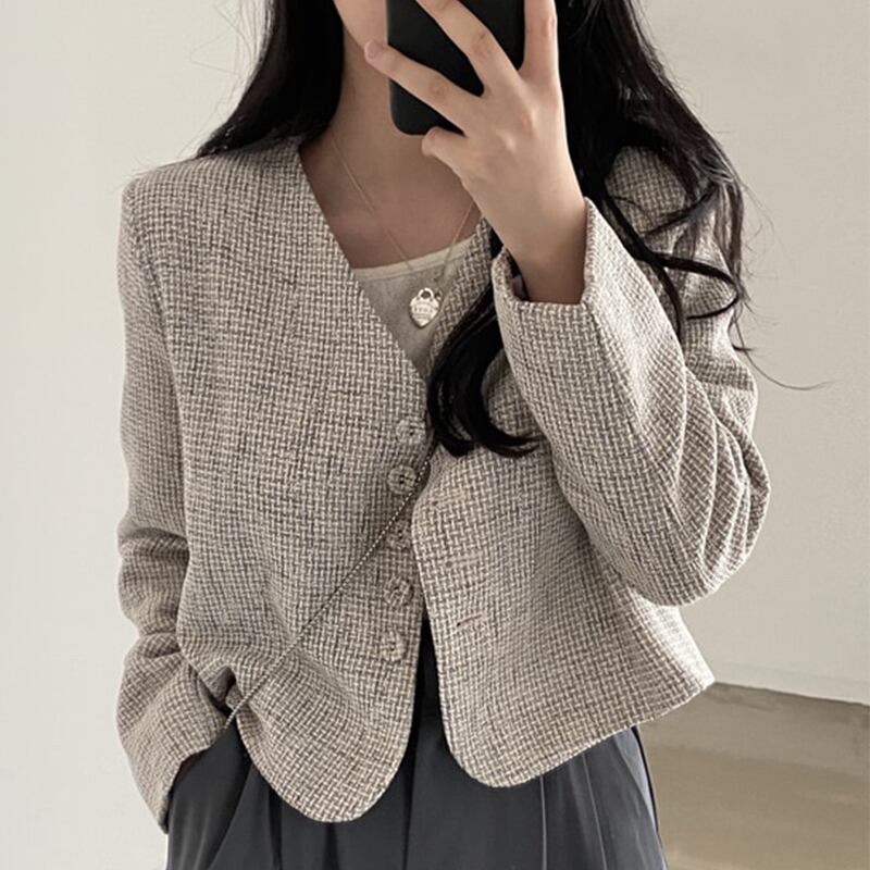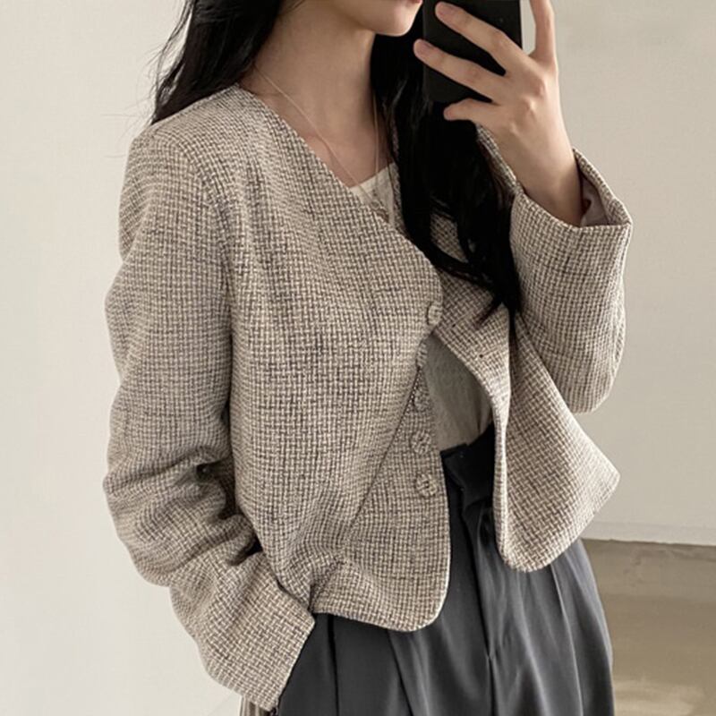 ジャケット アウター ショート丈 チェック ボタン レトロ きれいめ 大人可愛い 韓国ファッション