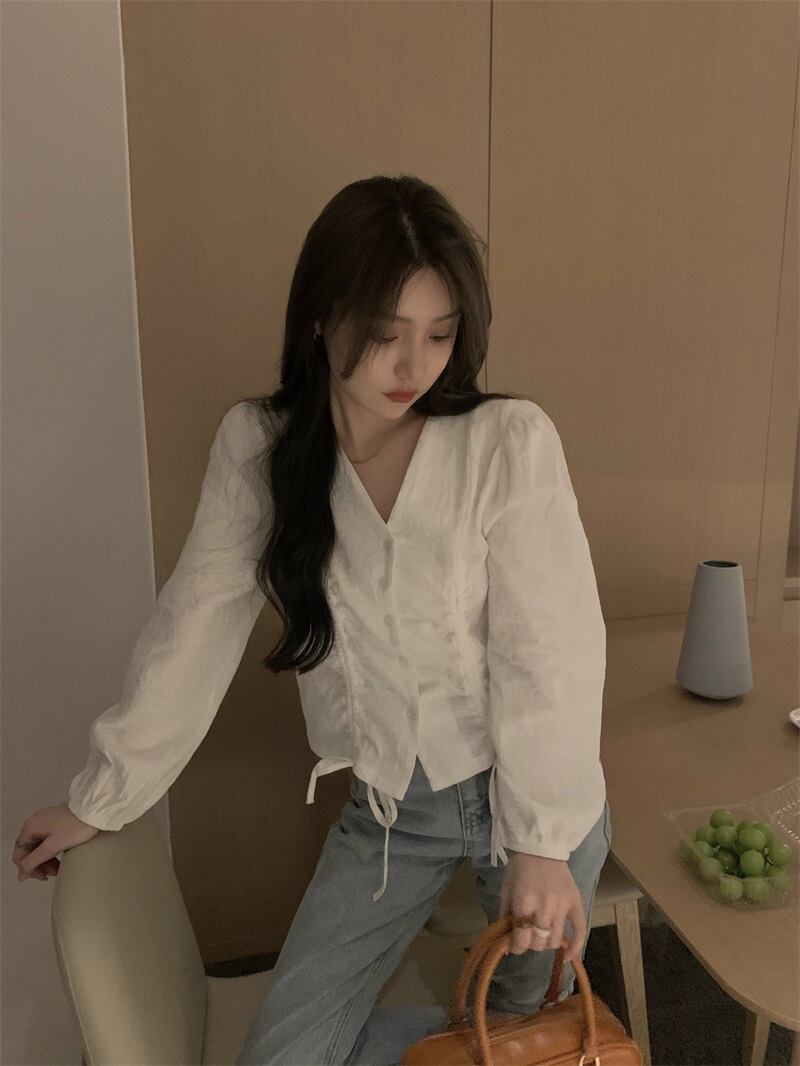ドロストリボンブラウス Vネック パフスリーブ トップス ガーリー 甘め レトロ 韓国ファッション 2color