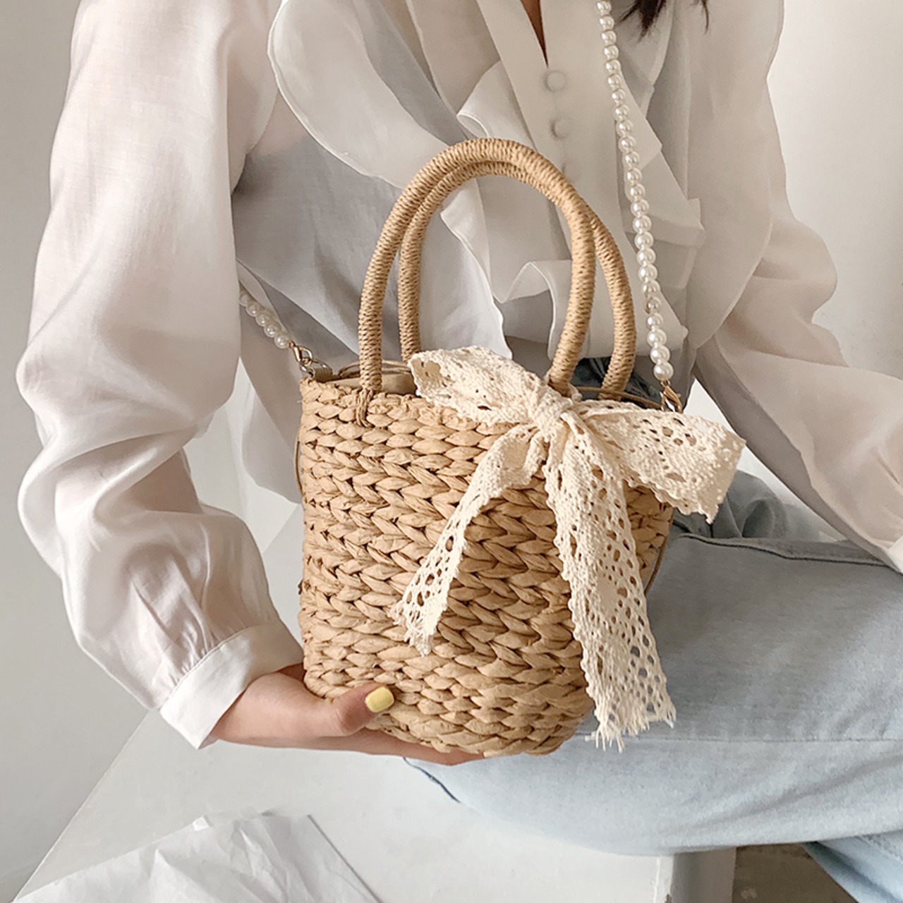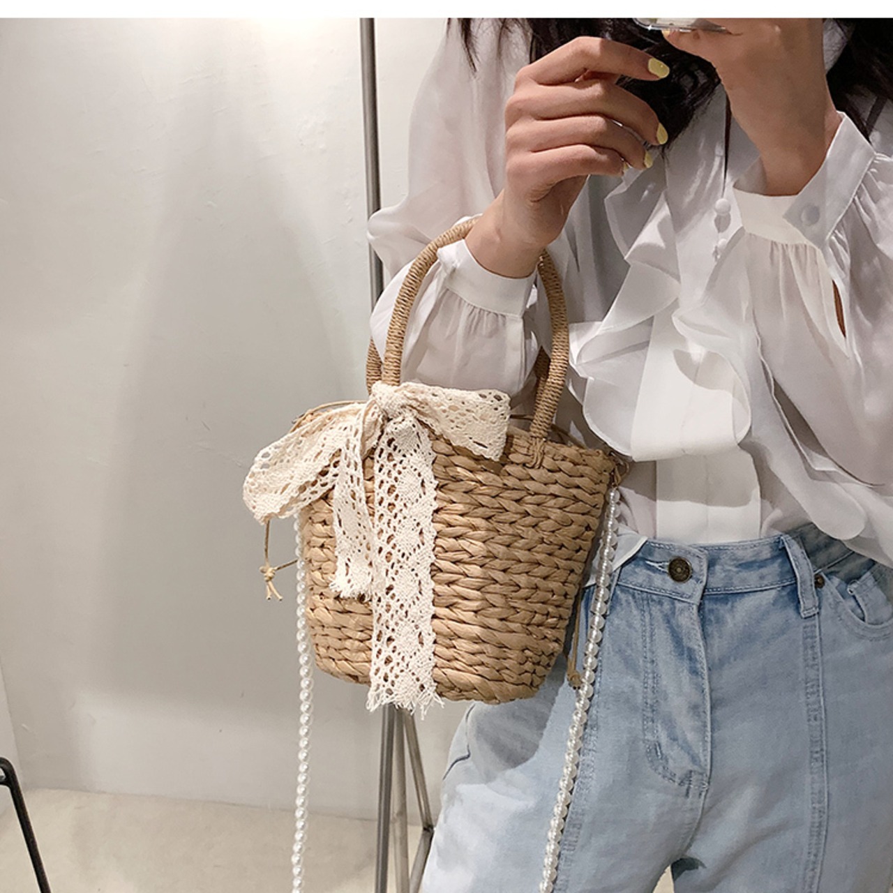 ストローバッグ パールショルダー ハンドバッグ 2way かぎ編みレースリボン かごバッグ ショルダー バッグ かばん 大人可愛い フェミニン お出かけ デート 韓国ファッション 2color