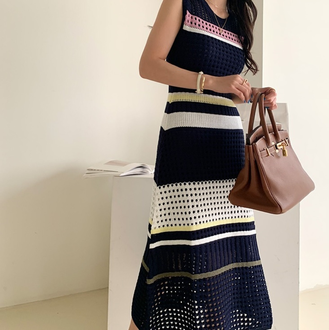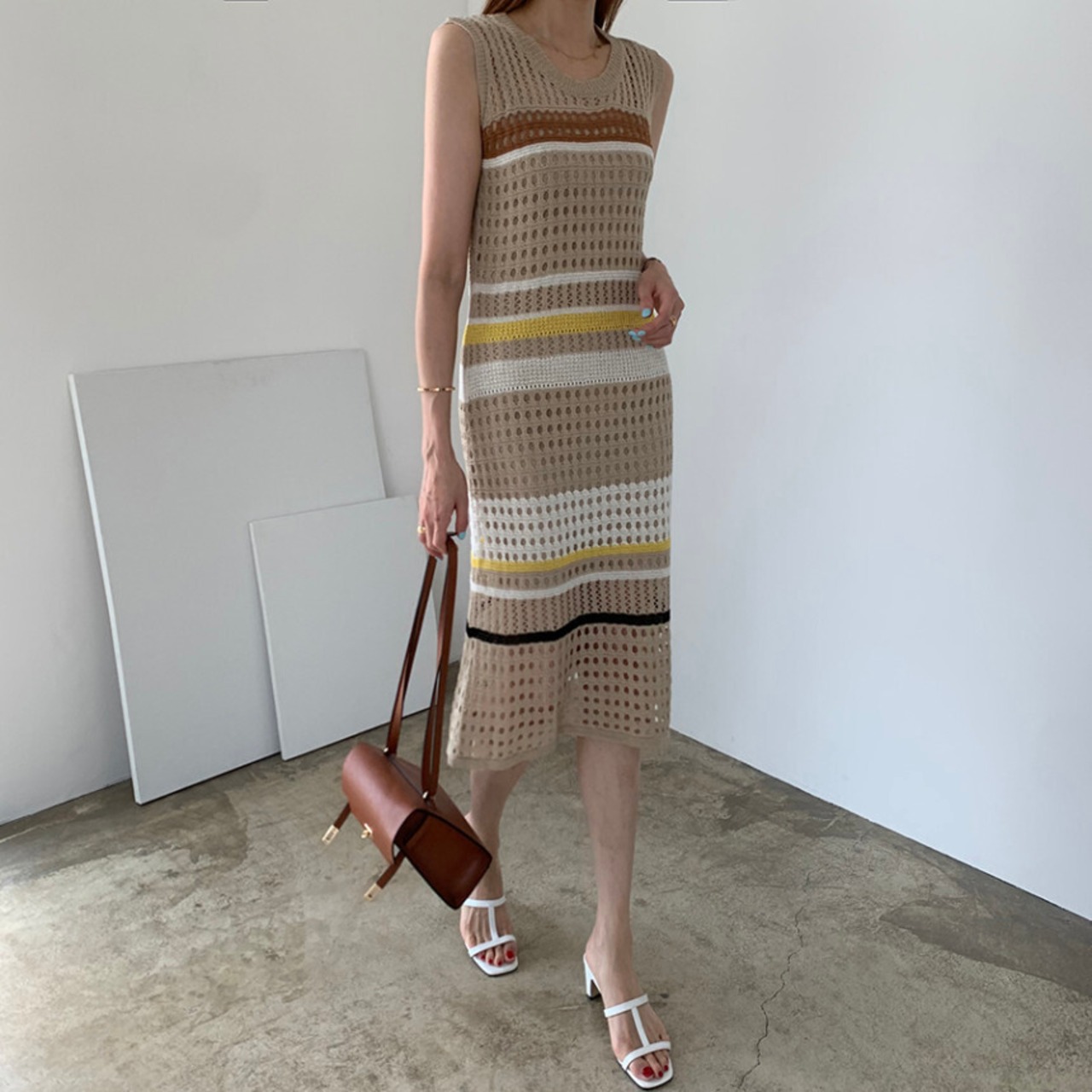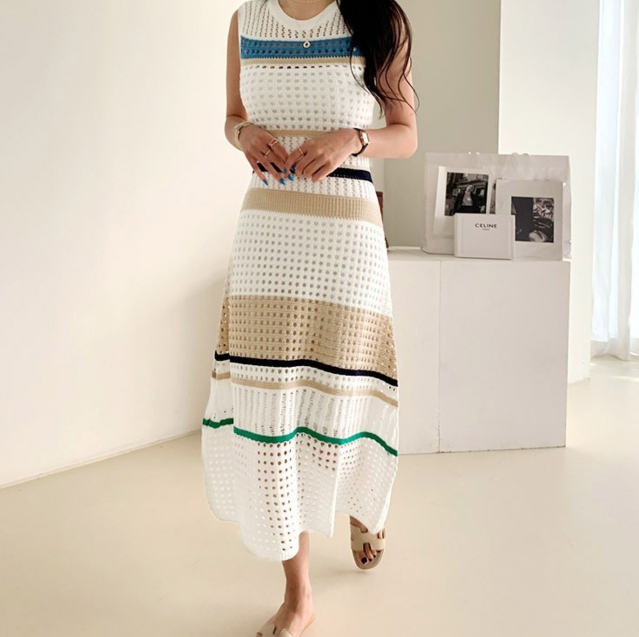マルチカラーストライプワンピ ワンピ 配色 ロング ノースリーブ マルチカラー シンプル きれいめ フェミニン レトロ 韓国ファッション 3color