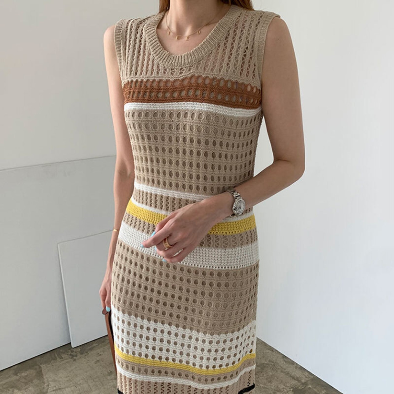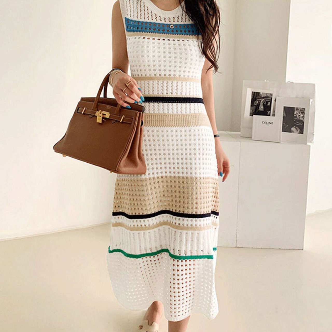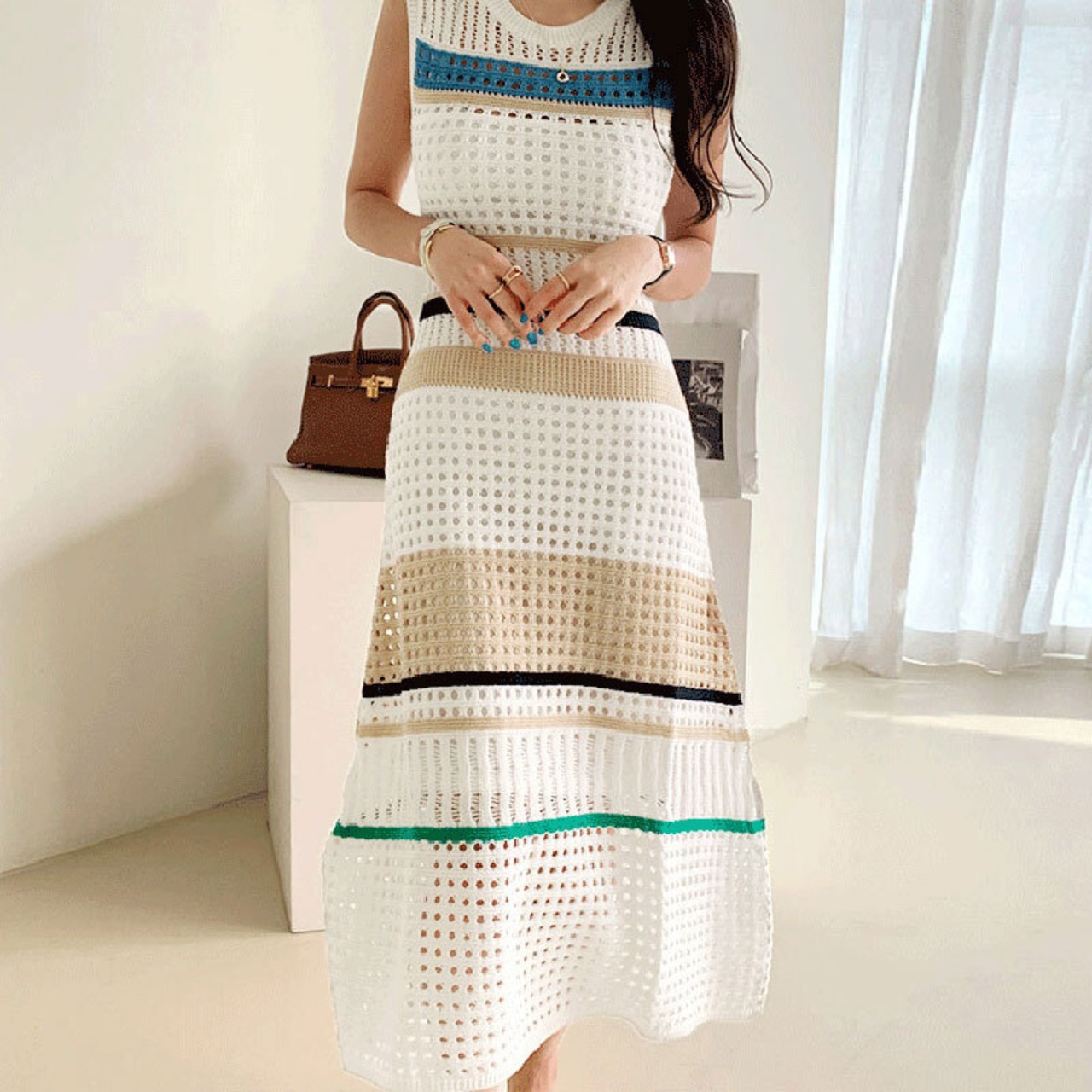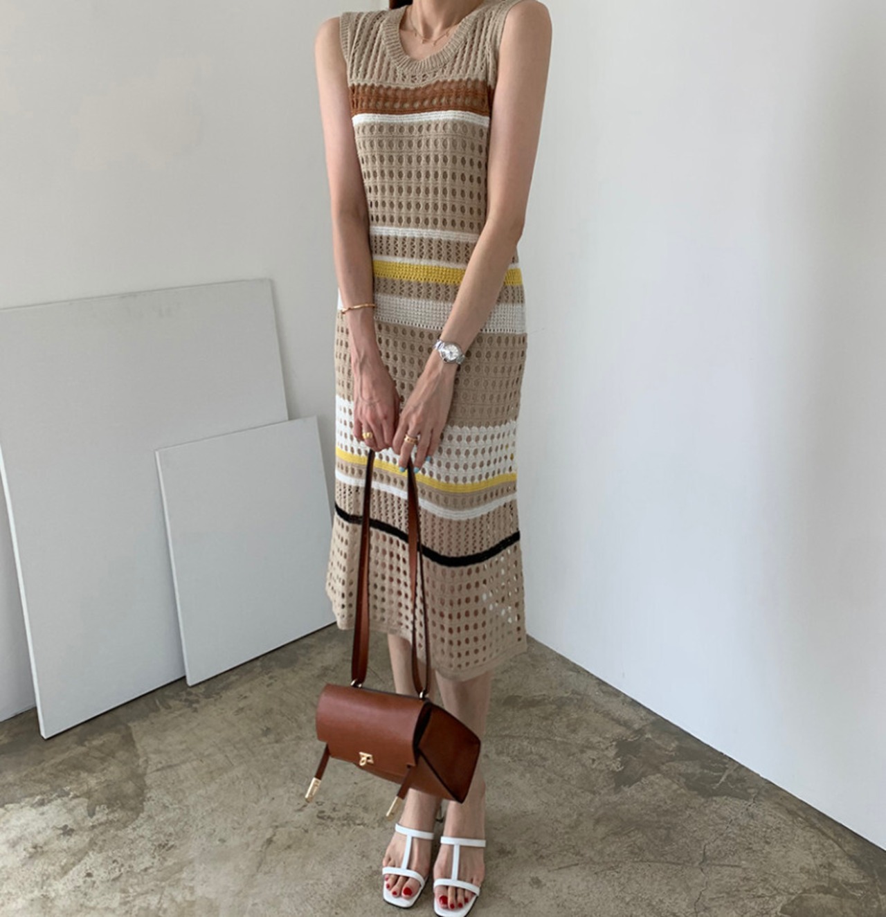 マルチカラーストライプワンピ ワンピ 配色 ロング ノースリーブ マルチカラー シンプル きれいめ フェミニン レトロ 韓国ファッション 3color