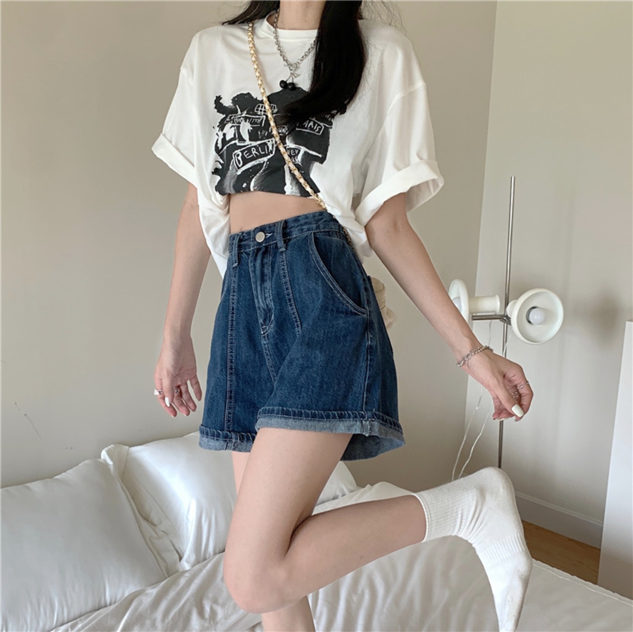 デニムショートパンツ ボトム ハイウエスト Aライン ワイドレッグ ワントーン 無地 シンプル カジュアル 着回し 韓国ファッション 4color S-XL