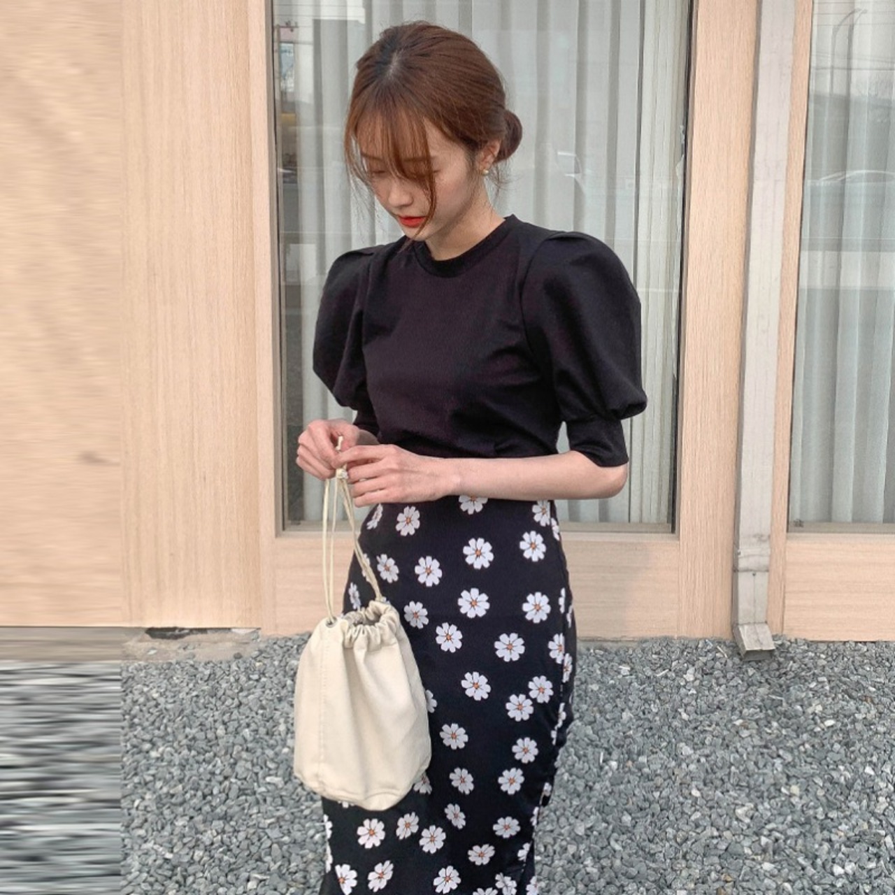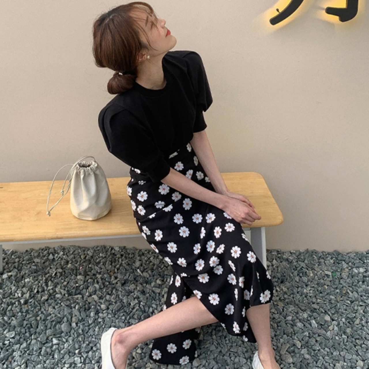 セットアップ ツーピース 上下セット パフスリトップス フラワースカート デイジー 花柄 フィッシュテール 大人可愛い 韓国ファッション 2color