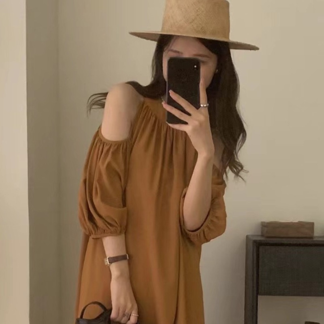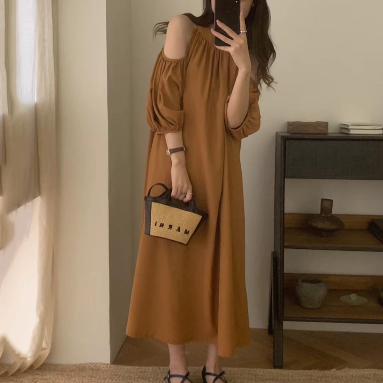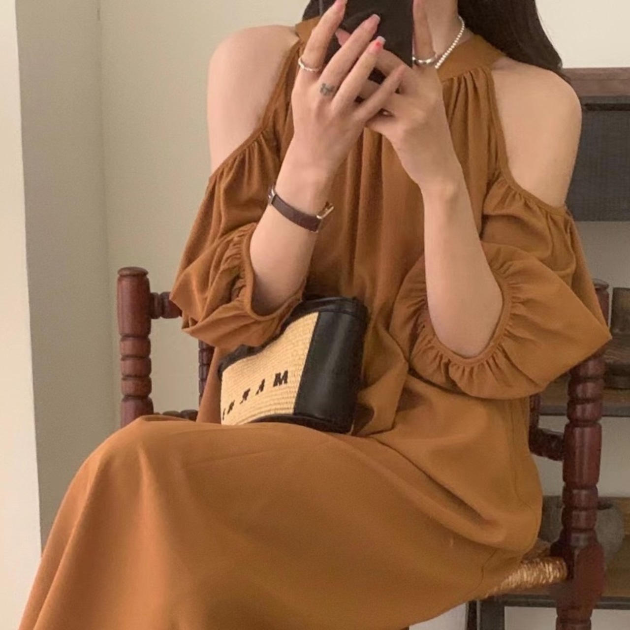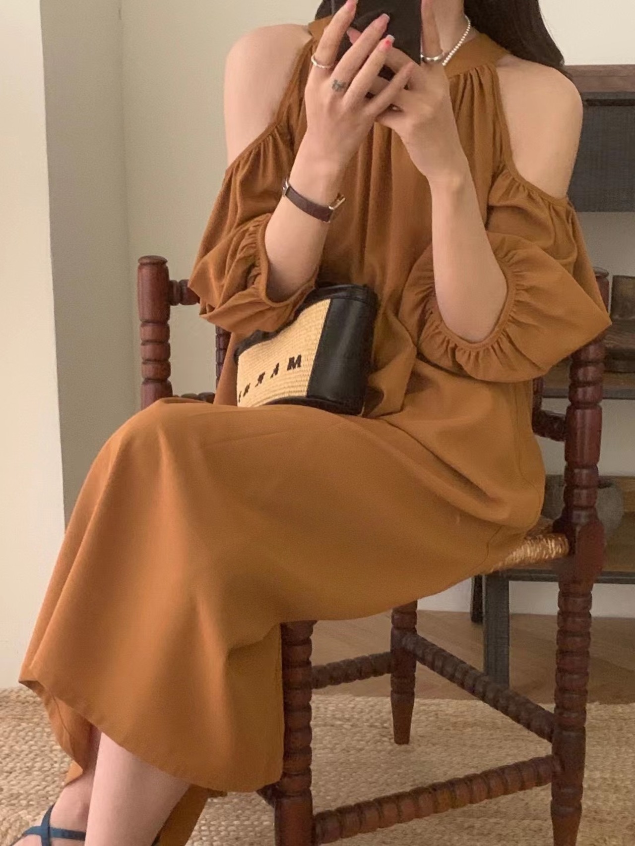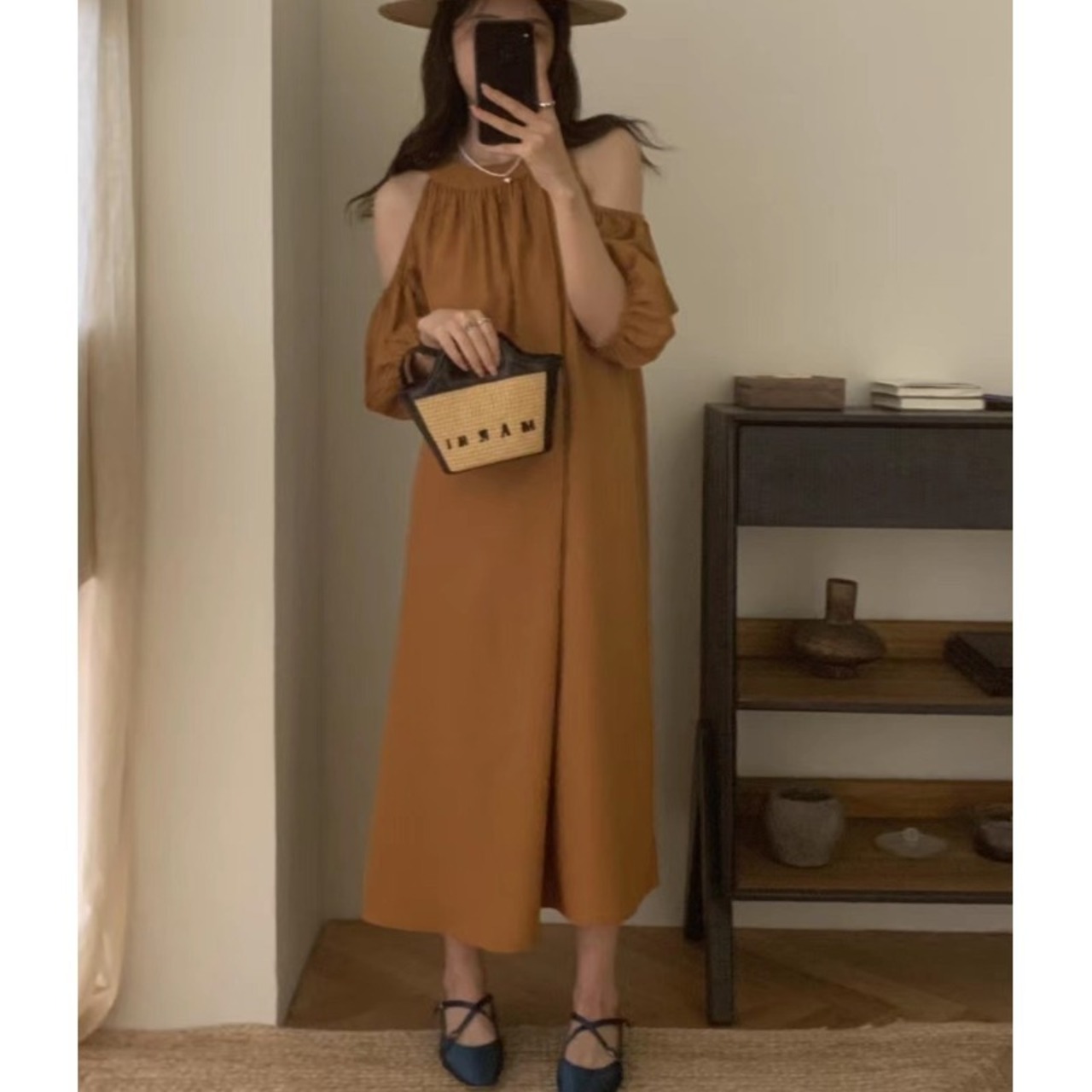 オープンショルダーワンピース ワンピ ワントーン 無地 ロング きれいめ シンプル デート 韓国ファッション