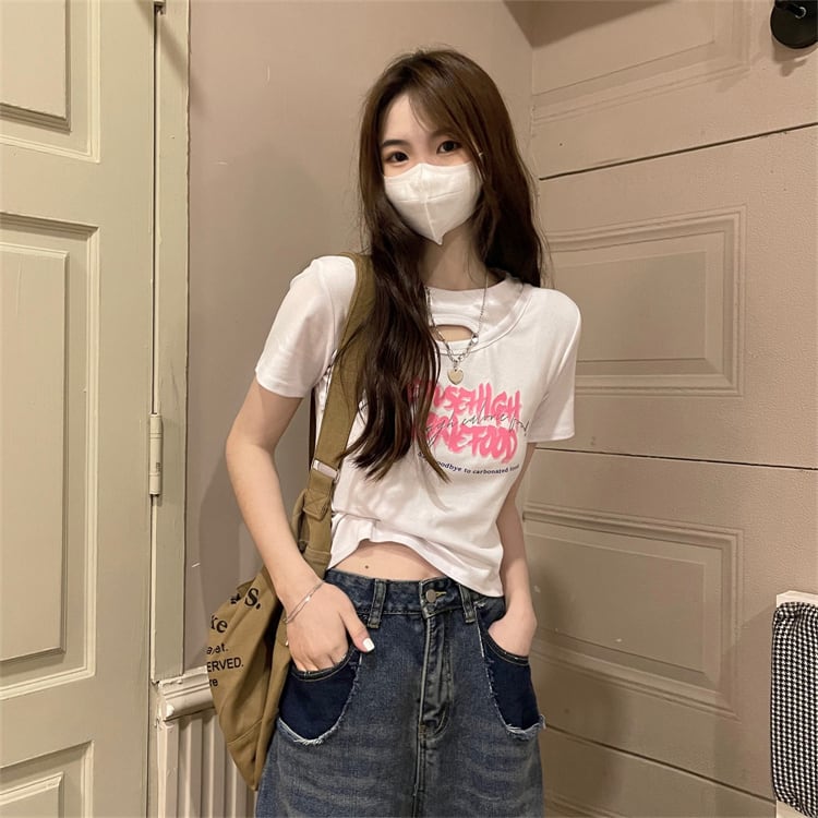 カットアウトTシャツ Tシャツ トップス 半袖 大人可愛い カジュアル 韓国ファッション 2color