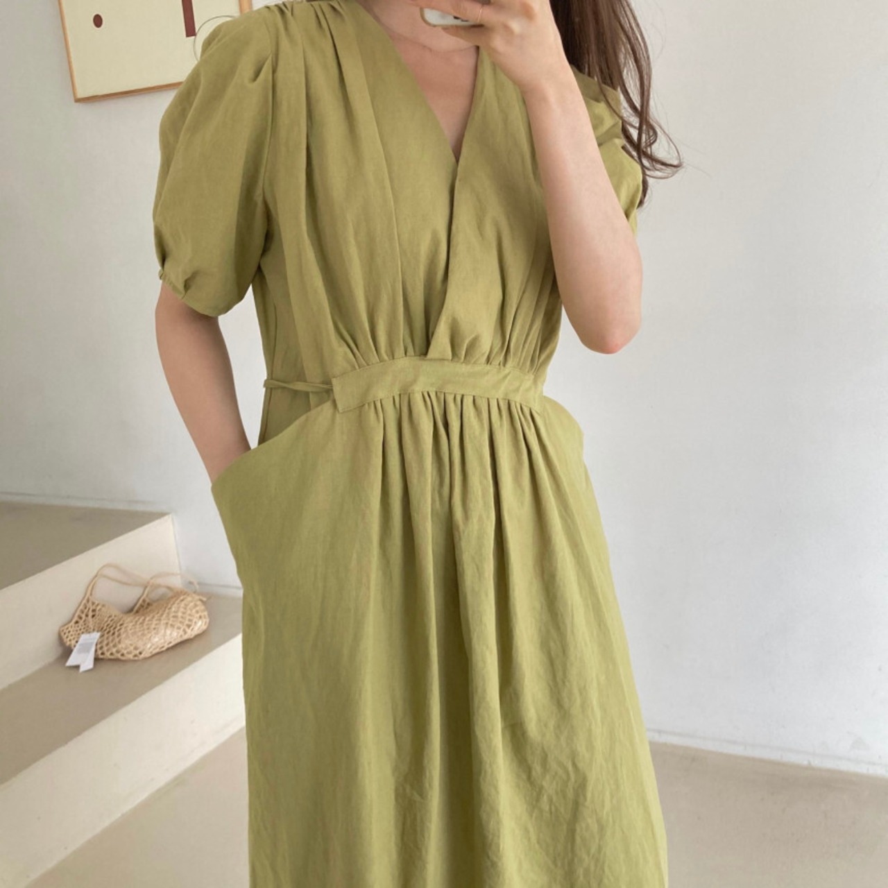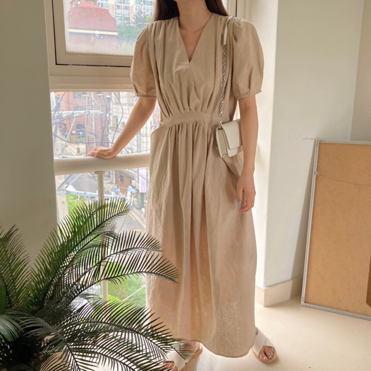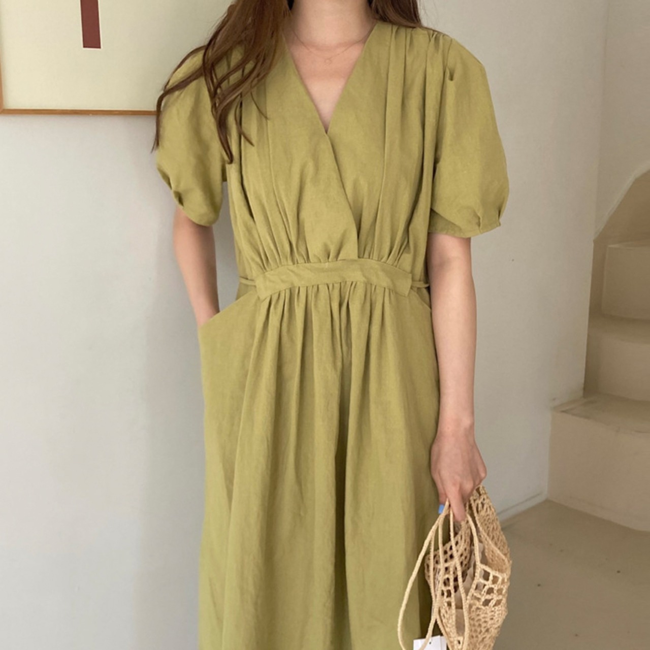 Vネックワンピース ロングワンピース Vネック パフスリーブ ガーリー 大人可愛い レトロ 韓国ファッション 2color S-L