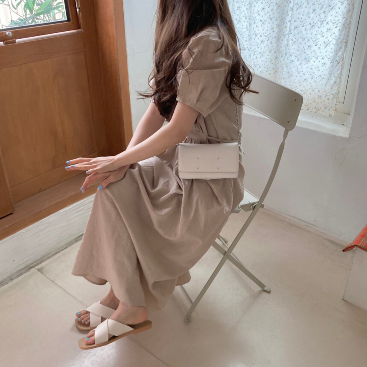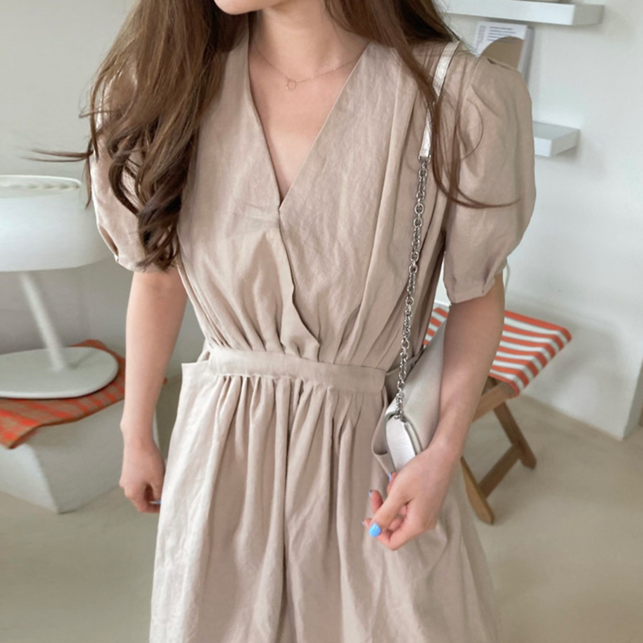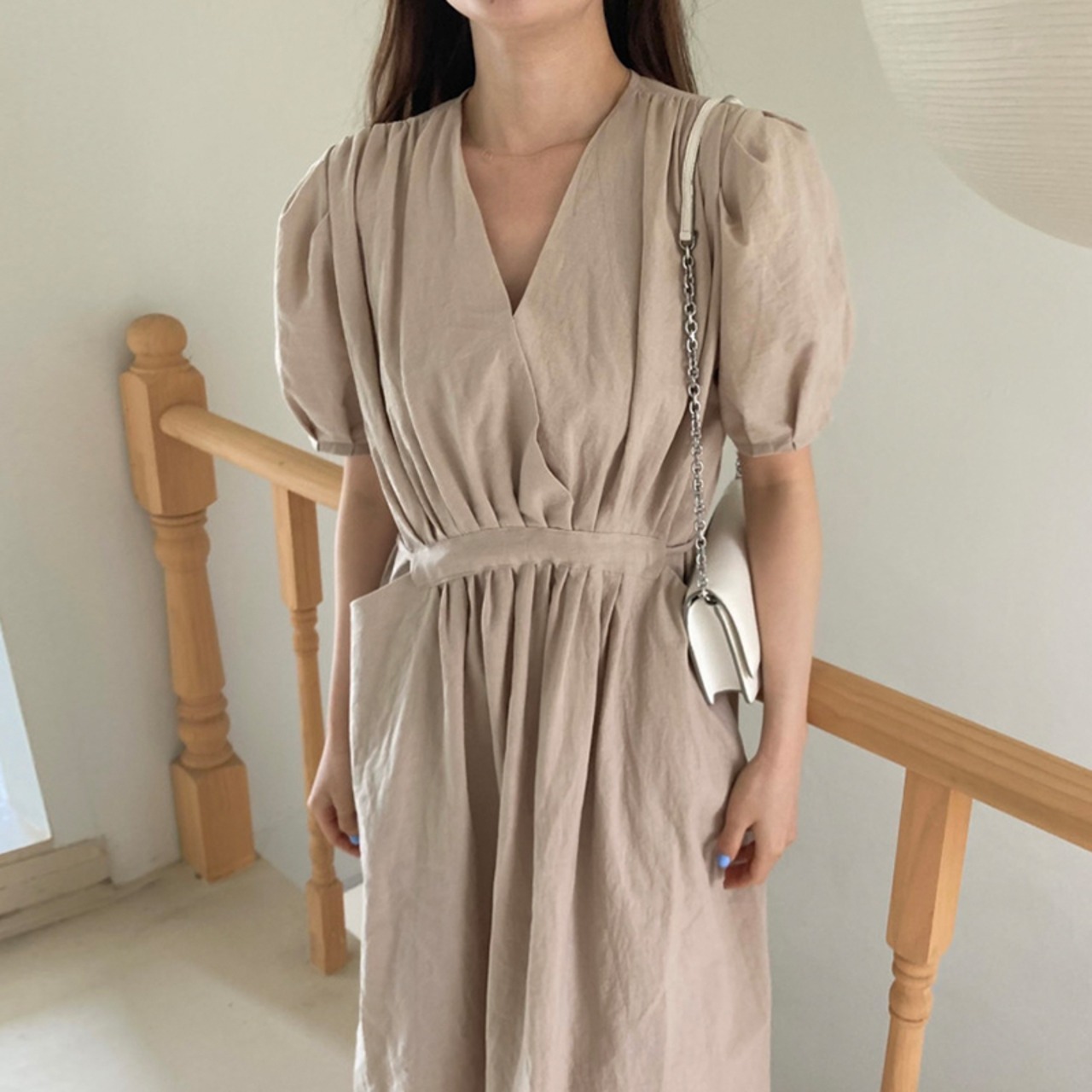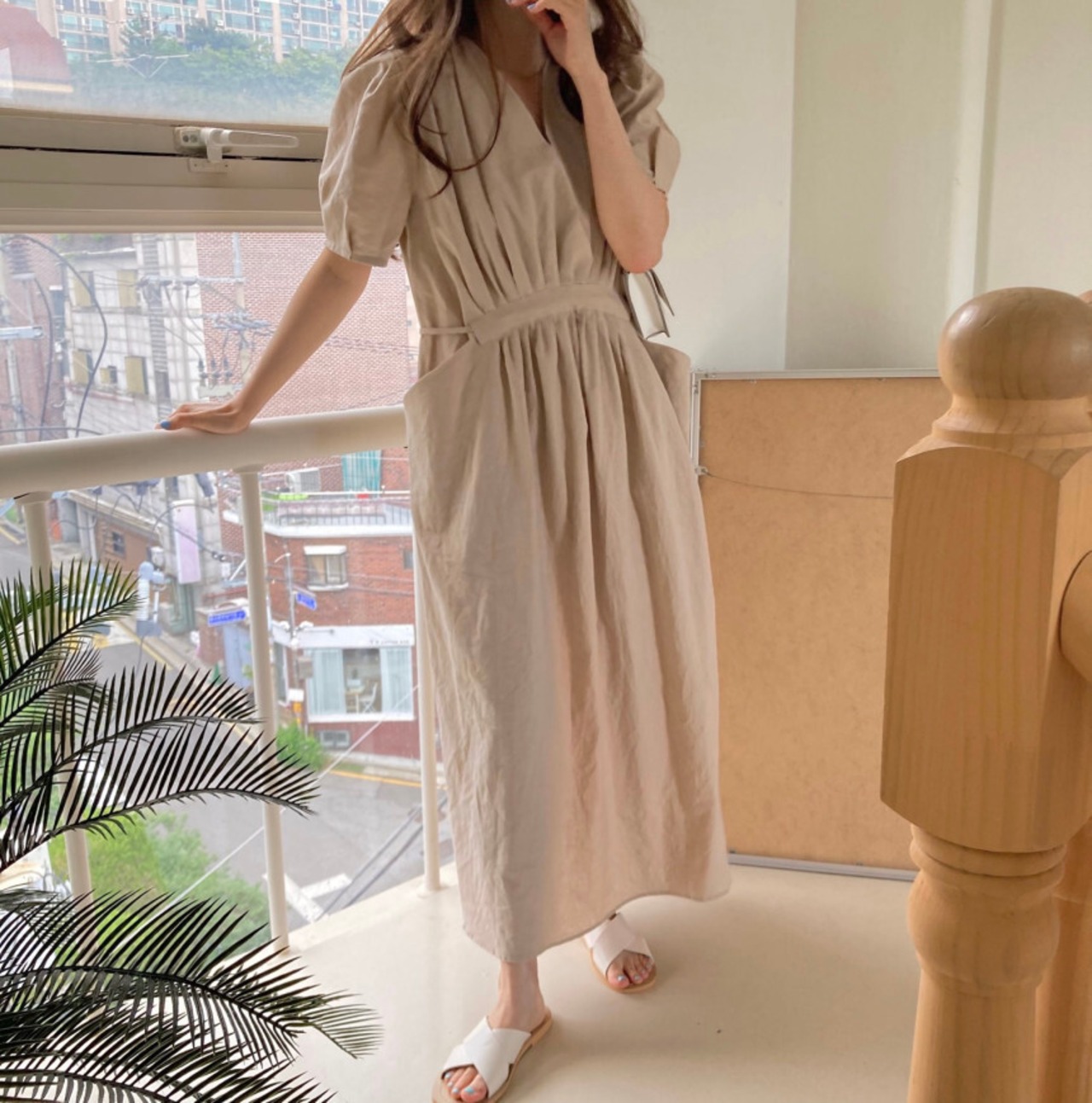 Vネックワンピース ロングワンピース Vネック パフスリーブ ガーリー 大人可愛い レトロ 韓国ファッション 2color S-L
