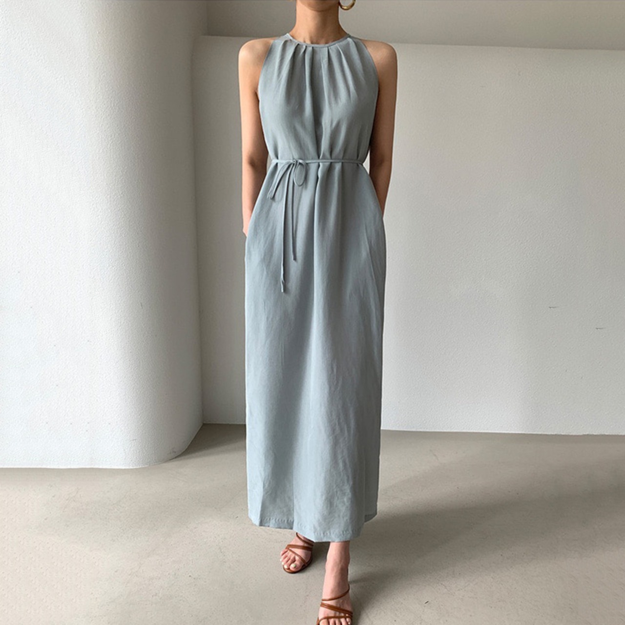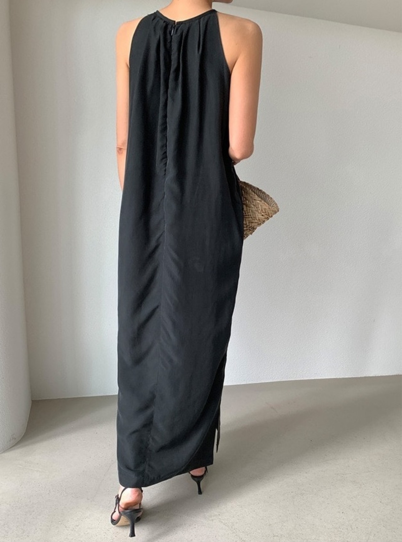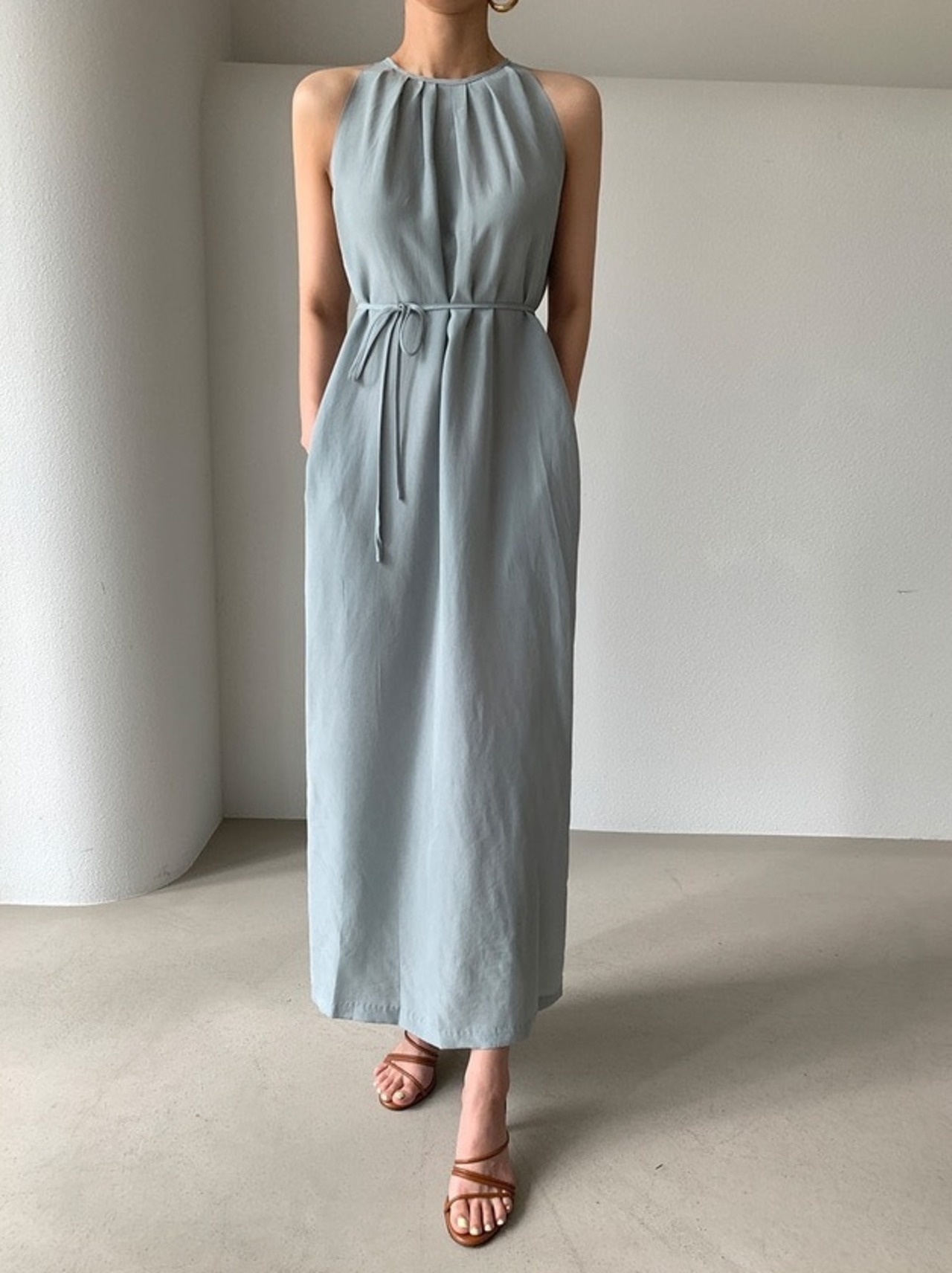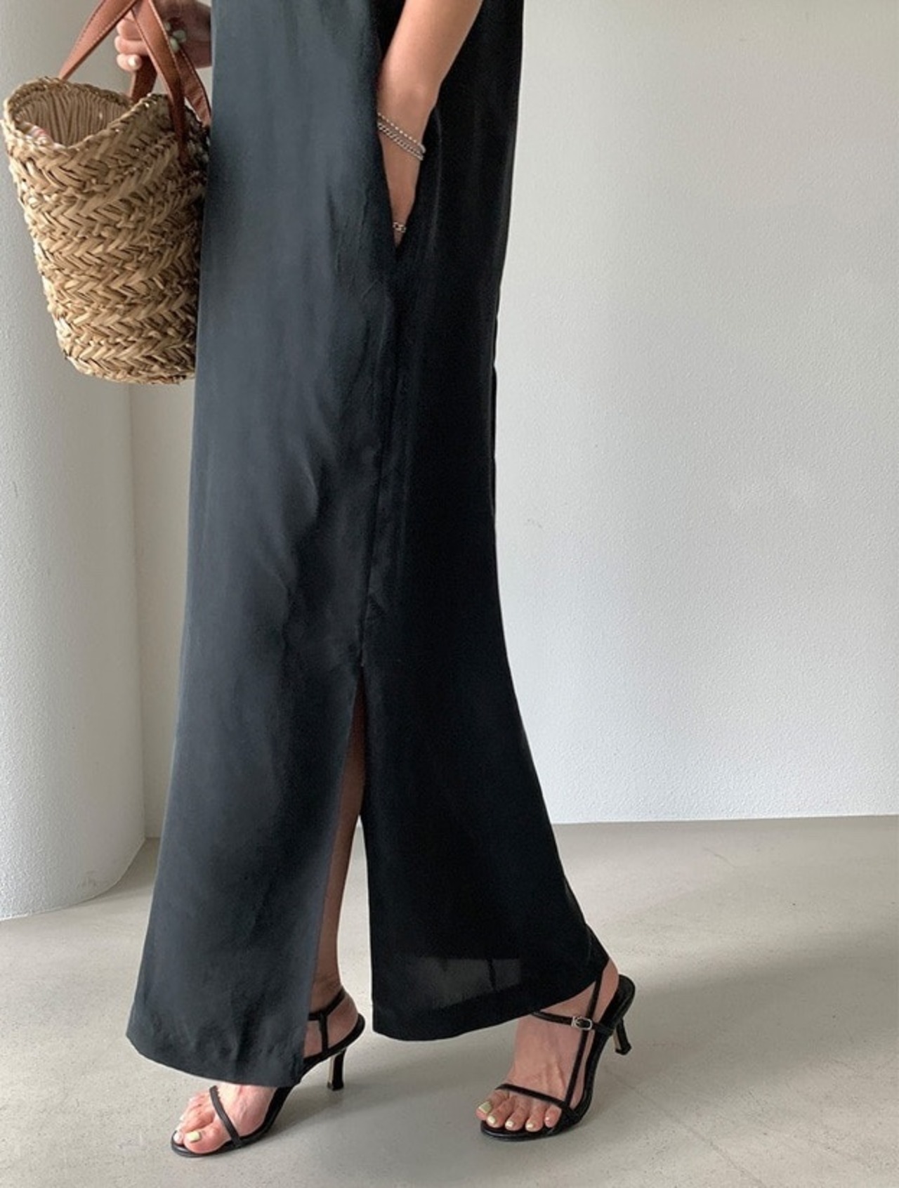 ロングワンピ ノースリワンピース ワンピ ノースリーブ ワントーン 無地 スリット ウエストリボン ロング きれいめ シンプル デート 韓国ファッション 2color