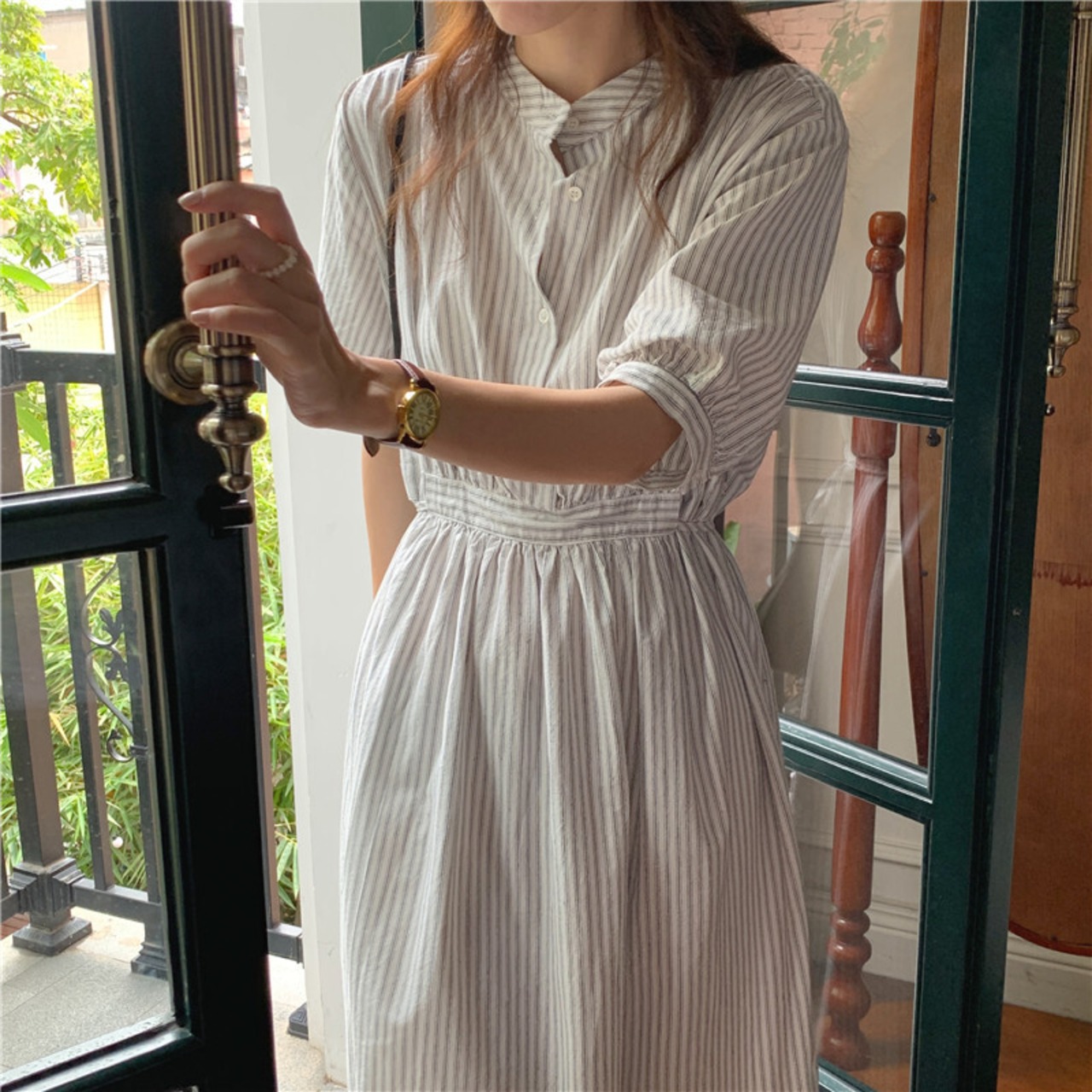 ストライプシャツワンピース ワンピ シャツワンピ 半袖 ロング シンプル カジュアル きれいめ 韓国ファッション