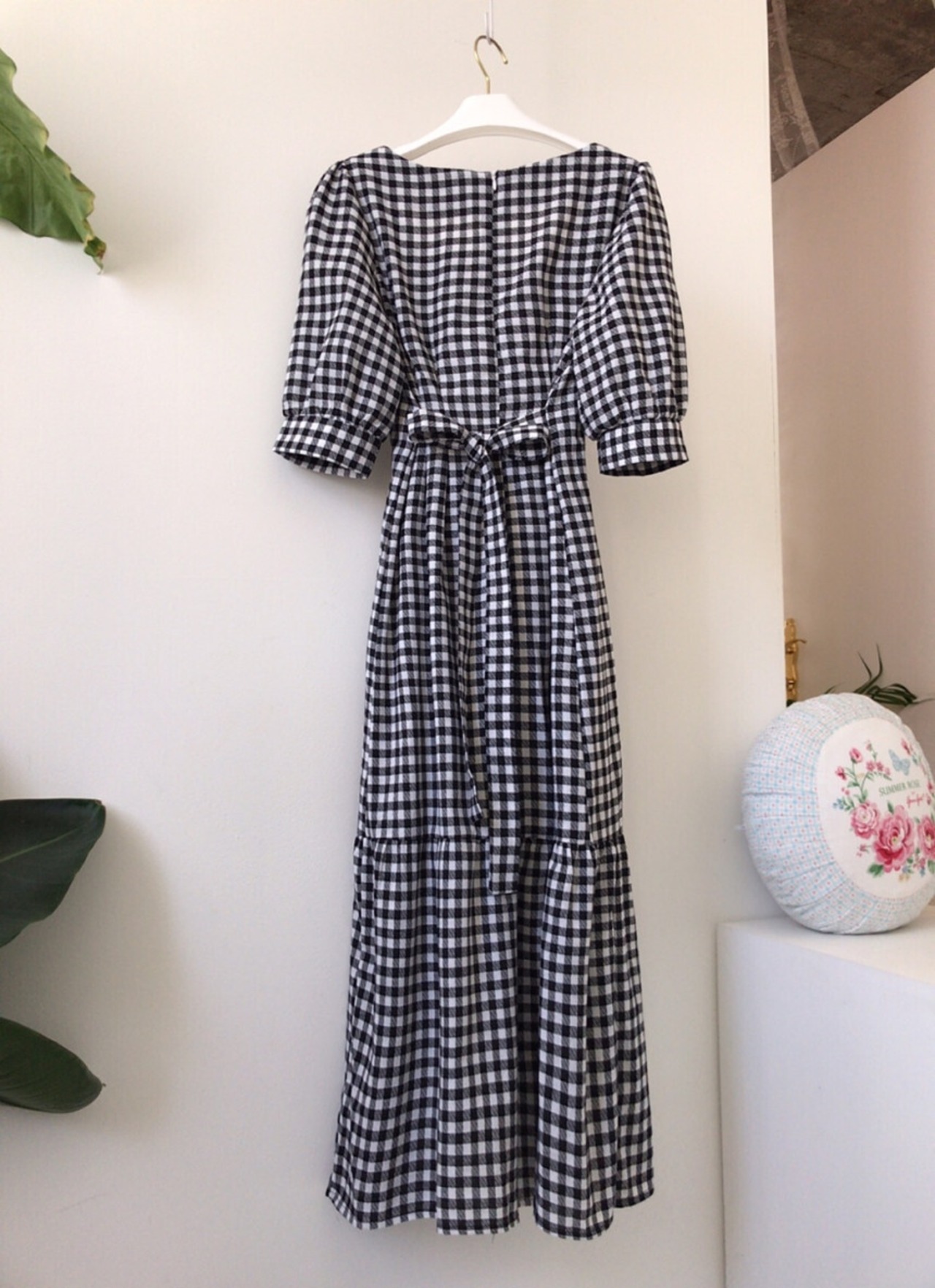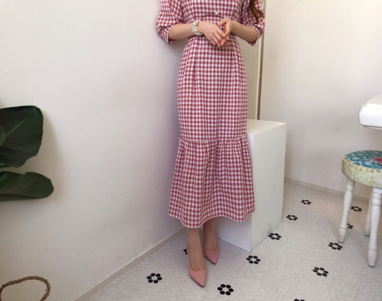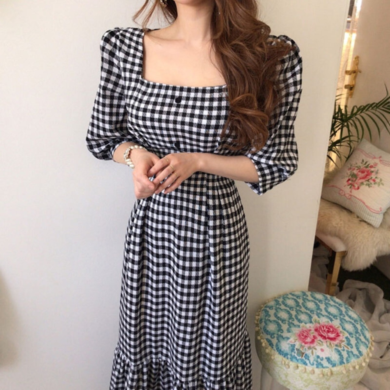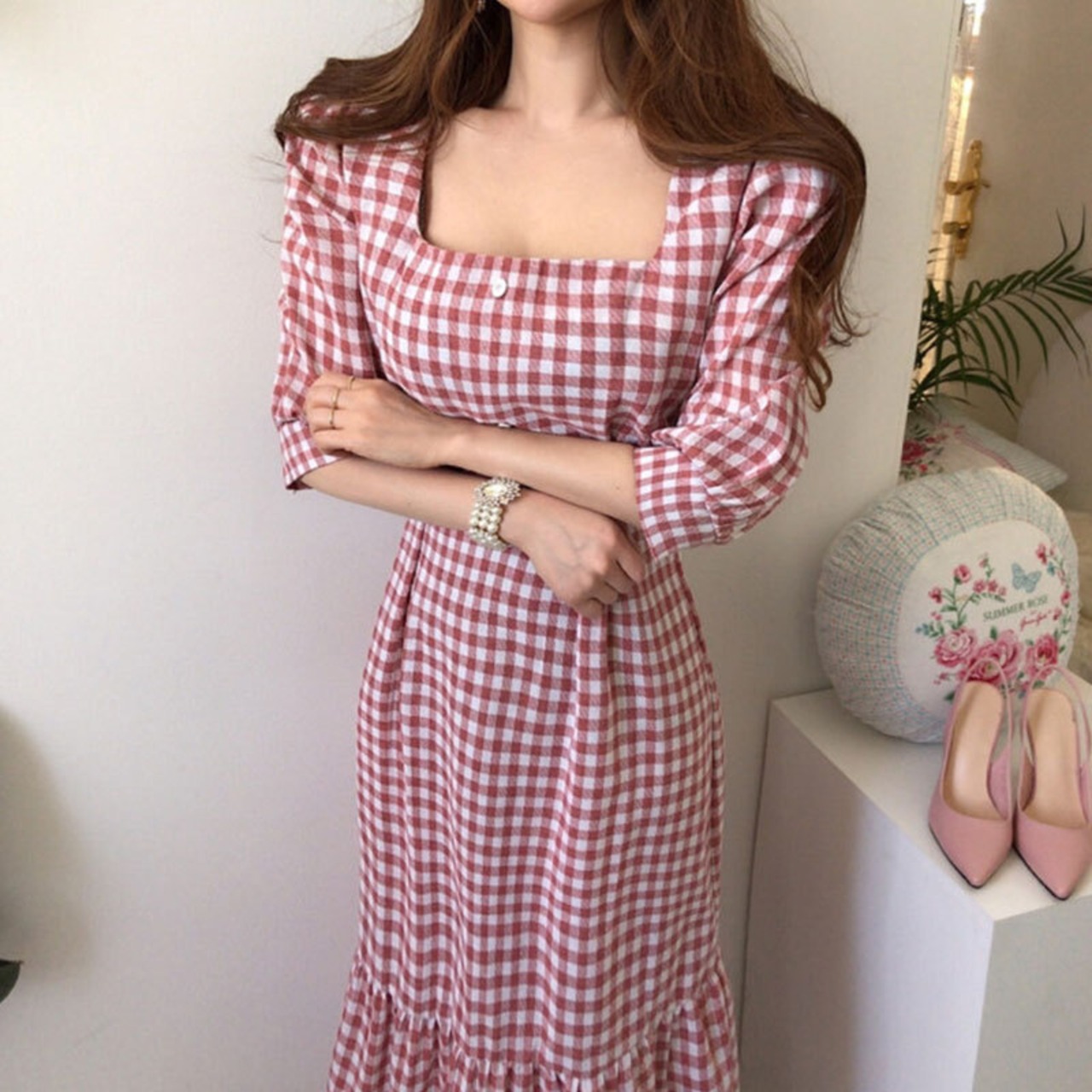 ギンガムワンピース ワンピース ロング ワンピ スクエアカラー ガーリー 大人可愛い レトロ 韓国ファッション 2color S-L