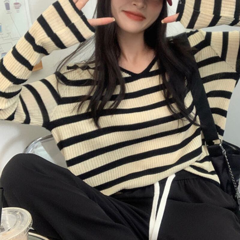 ボーダーストライプトップス 長袖 Vネック シンプル 大人可愛い レトロ 韓国ファッション 3color