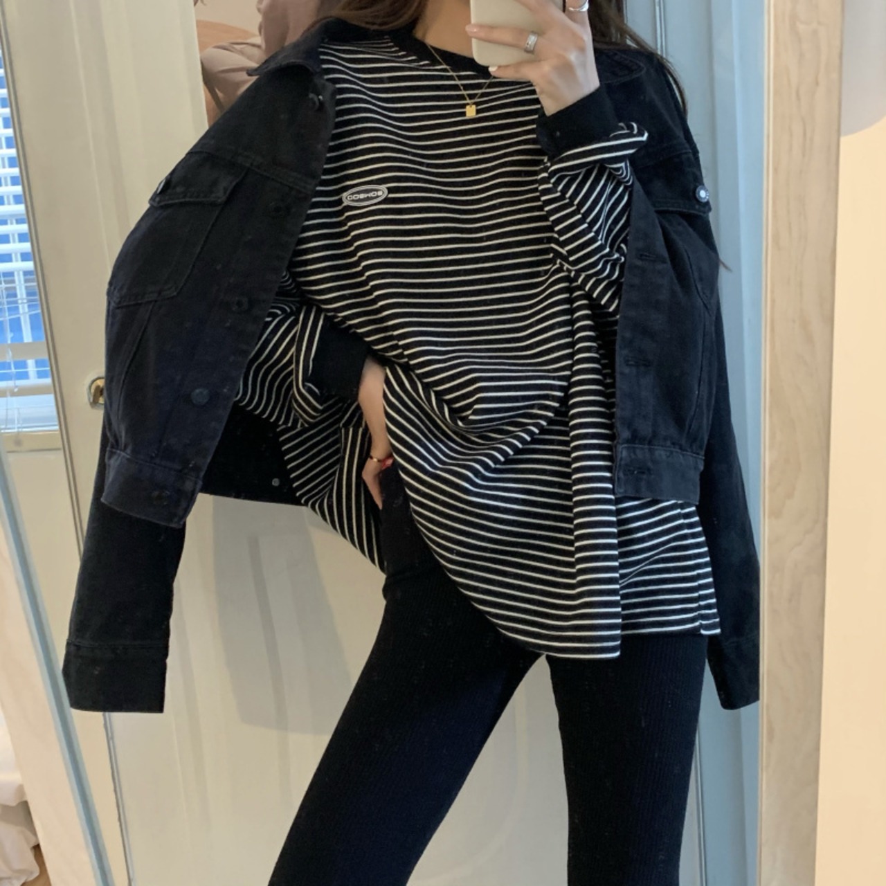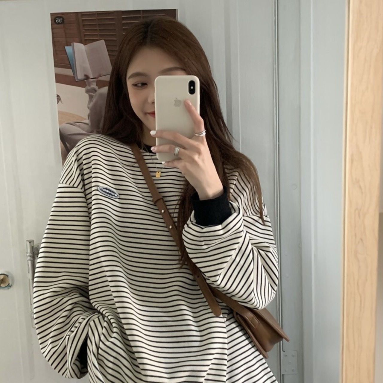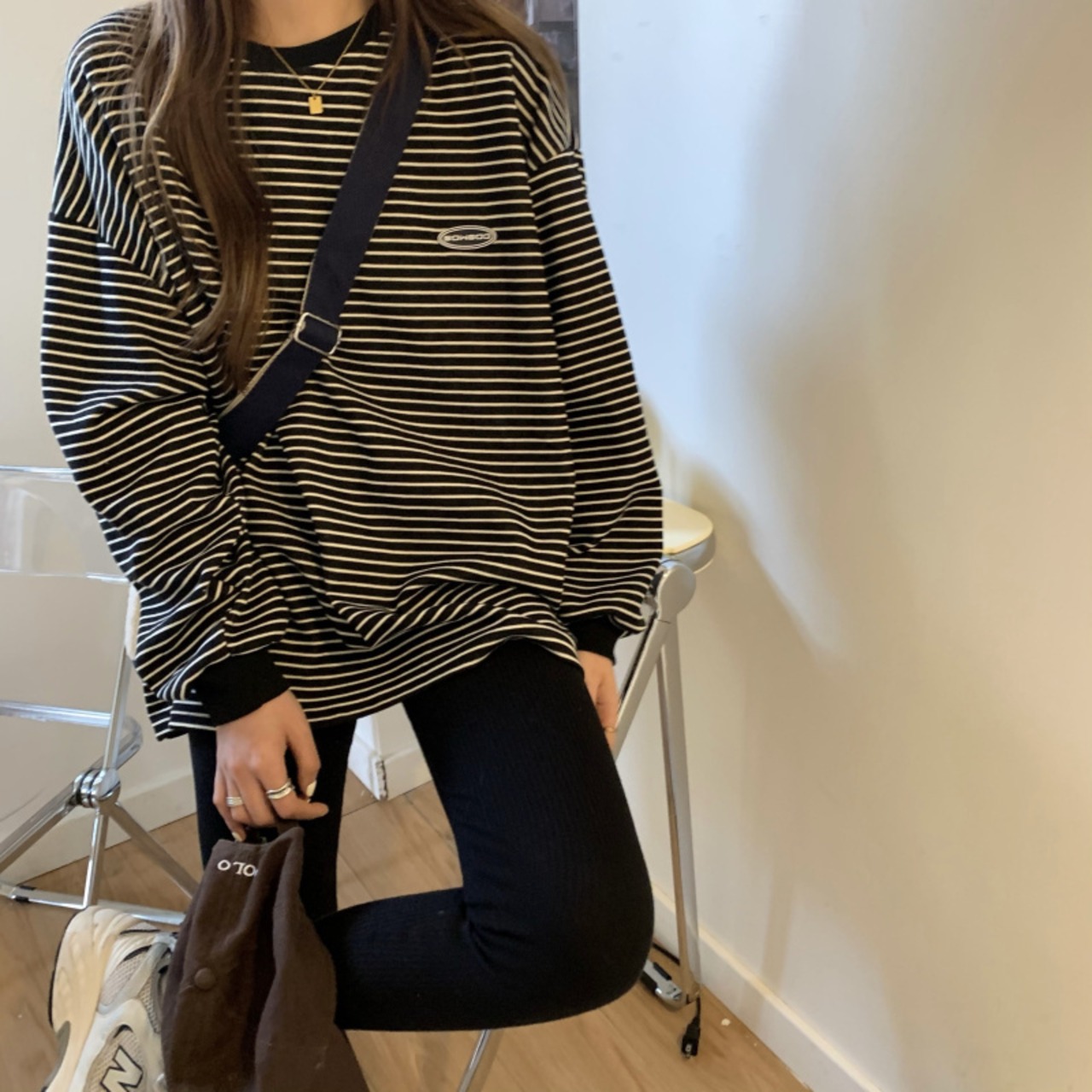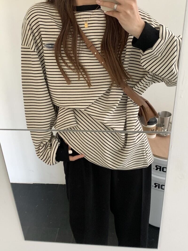 ウィンドストライプ 長袖 ウェスペンスレディース 秋 リラックス ラウンドカラー 韓国ファッション