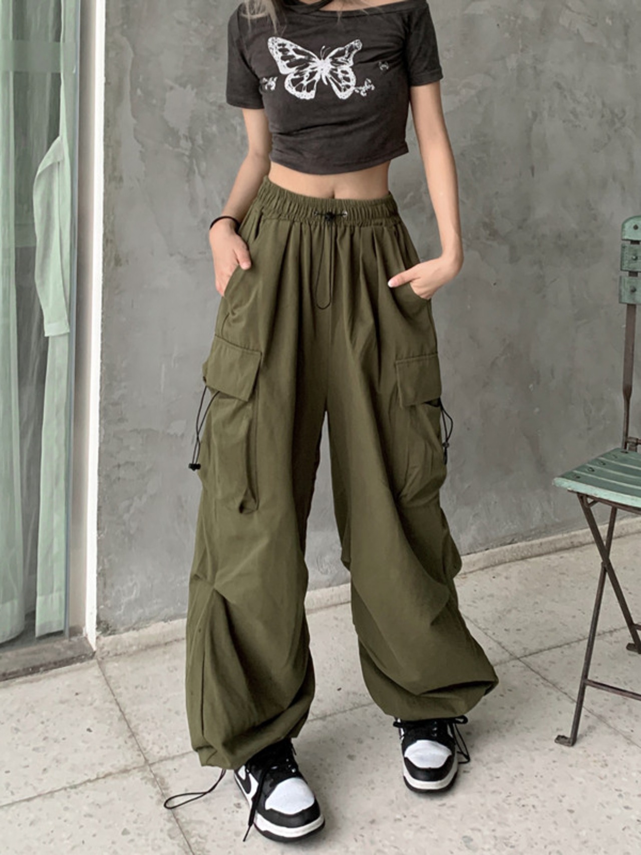 カーゴパンツ ロングパンツ ルーズ ワイドレッグ ボトム ハイウエスト ポケット付き シンプル カジュアル 韓国ファッション 3color S-XL