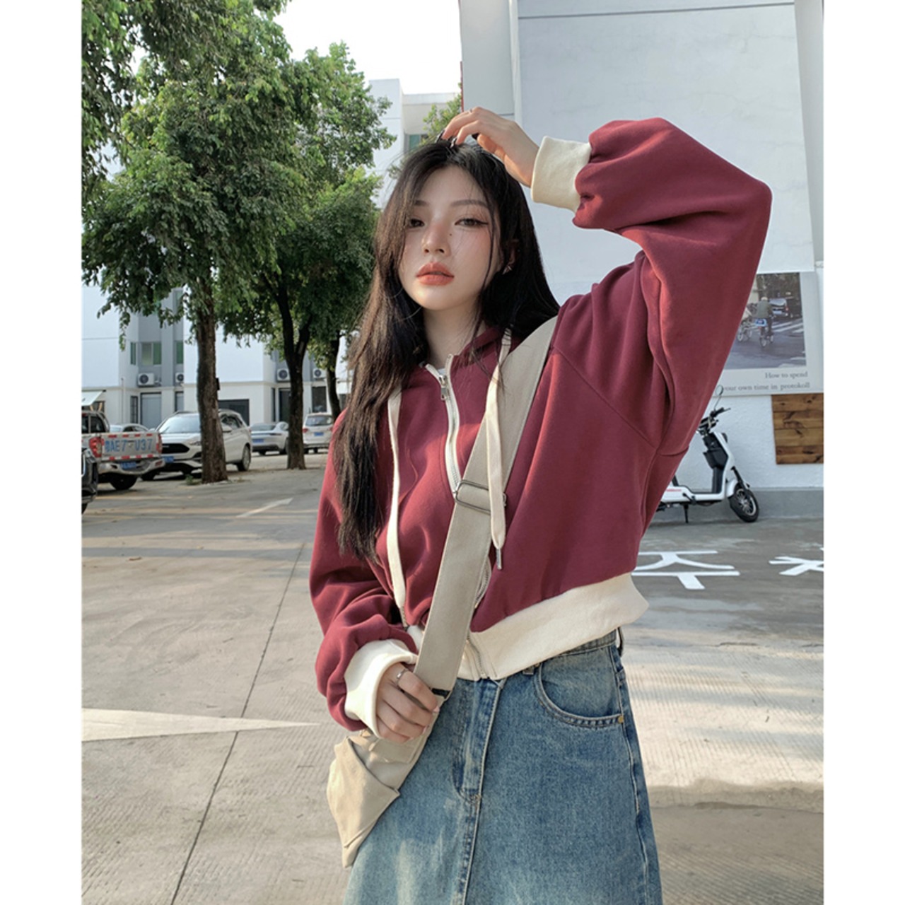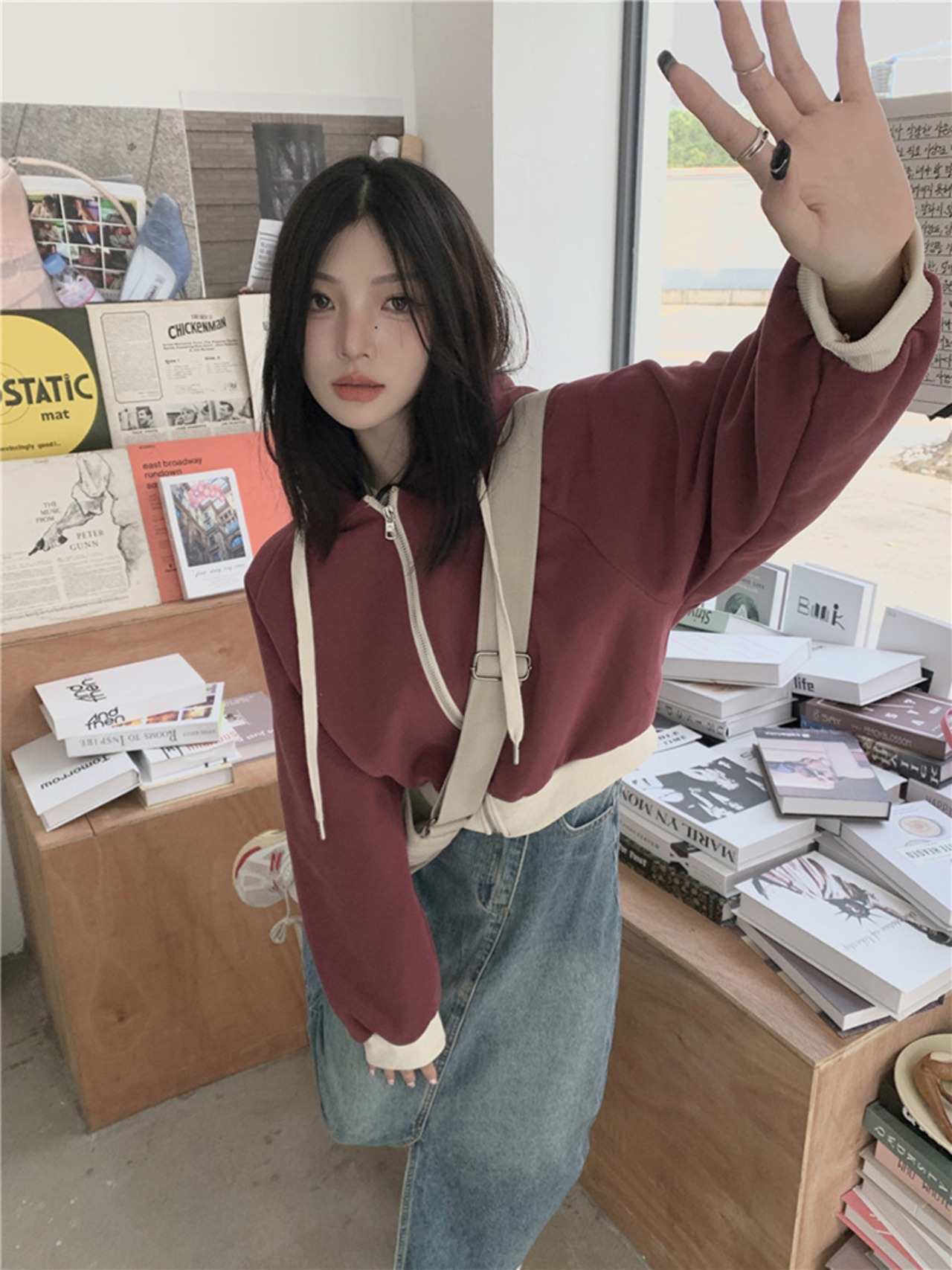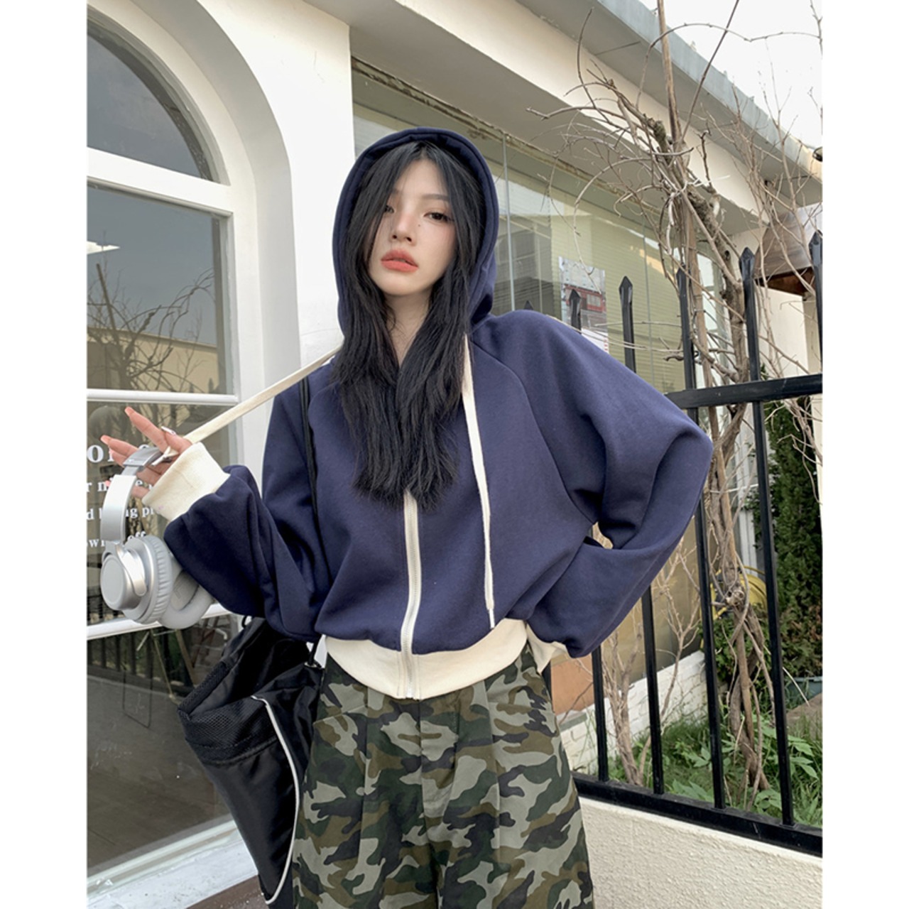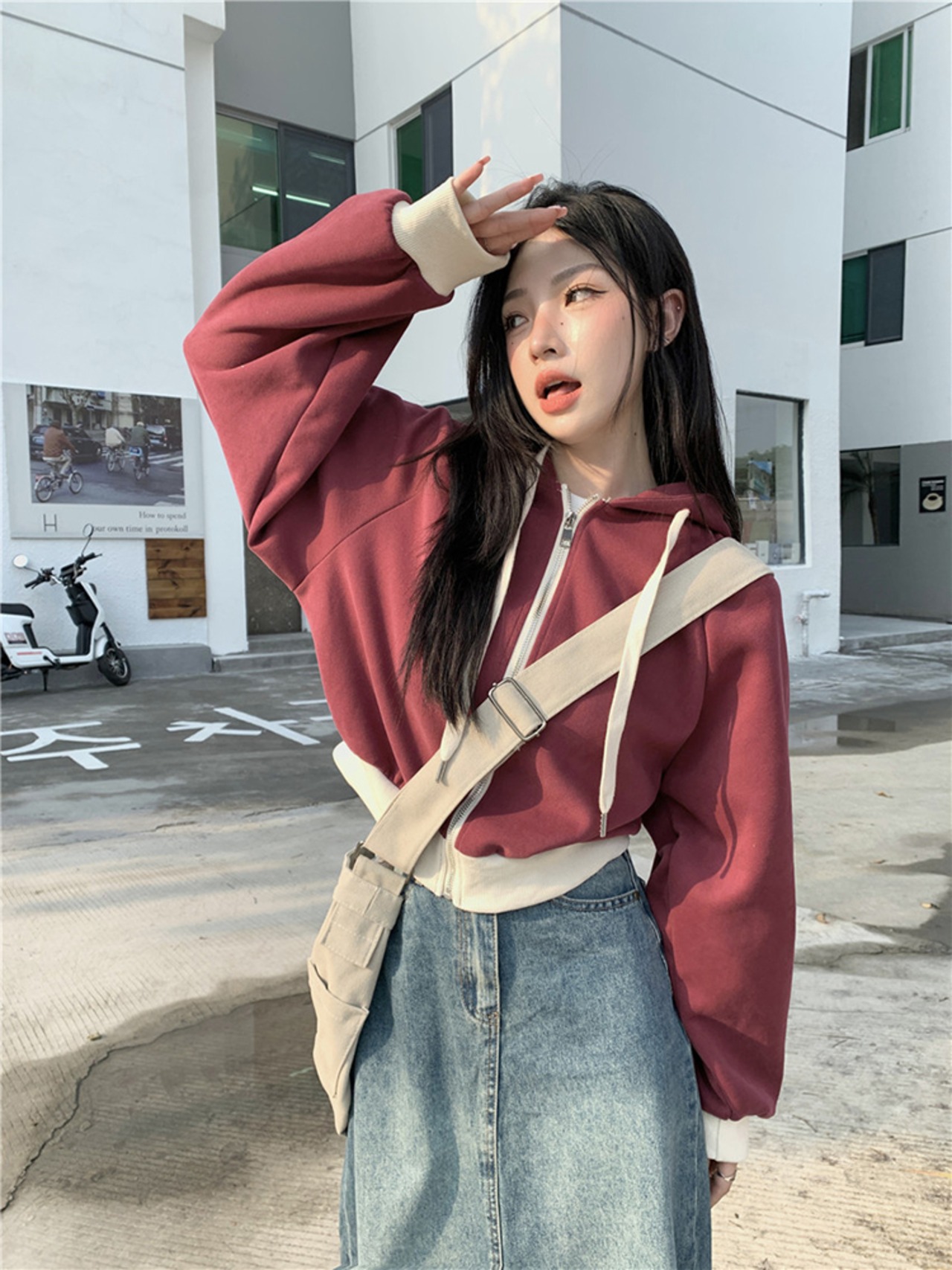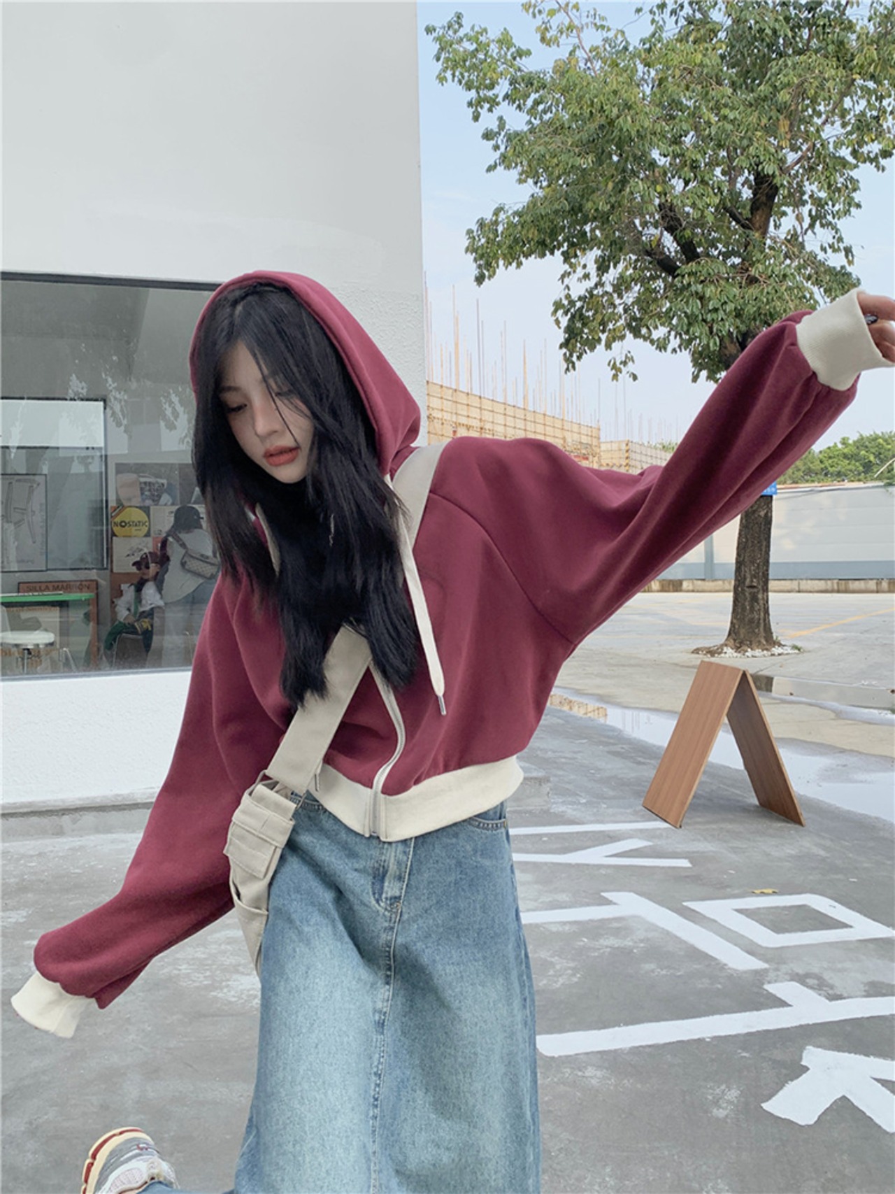 フード付きジップパーカー トップス ルーズ 長袖 ショート トレンド カジュアル レトロ 韓国ファッション 2color