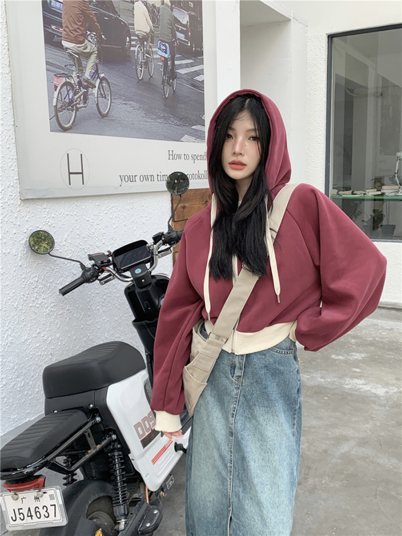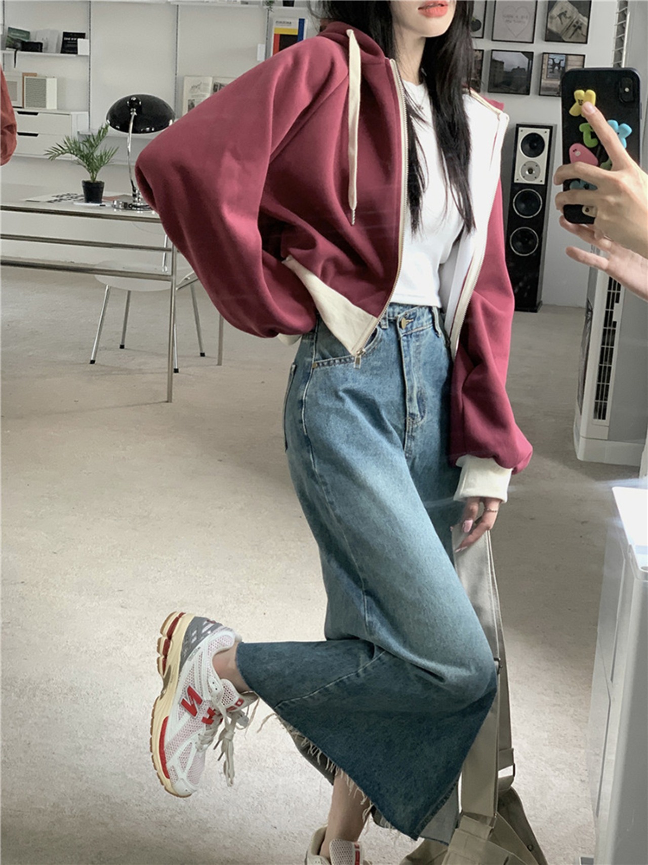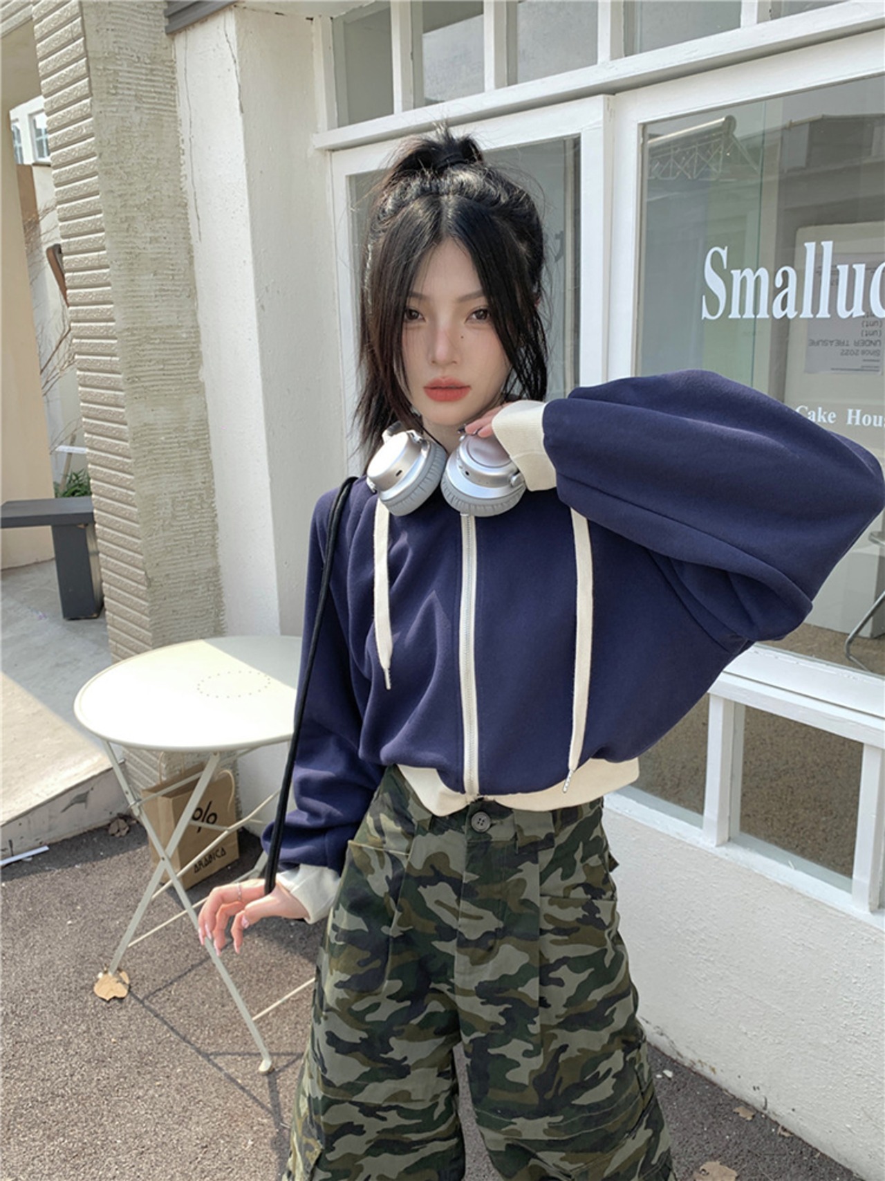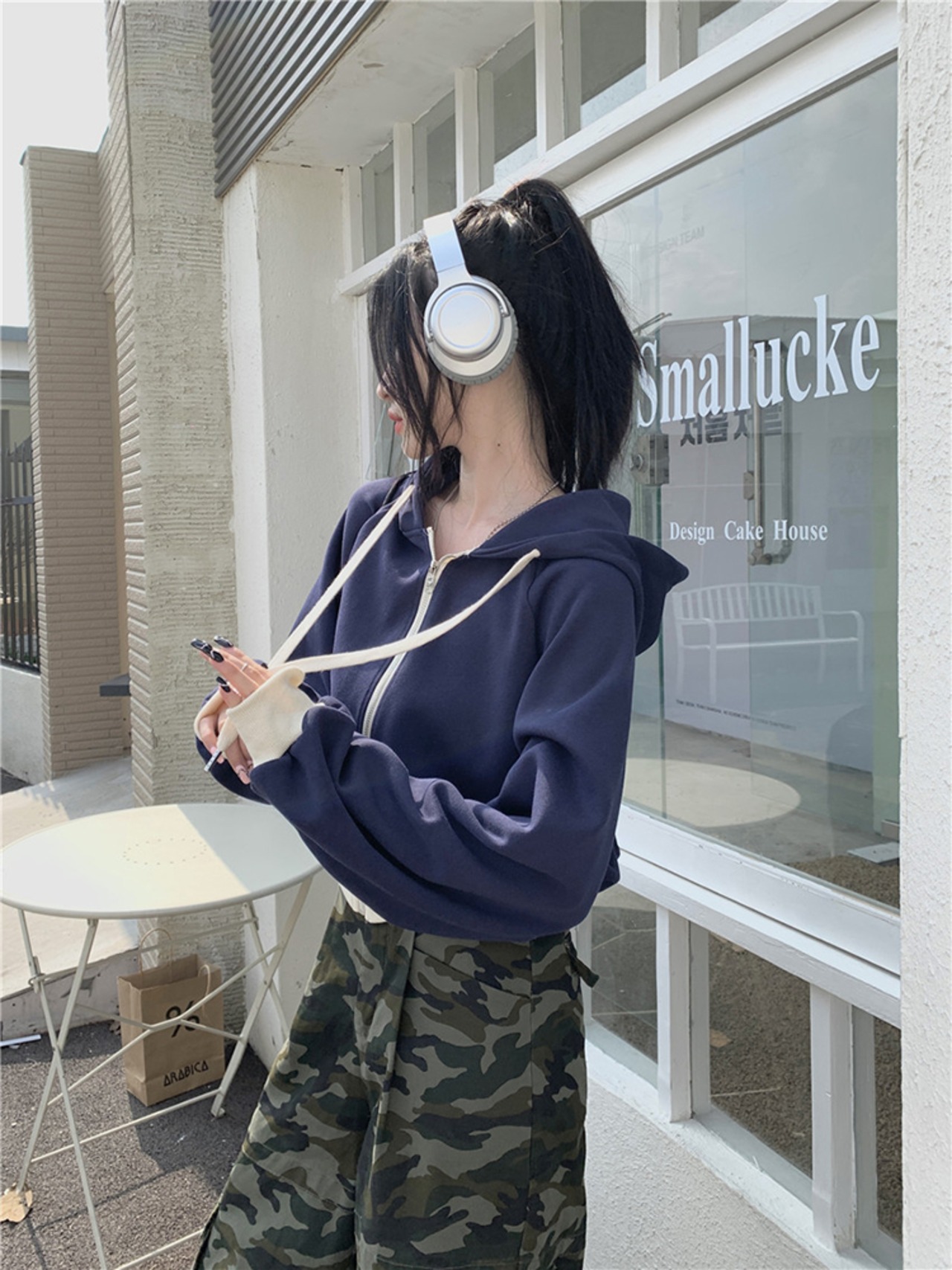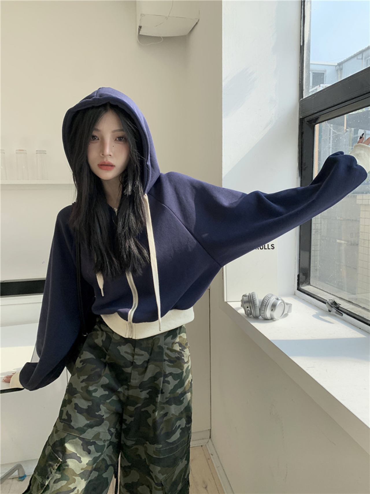 フード付きジップパーカー トップス ルーズ 長袖 ショート トレンド カジュアル レトロ 韓国ファッション 2color