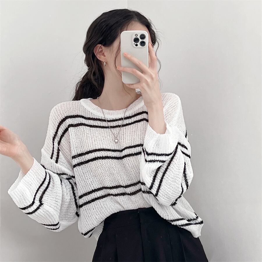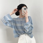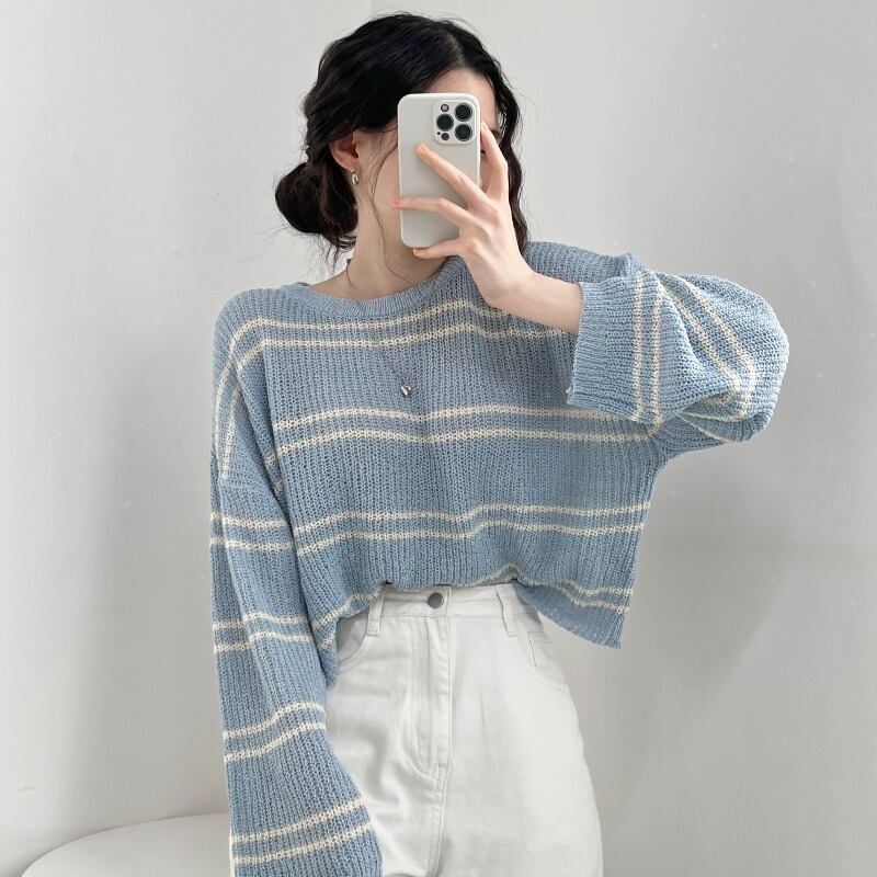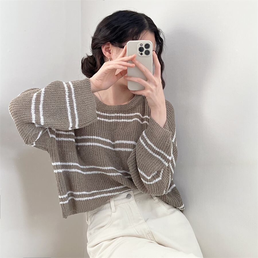 ボーダーストライプトップス トップス ショート ミニ ニット 長袖 カジュアル シンプル 韓国ファッション 4color